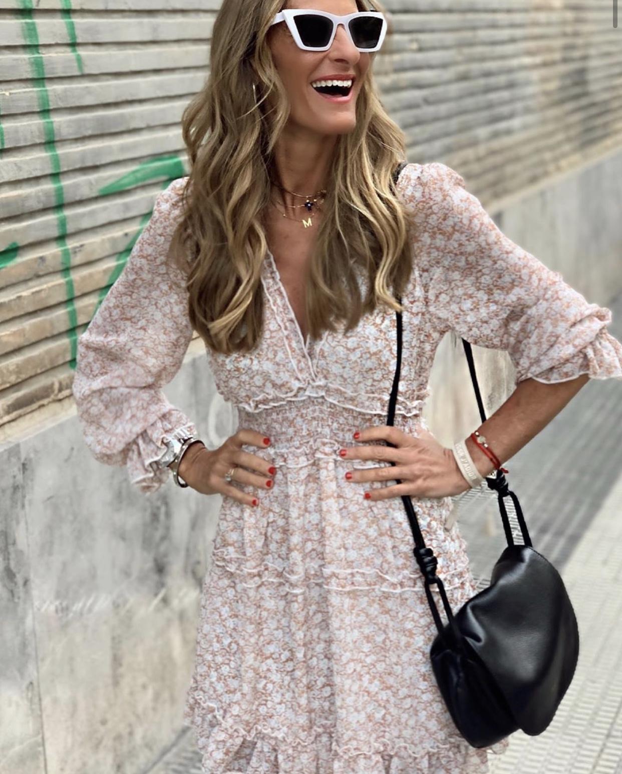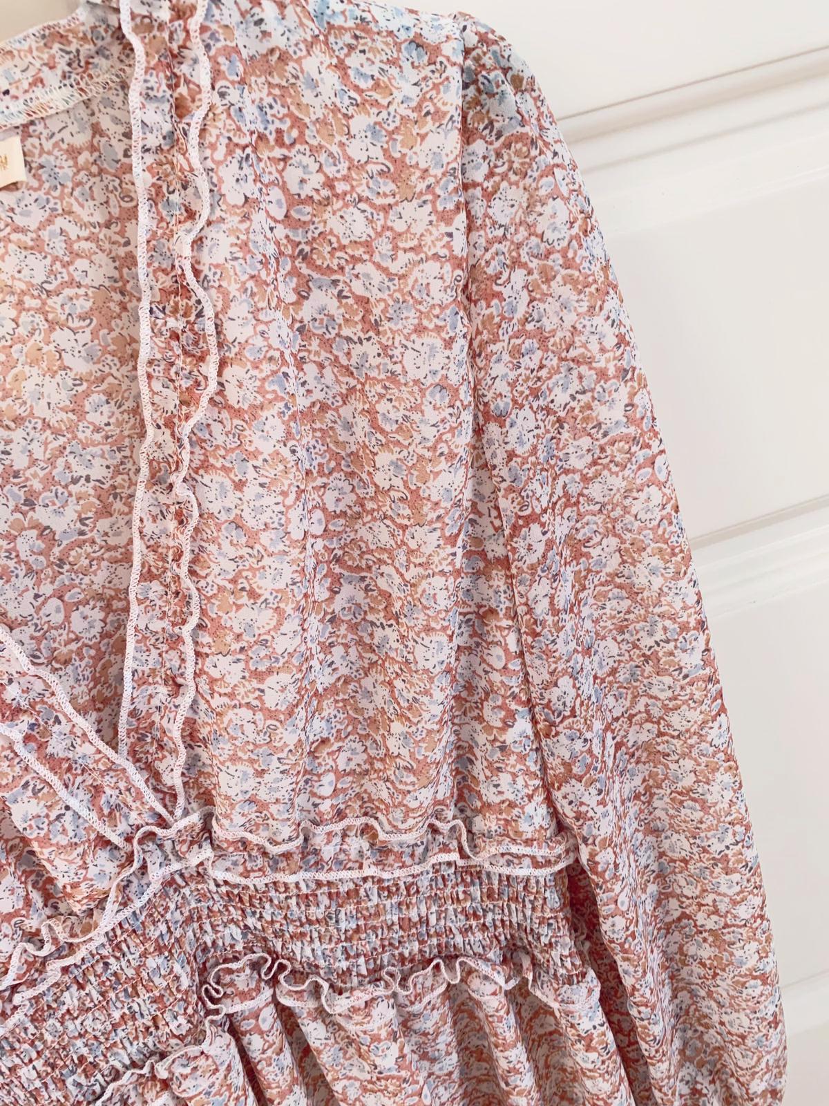 Una monada de vestido de gasa con forro, escote en pico y mini volantes.