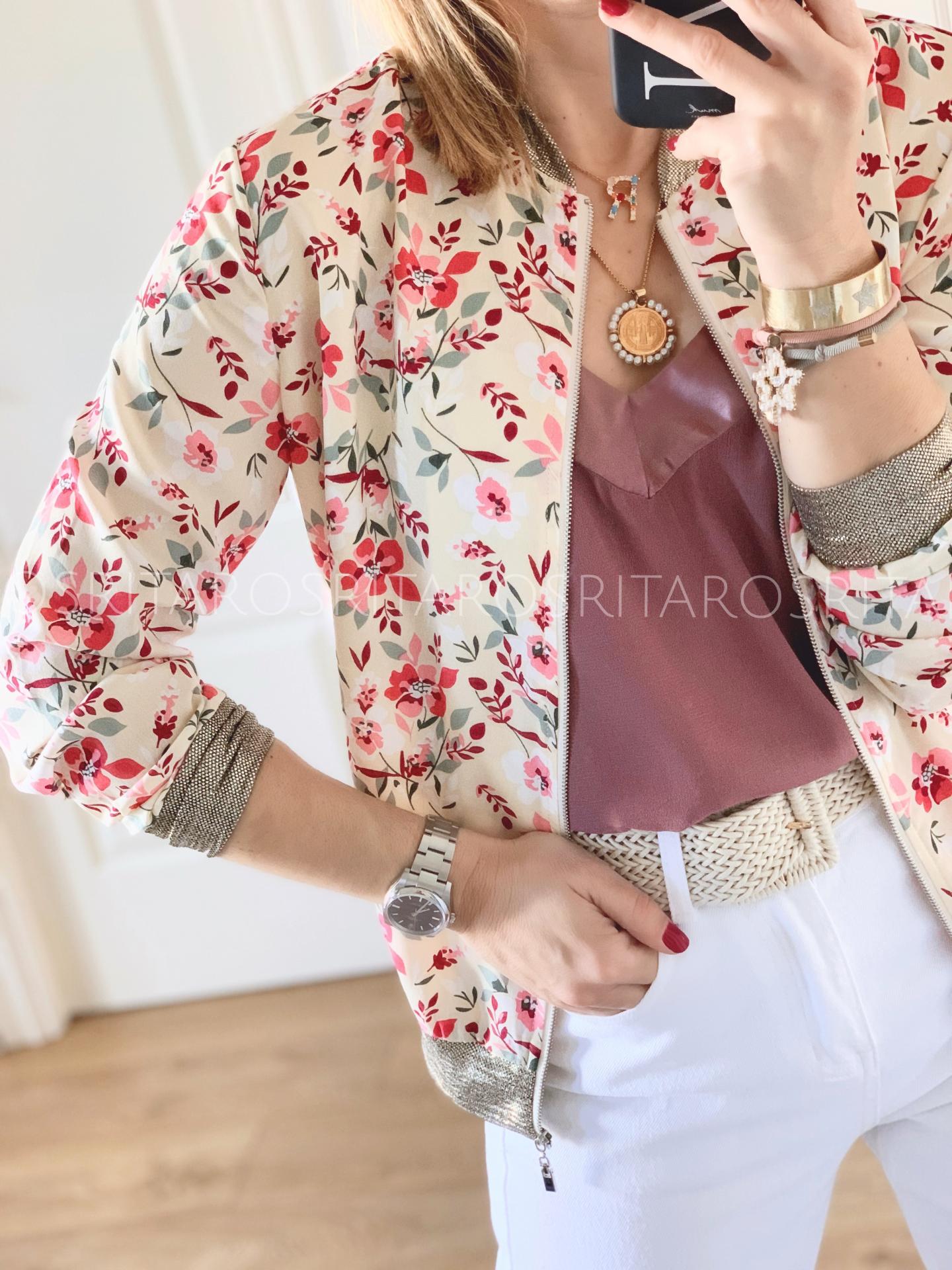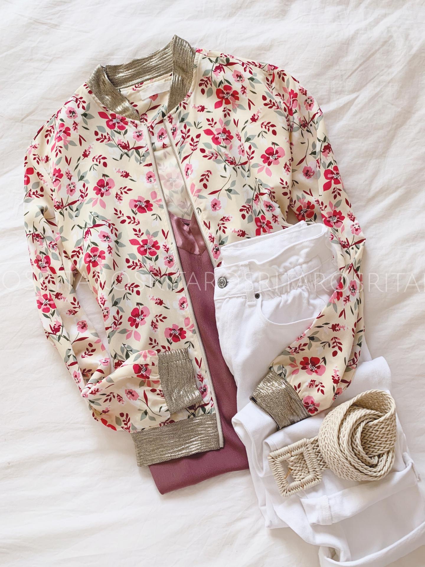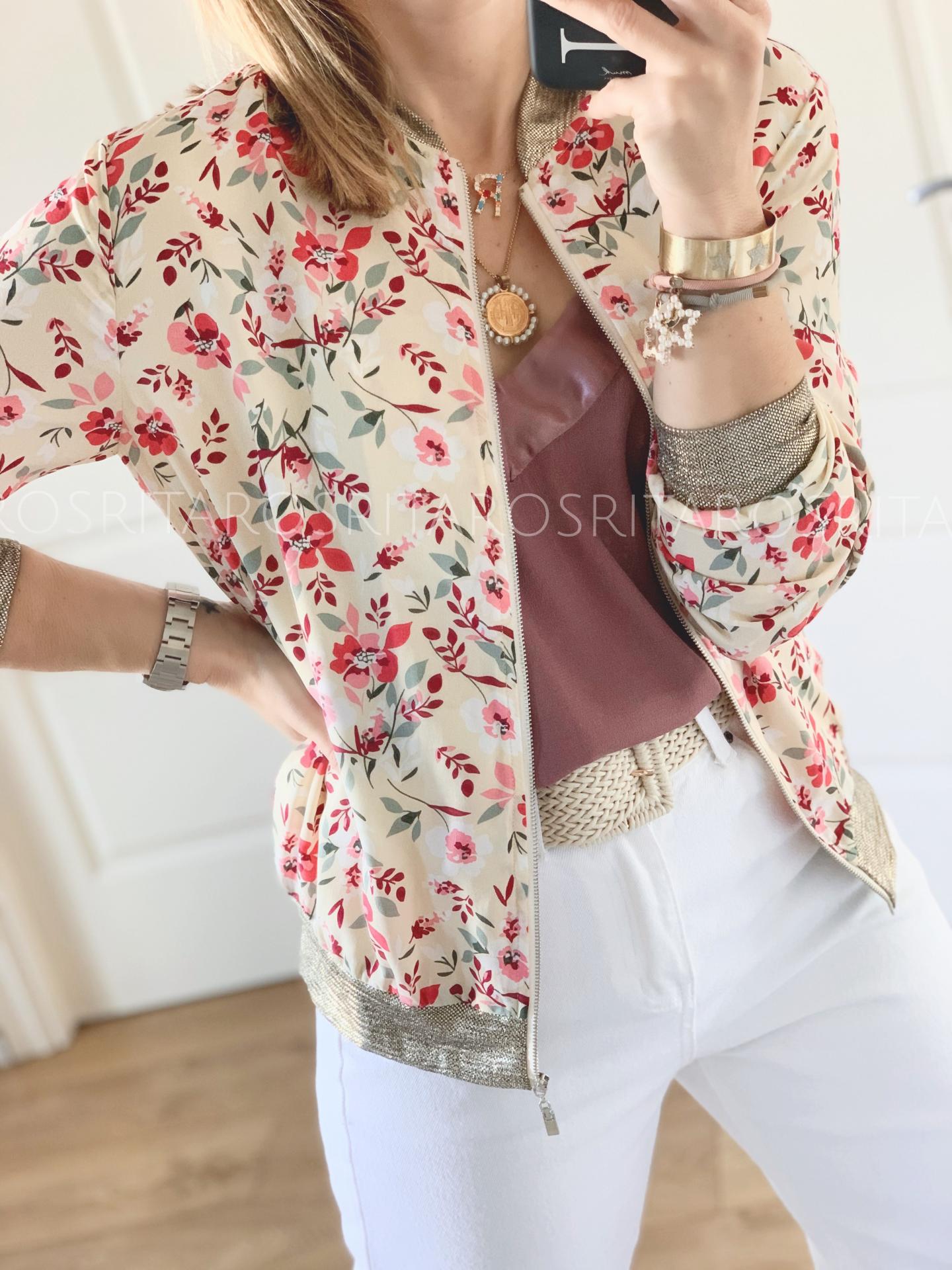 Nueva bomber con un estampado monísimo y detalles dorados en cuello, mangas y bajos.