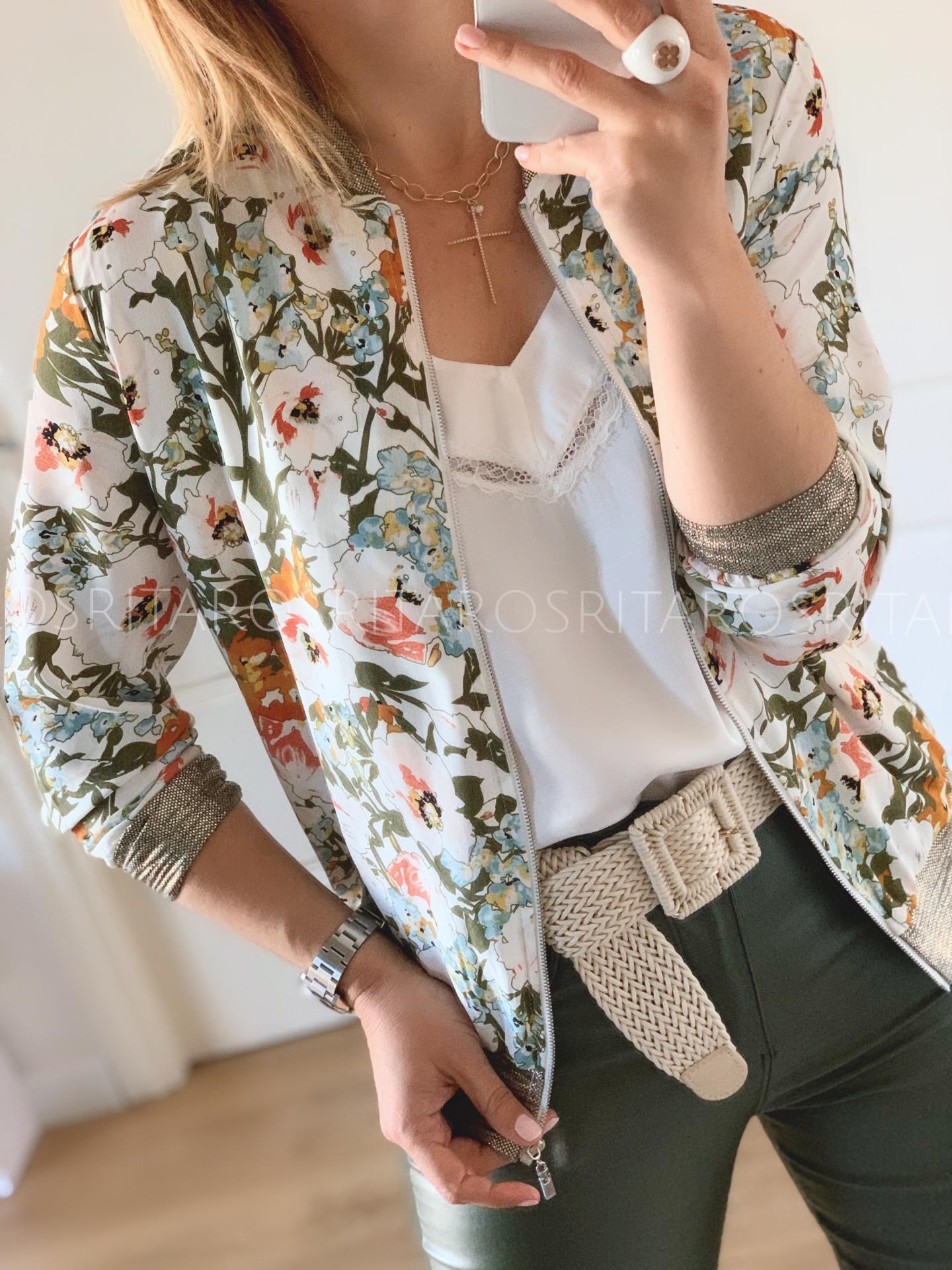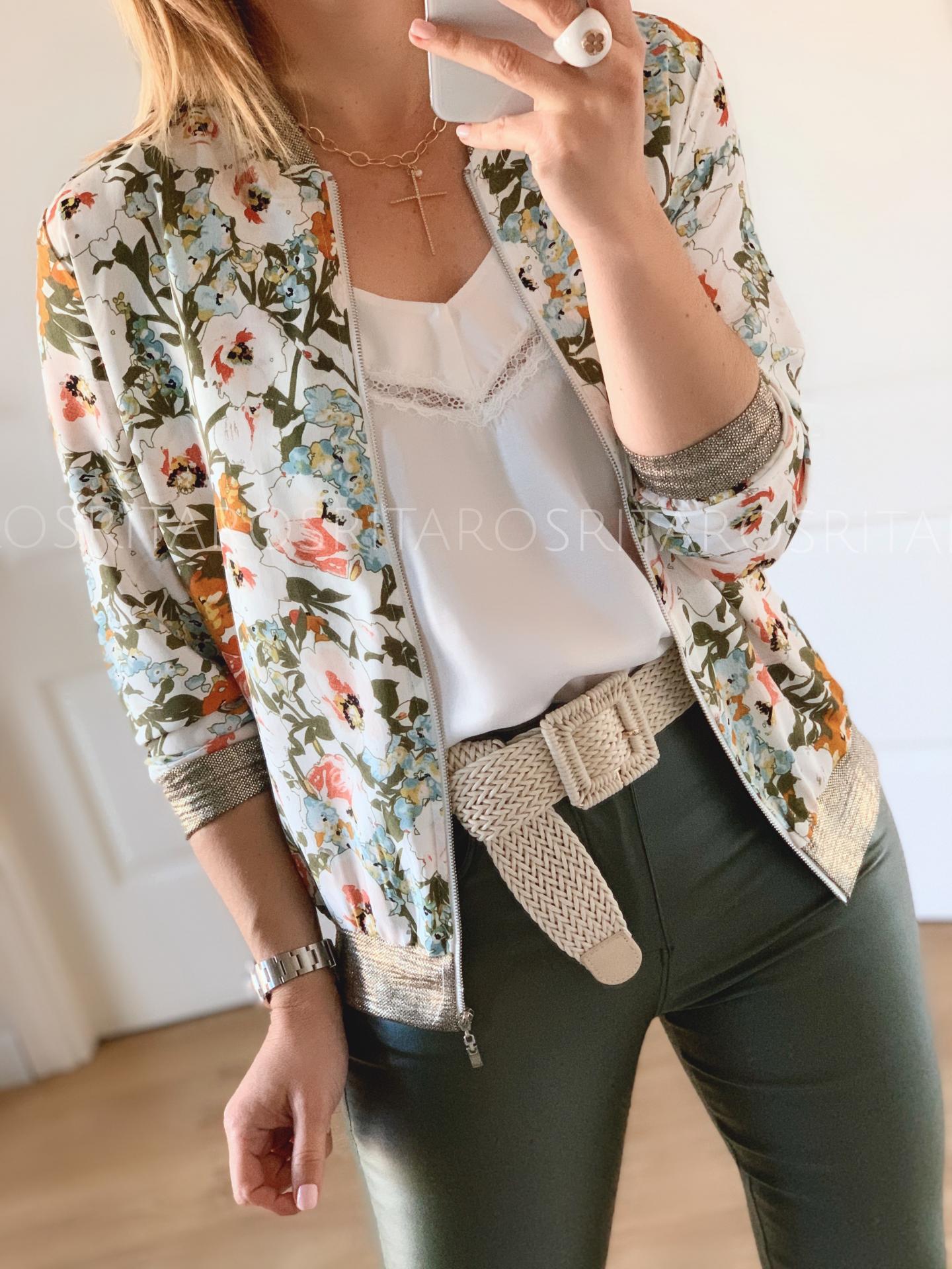 Nueva bomber con un estampado ideal que hemos combinado con el top Marta.