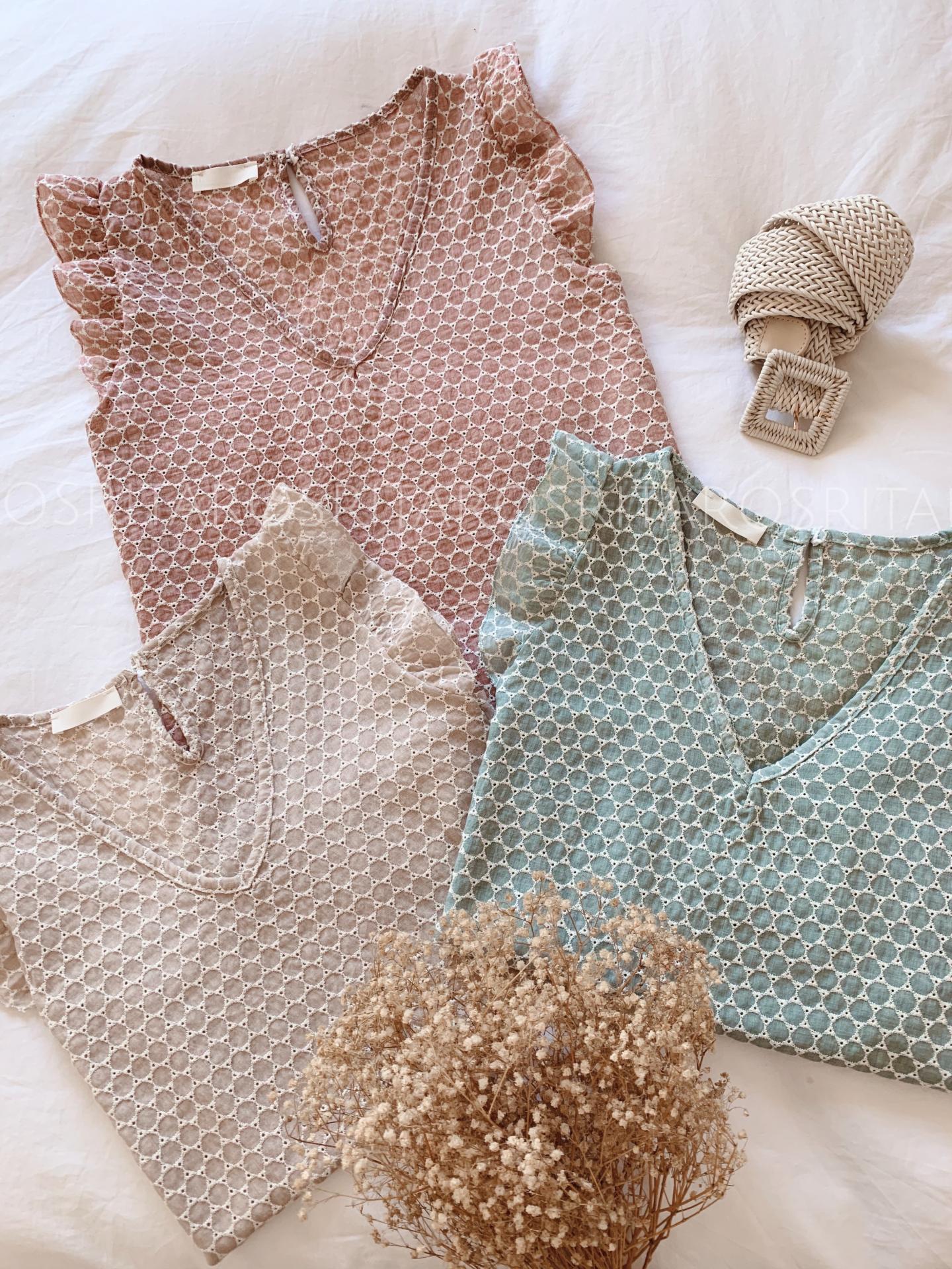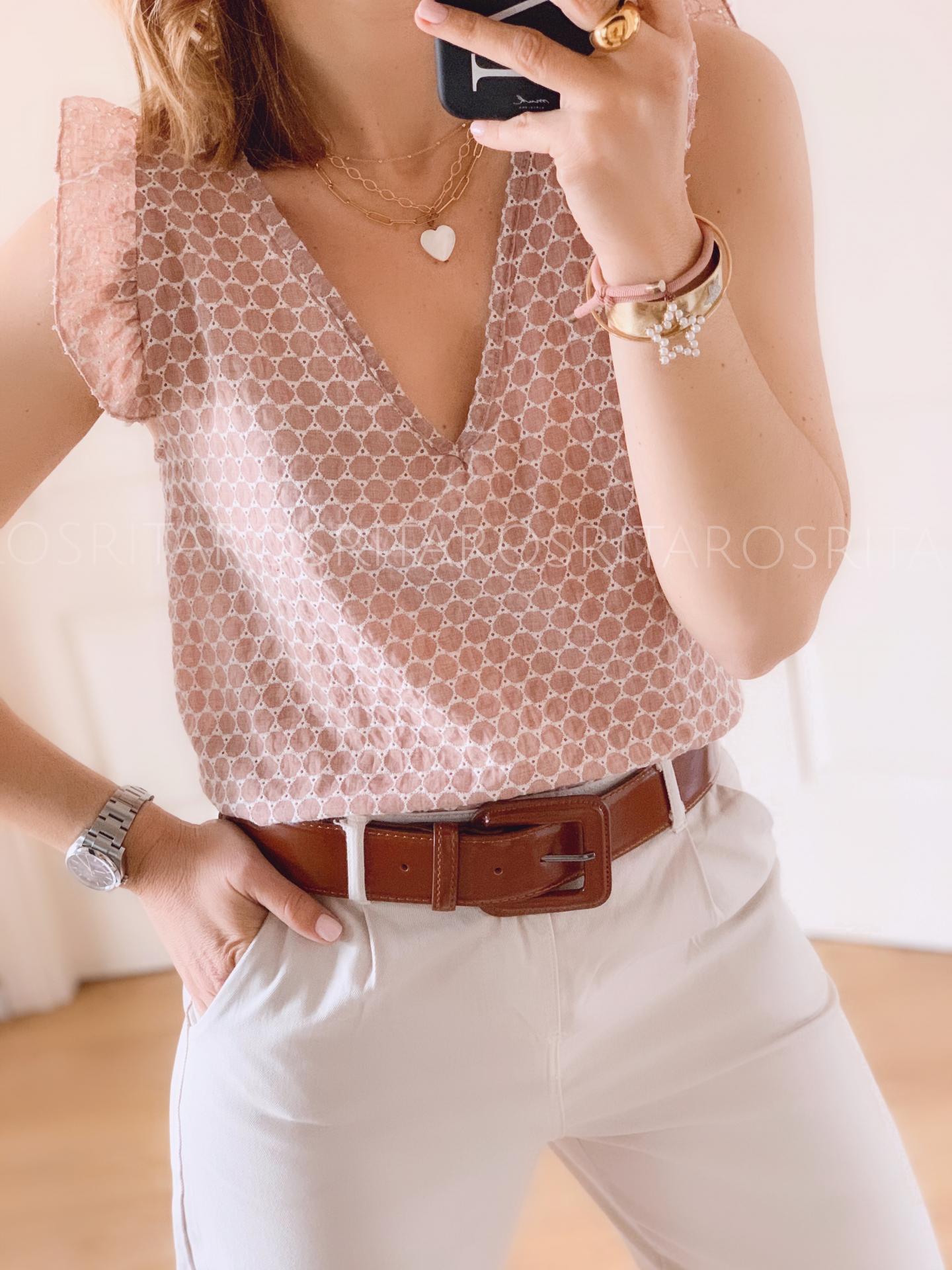 Nueva blusa bordada con detalle de volante en los hombros y escote en pico.