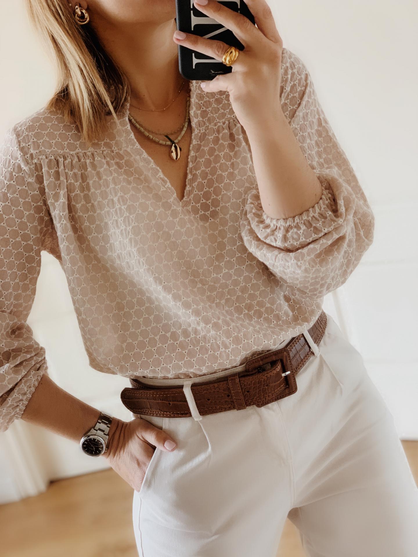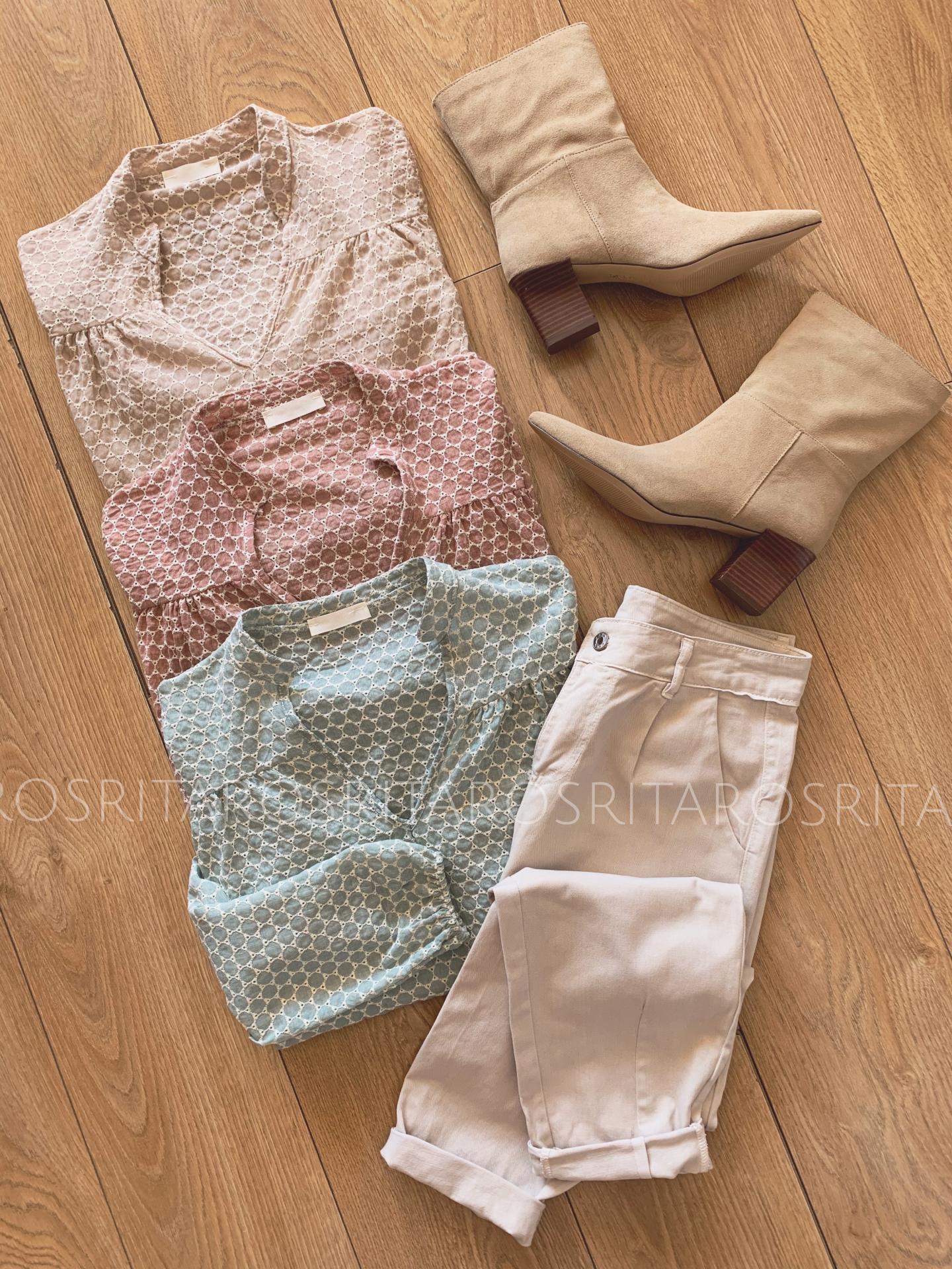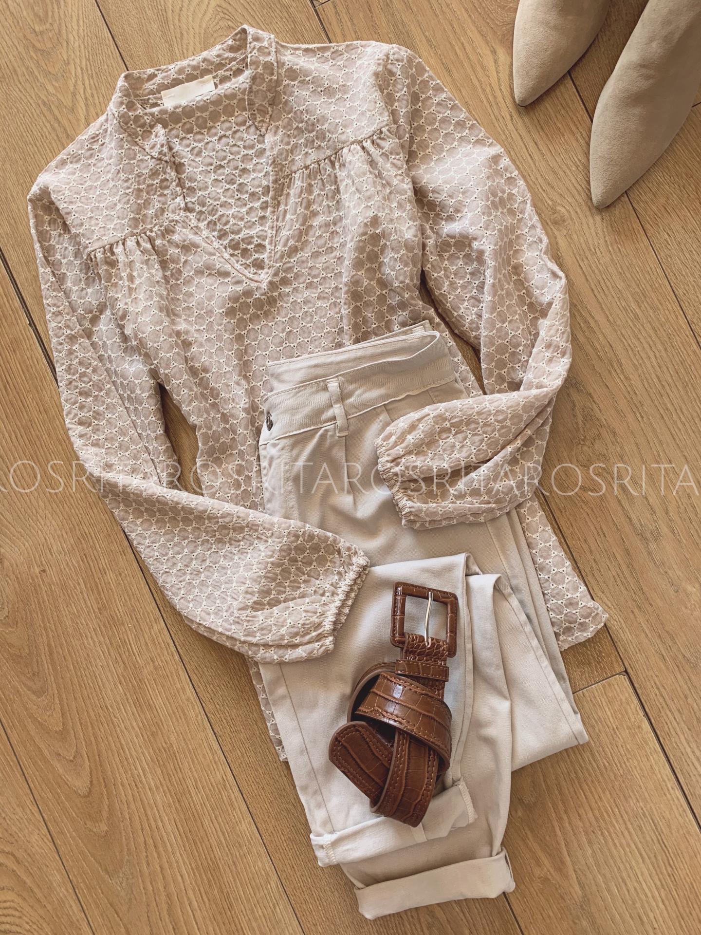 Nueva camisa en manga larga y cuello de pico con detalles bordados en el tejido.