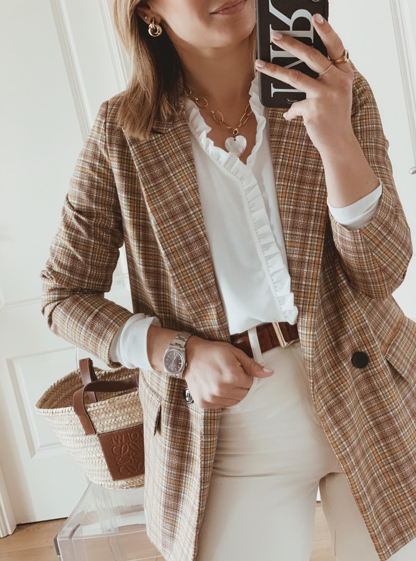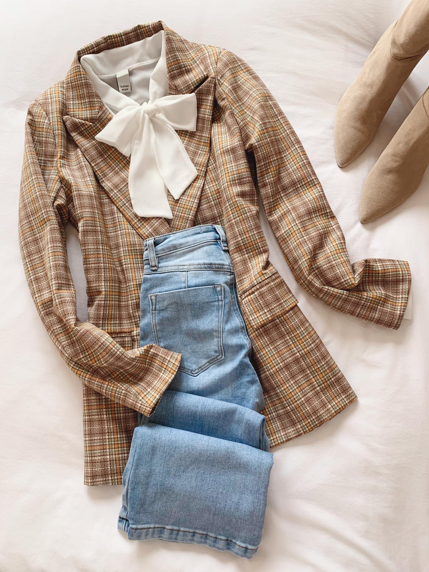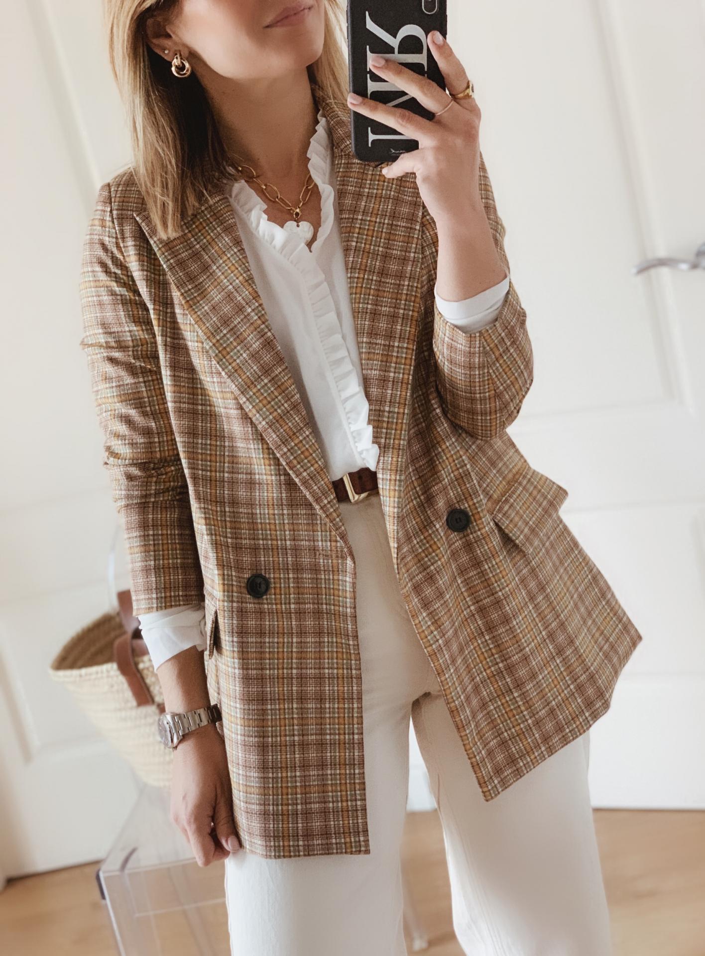 Nueva Blazer de corte recto con estampado de cuadros en colores camel, amarillo y verde agua.