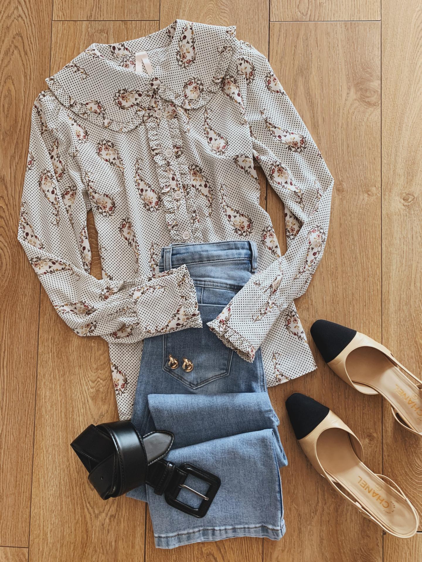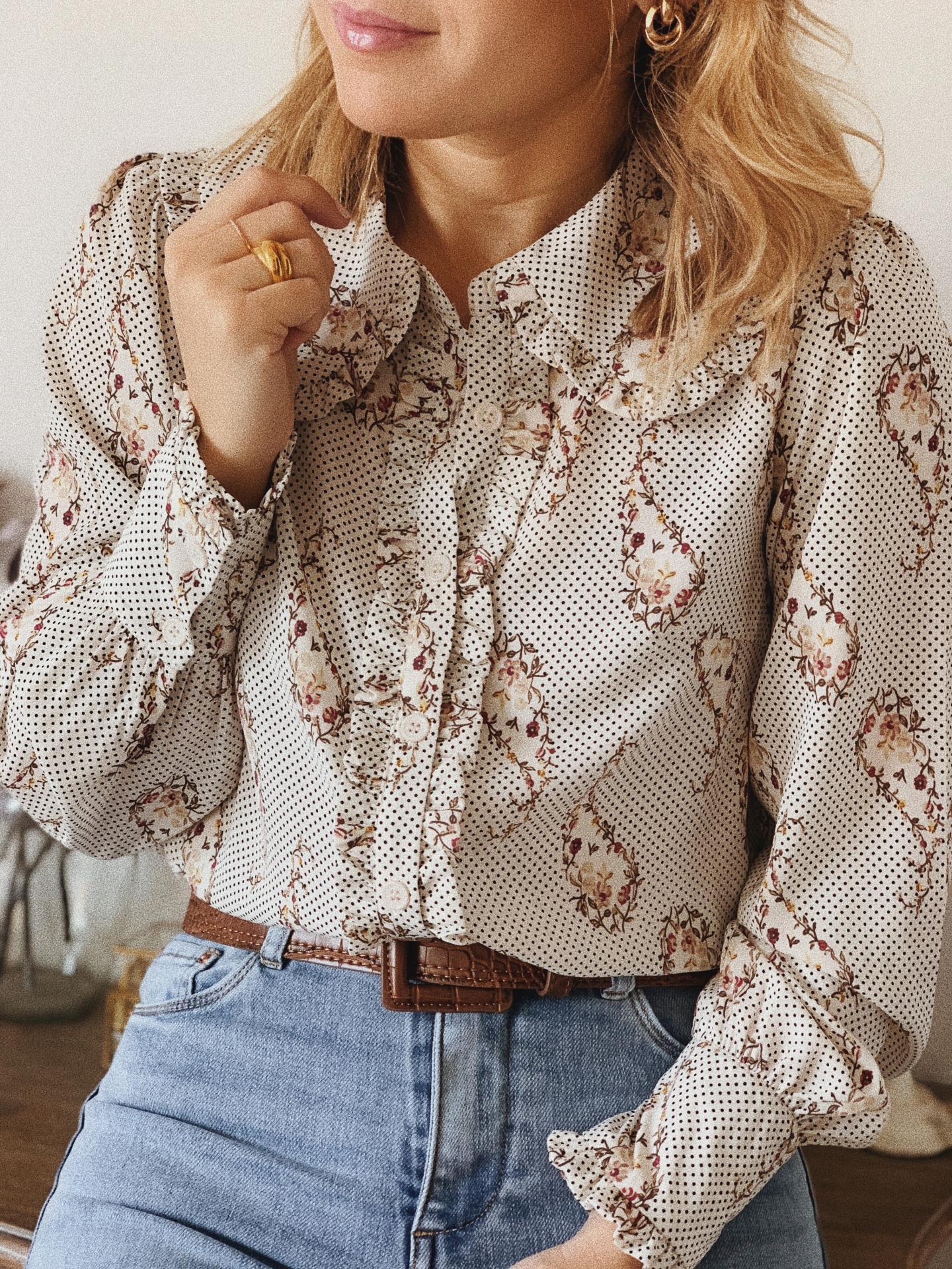 Nueva blusa con un tejido ideal con caída y estampado en cashmere y topos.