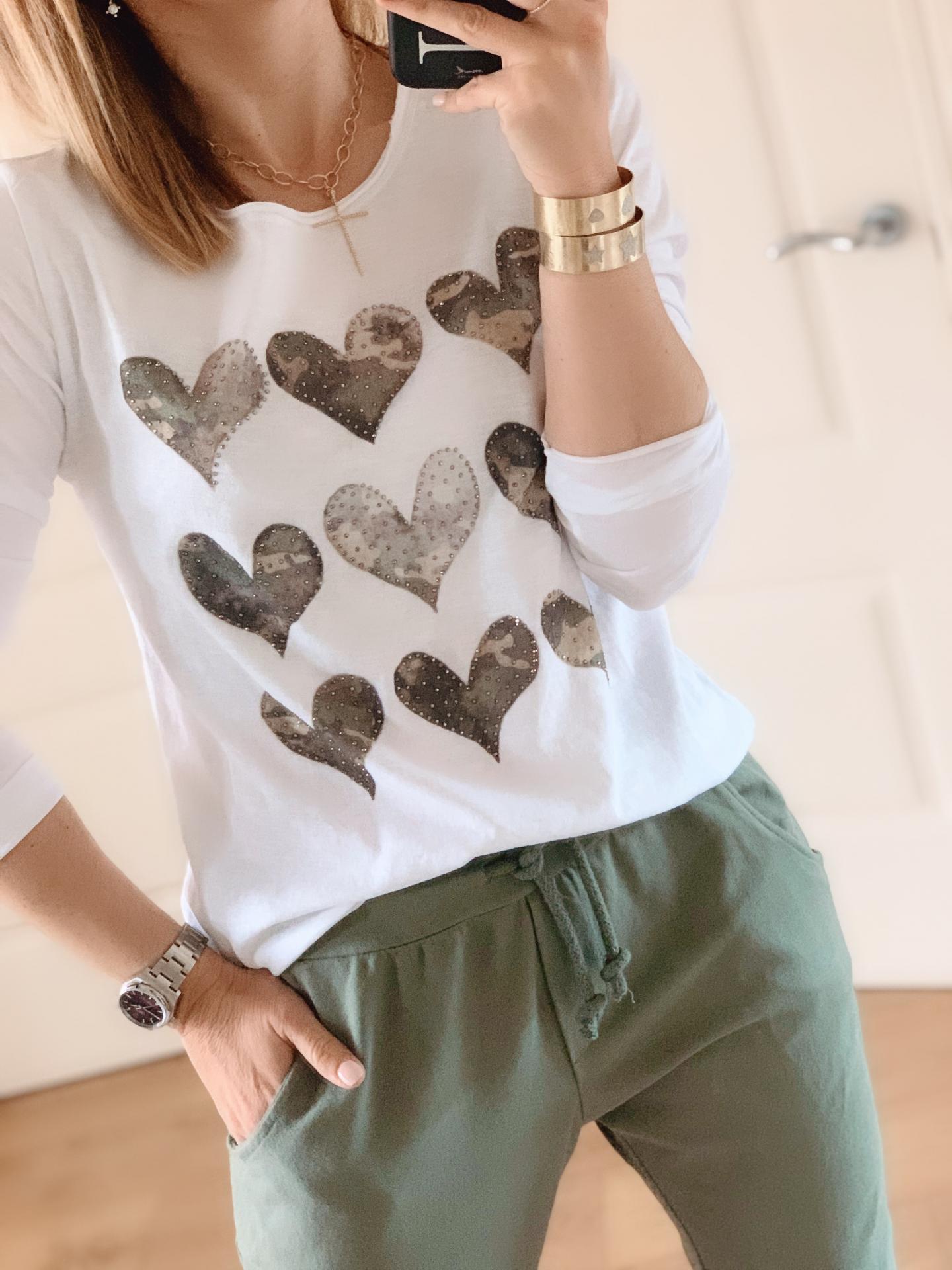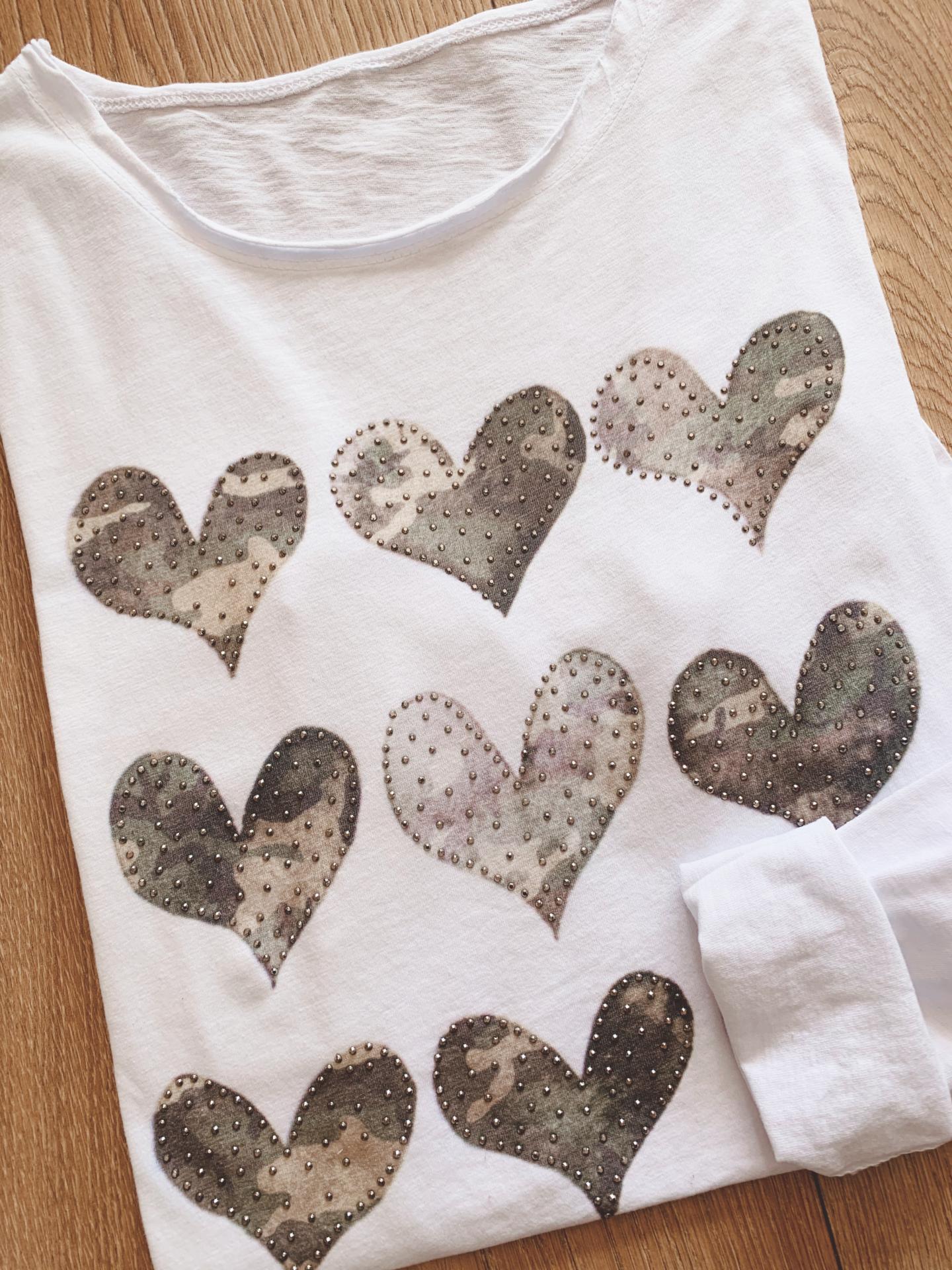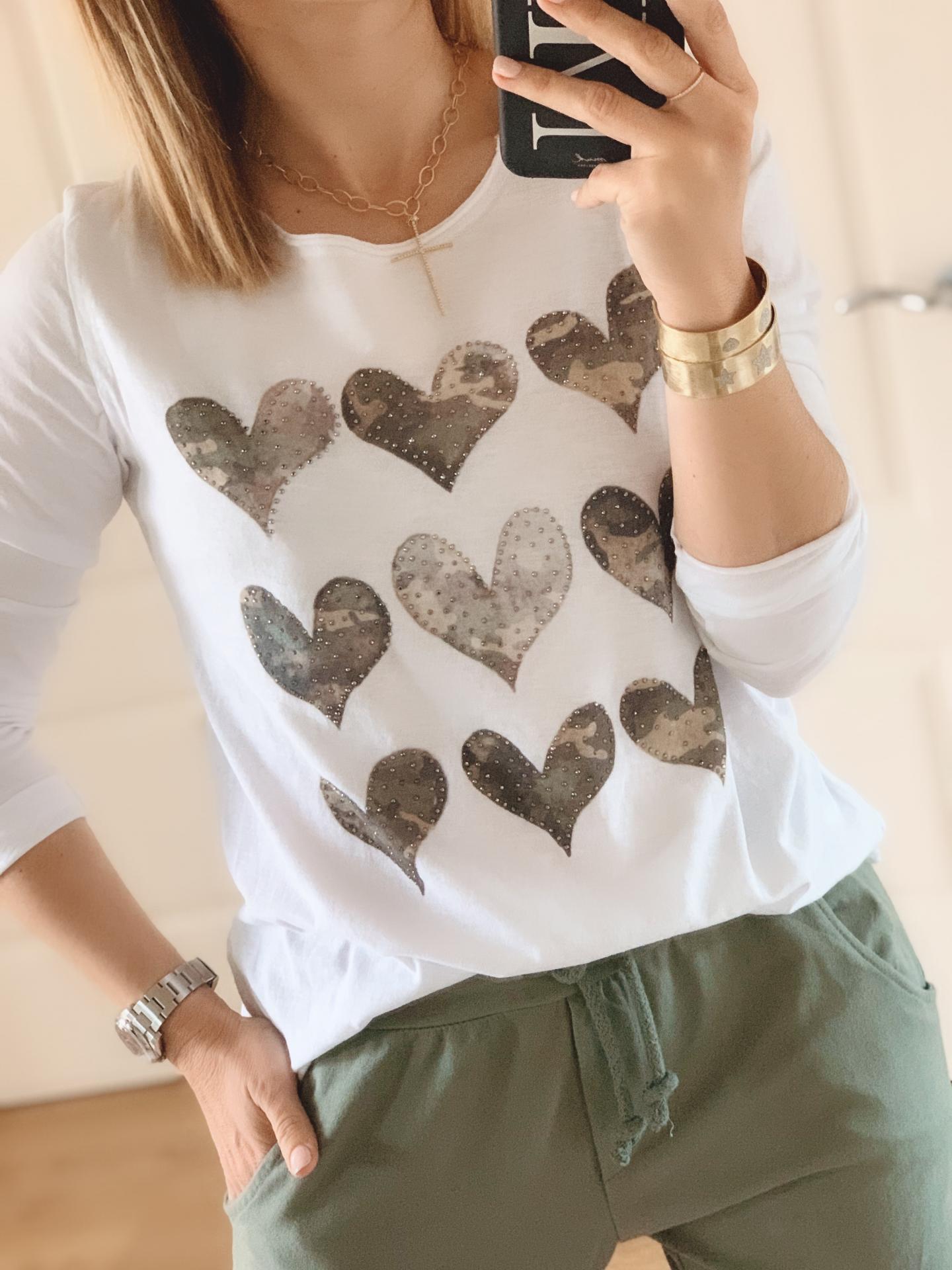 Nueva Camiseta de manga larga con corazones en camuflaje y detalles de brillantes en el estampado.