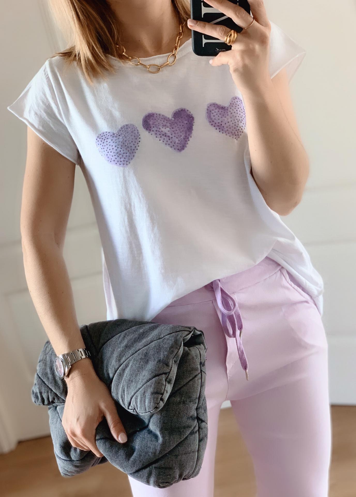 Nueva Camiseta con estampado de tres corazones en lila y brillantes en relieve.