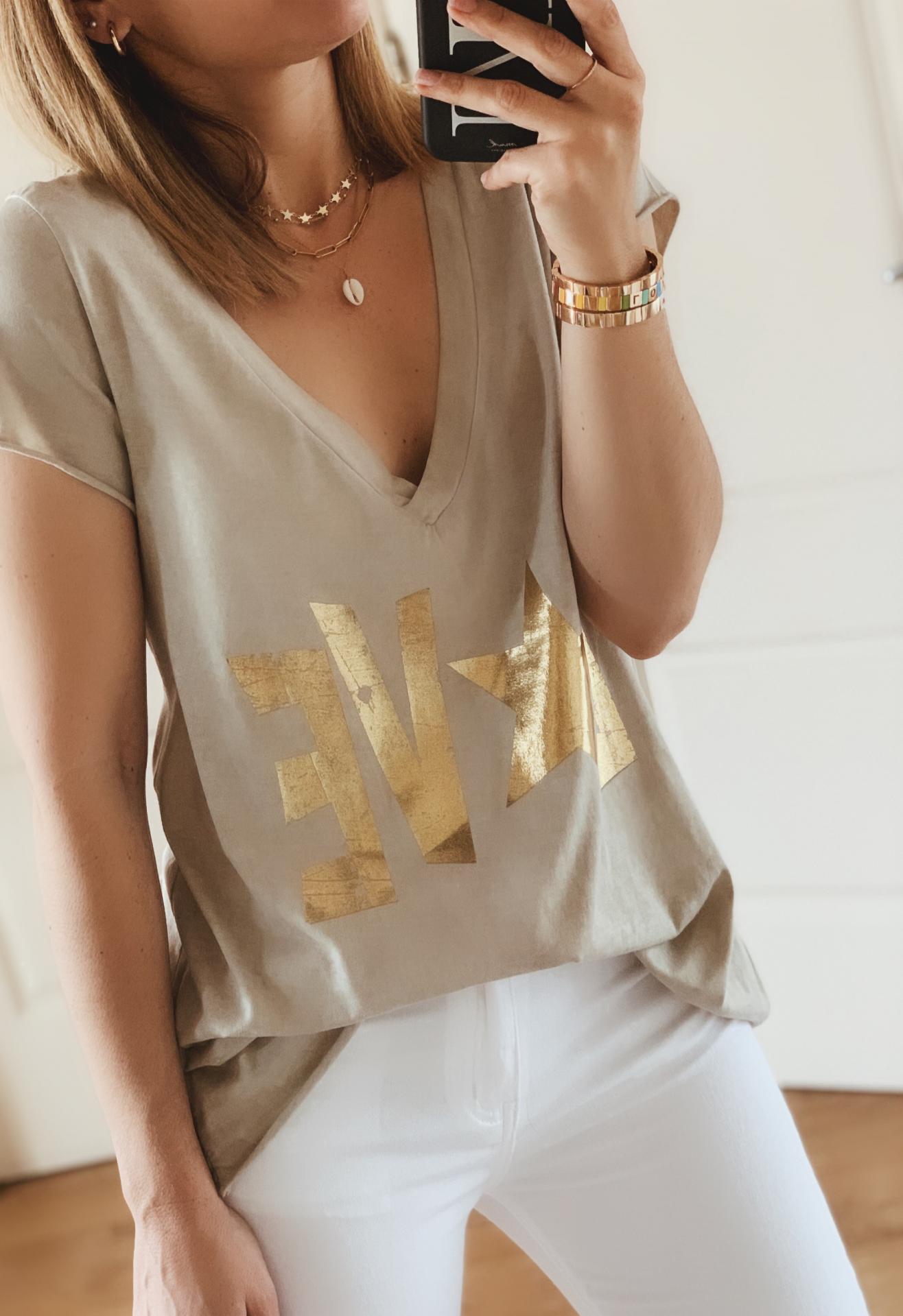 Nueva Camista con escote pico y mensaje en letras doradas.