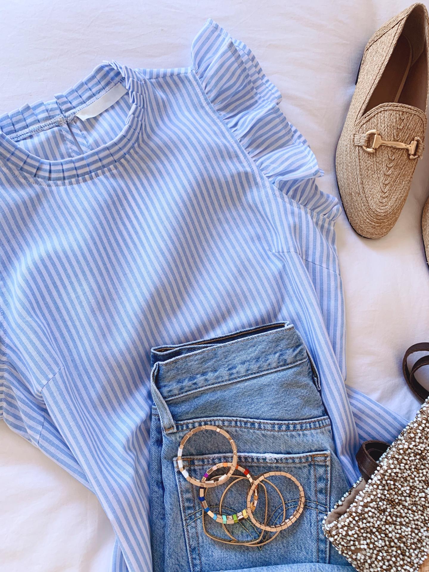 Nueva blusa de rayas con detalle de volante en los hombros y cuello plisado.