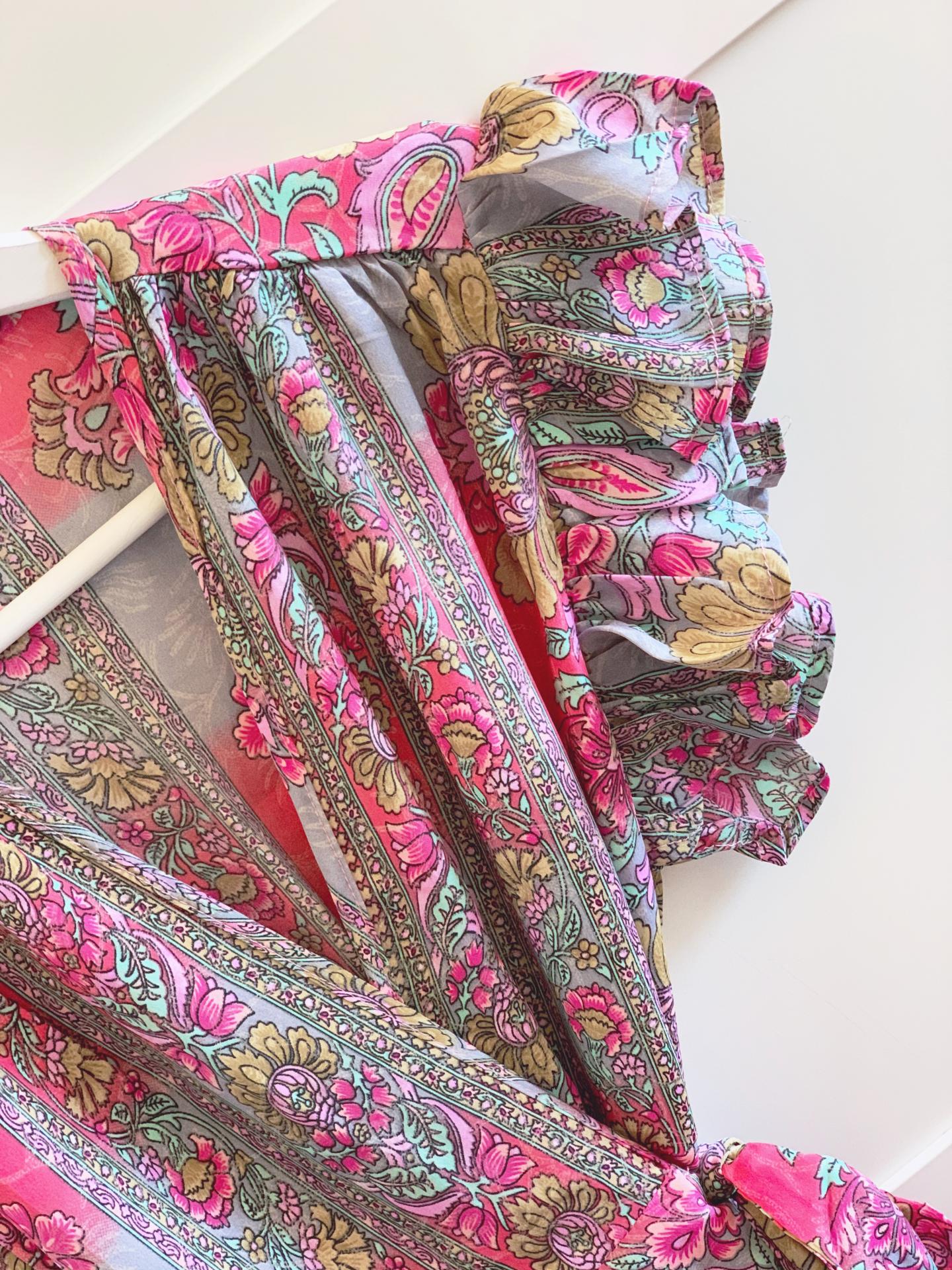 Escote pico y detalle de volantes en los hombros.