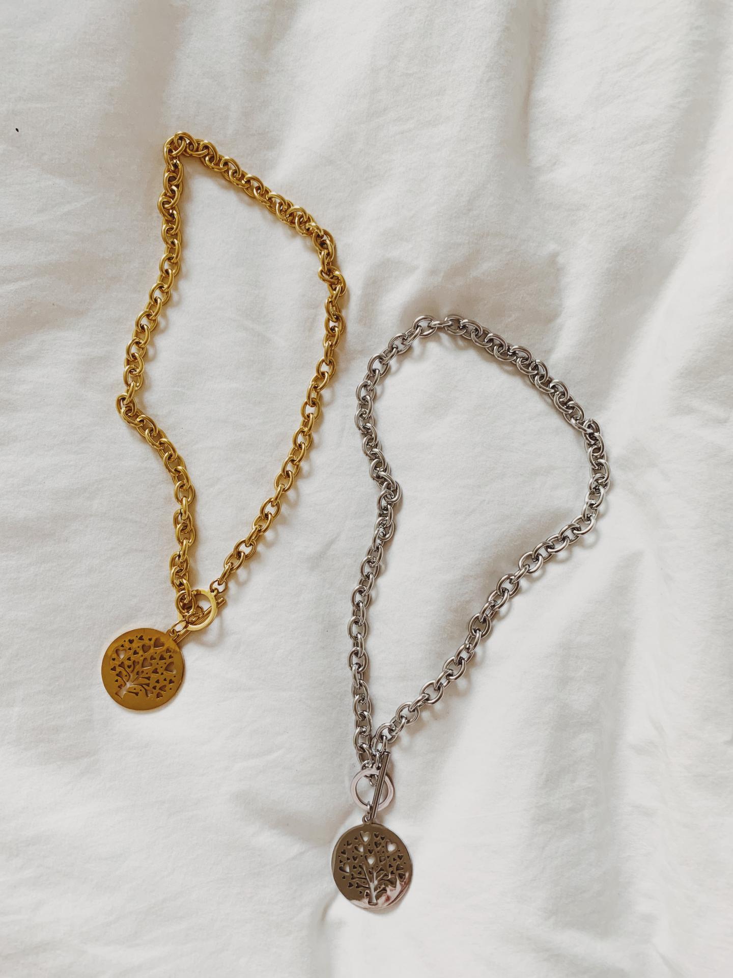 Nuevo colgante con cadena de eslabones y medalla con arboles y corazones.