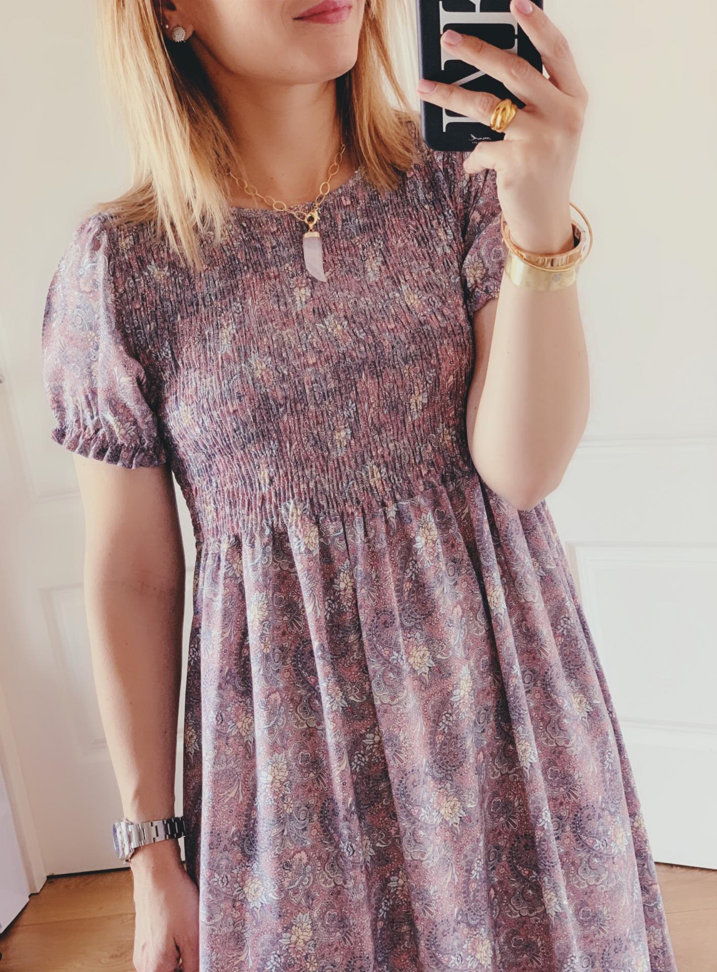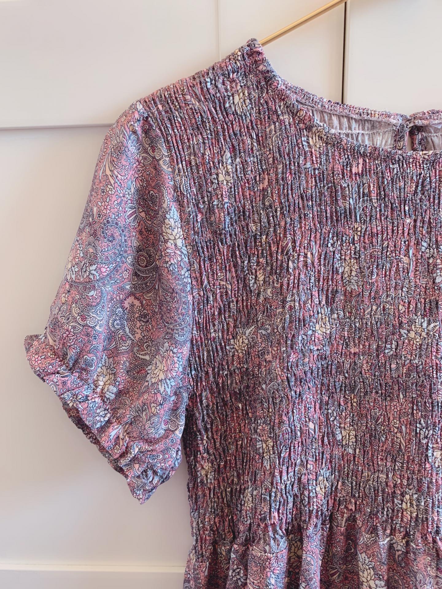 Nuevo vestido con estampado floral mini y escote de nido de abeja.