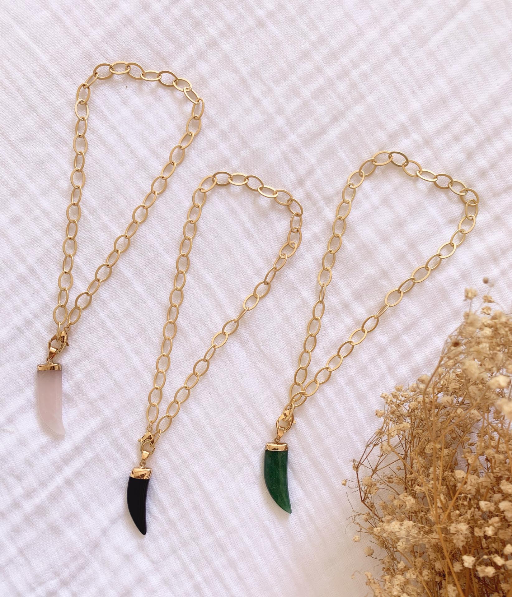 Collar con cadena de eslabones pequeños y cuerda ajustable con detalle de cuerno en piedra natural en el cierre