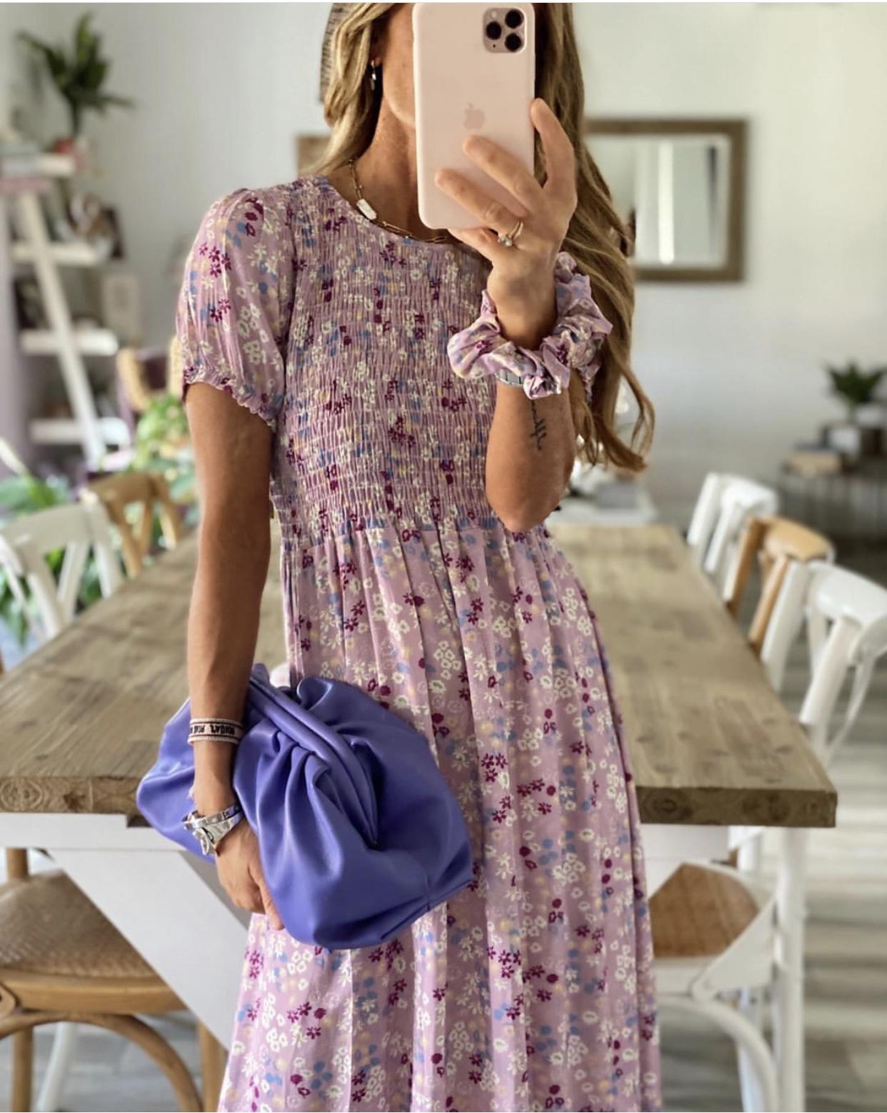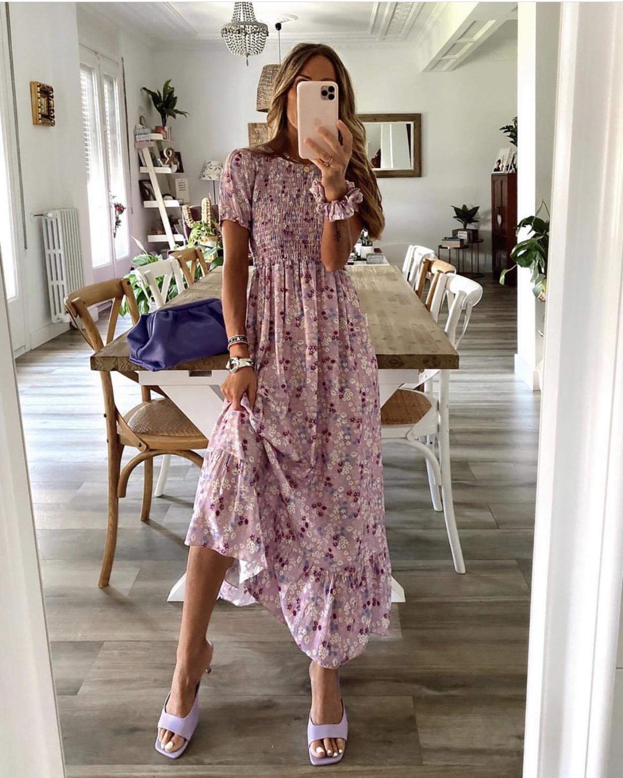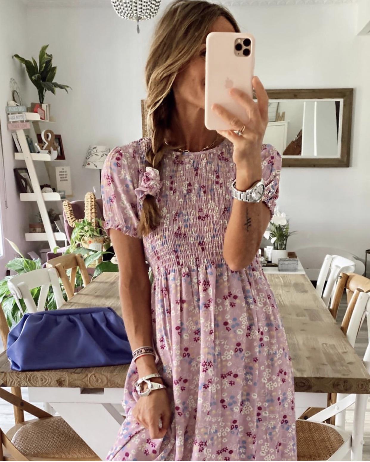 Nuevo vestido con estampado floral mini y escote de nido de abeja.