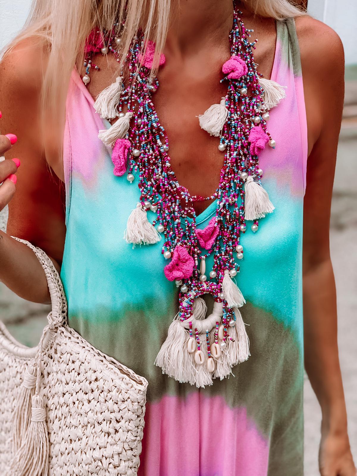 Nuevo Collar en tonos fúcsia, azul cielo y blanco.