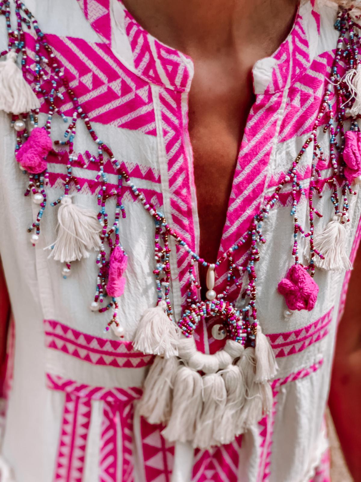 Detalles de pompones en crudo y flores de crochet en fúcsia.