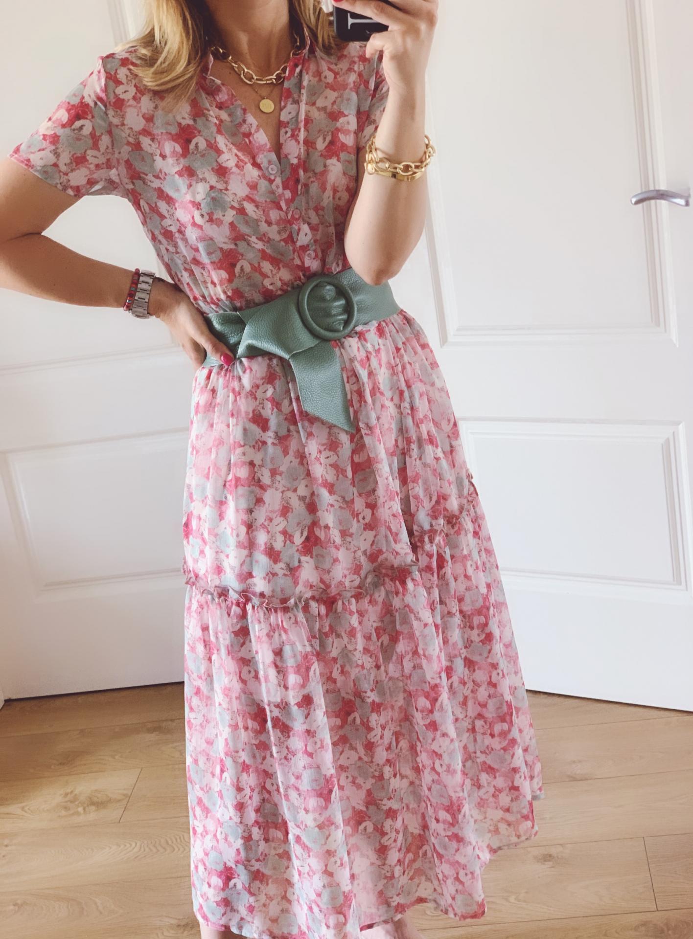 Nuevo vestido de gasa con forro y lazo en la cintura y Manga corta con botones en el escote y cuello mao.