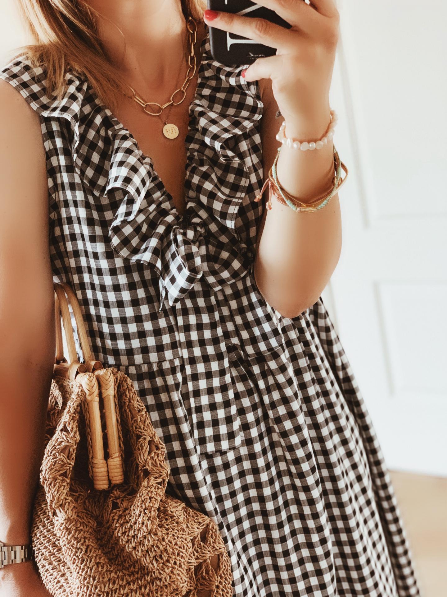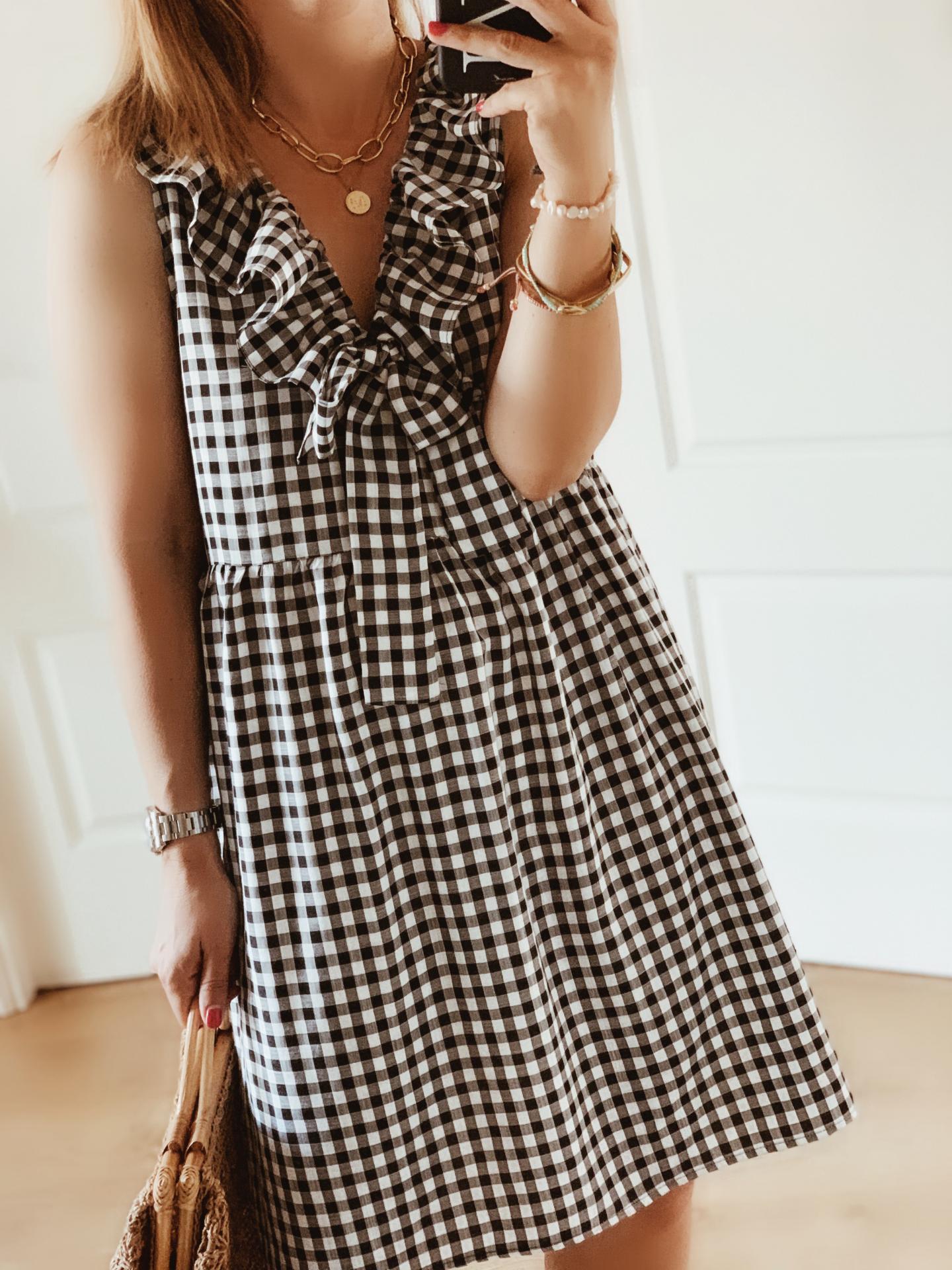 Nuevo vestido con estampado Vichy en blanco y negro y escote en pico con detalle de volantes y lazo.