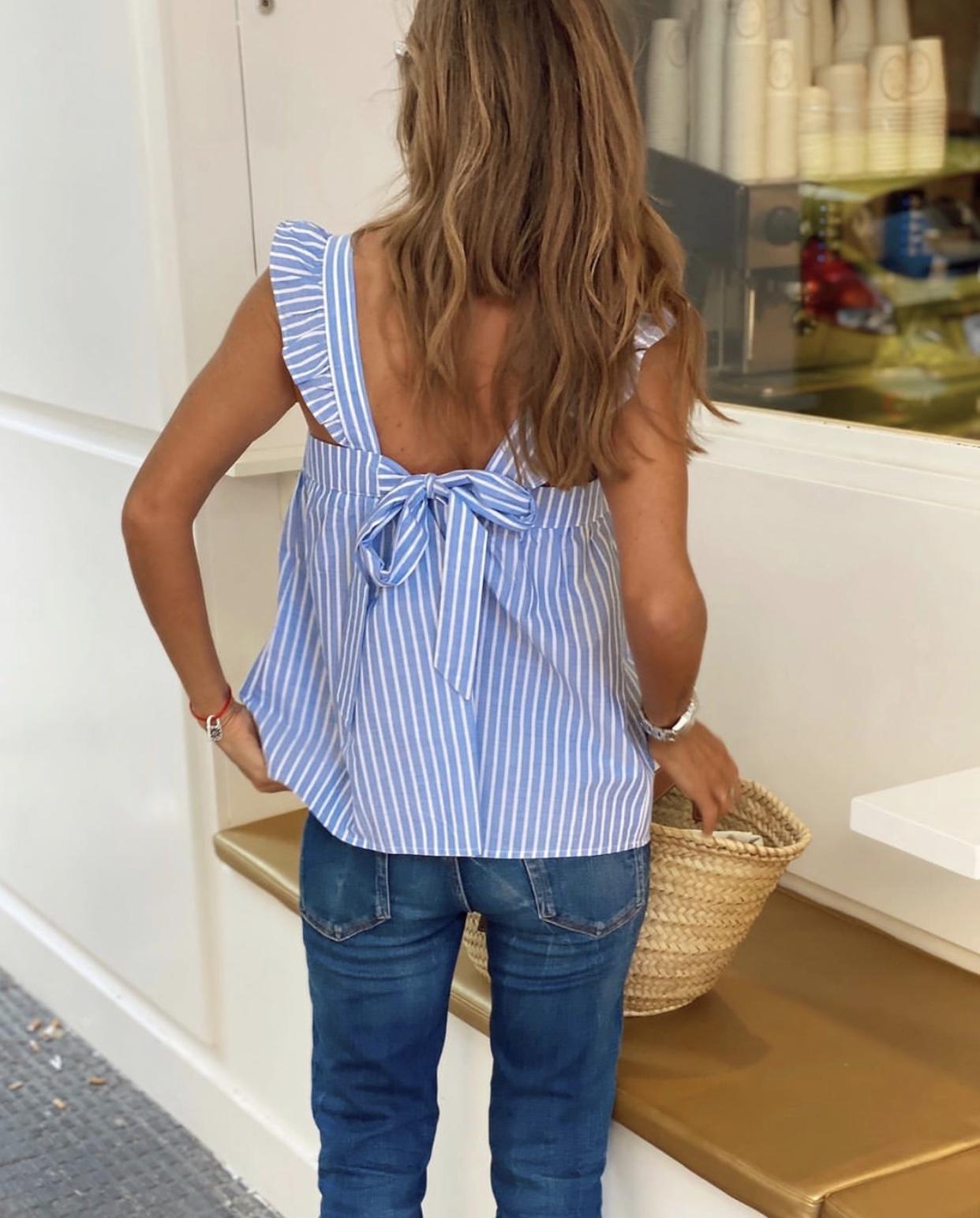 Nueva blusita milrayas en azul y blanco con lalzo en la parte de la espalda.