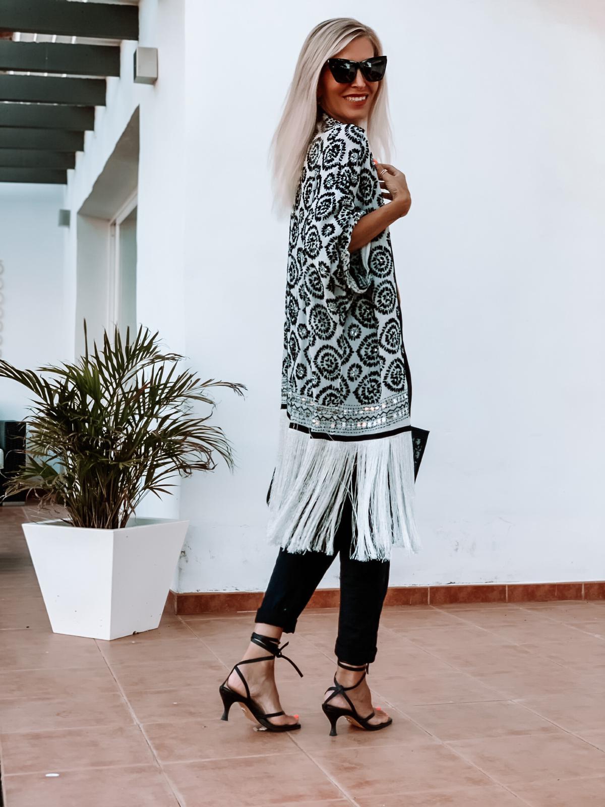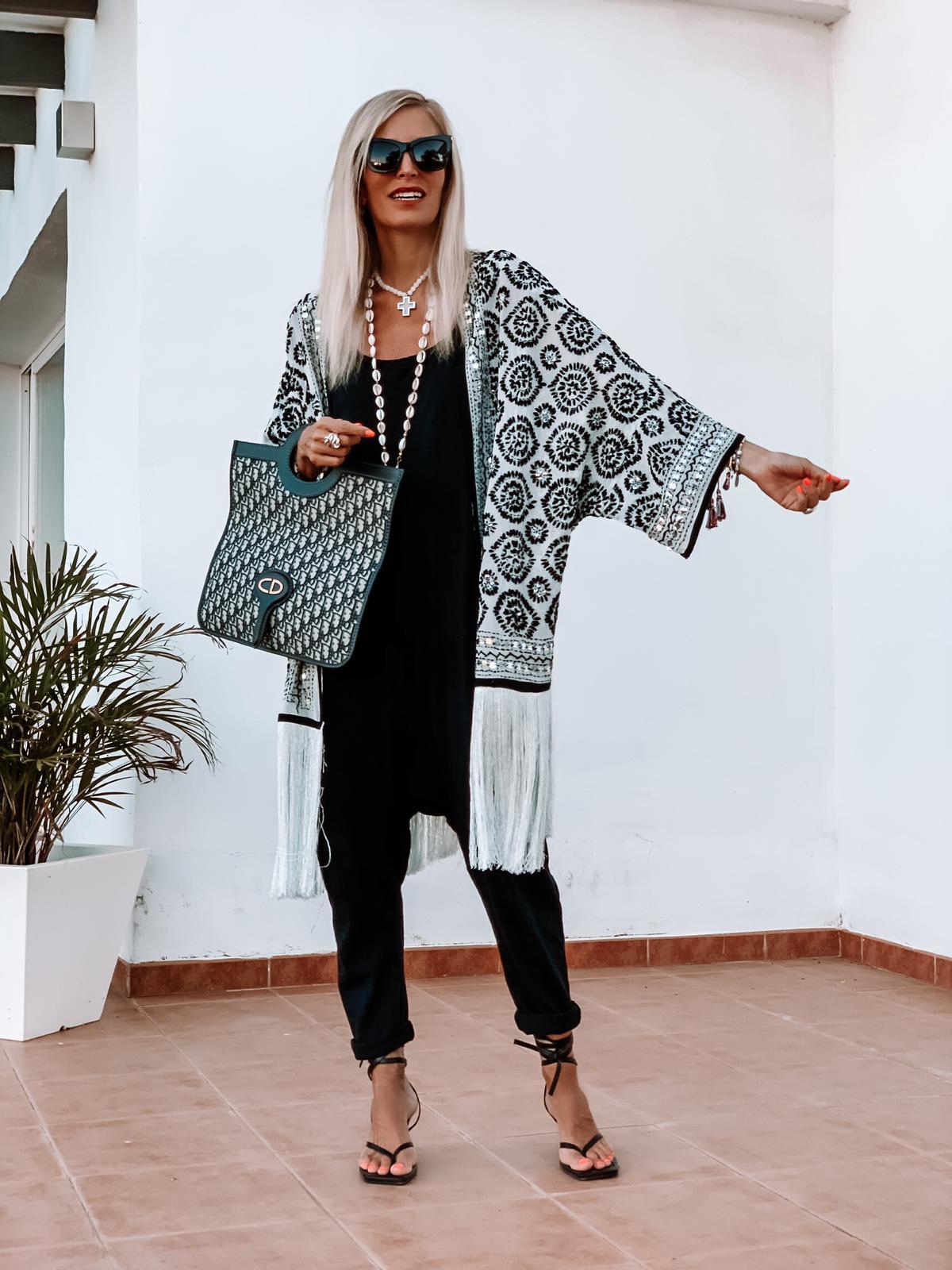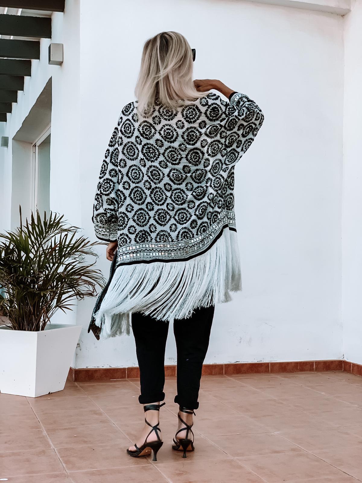 Un nuevo Kimono bordado y con pedrería dorada combinando crudo y negro.