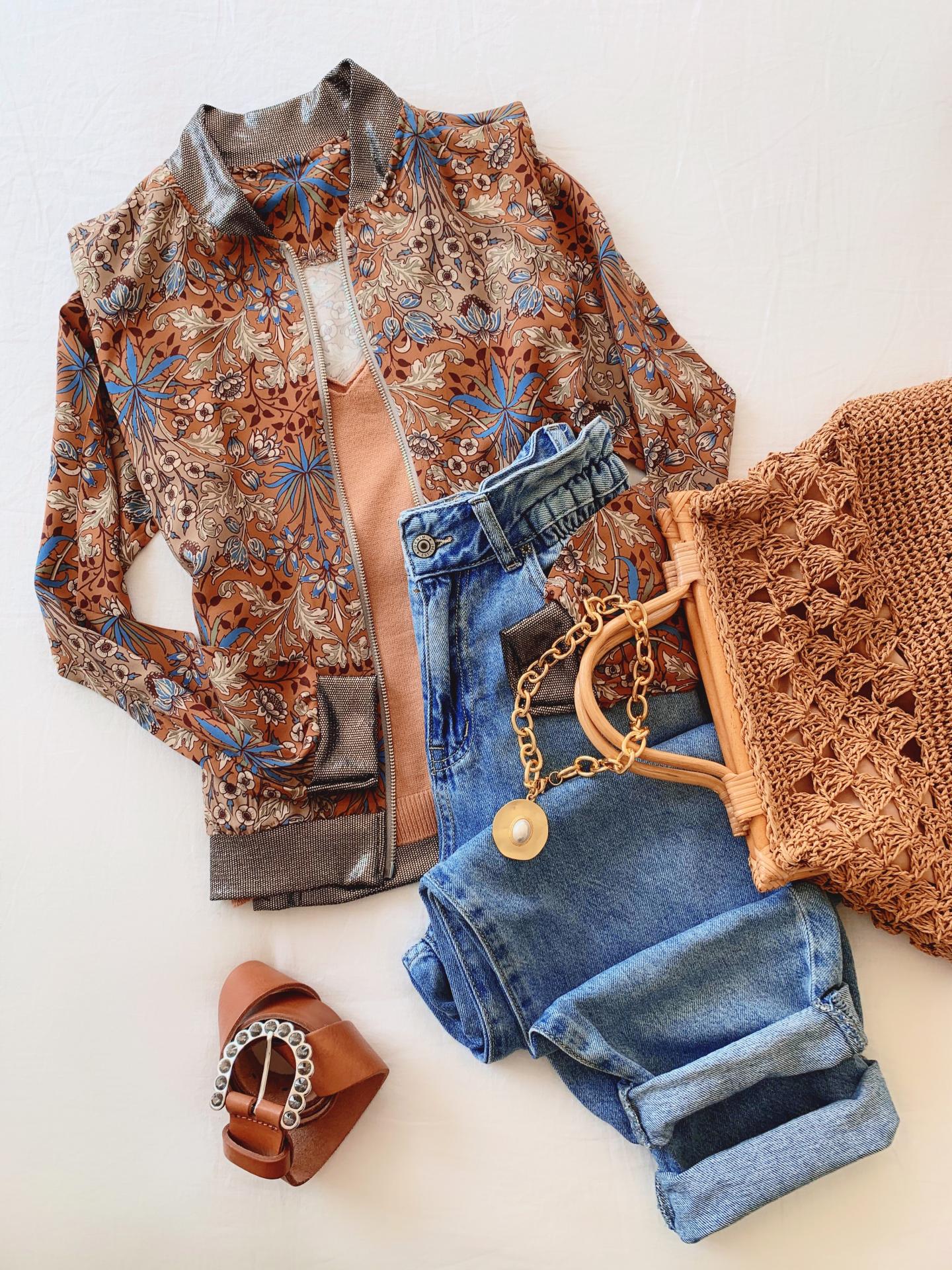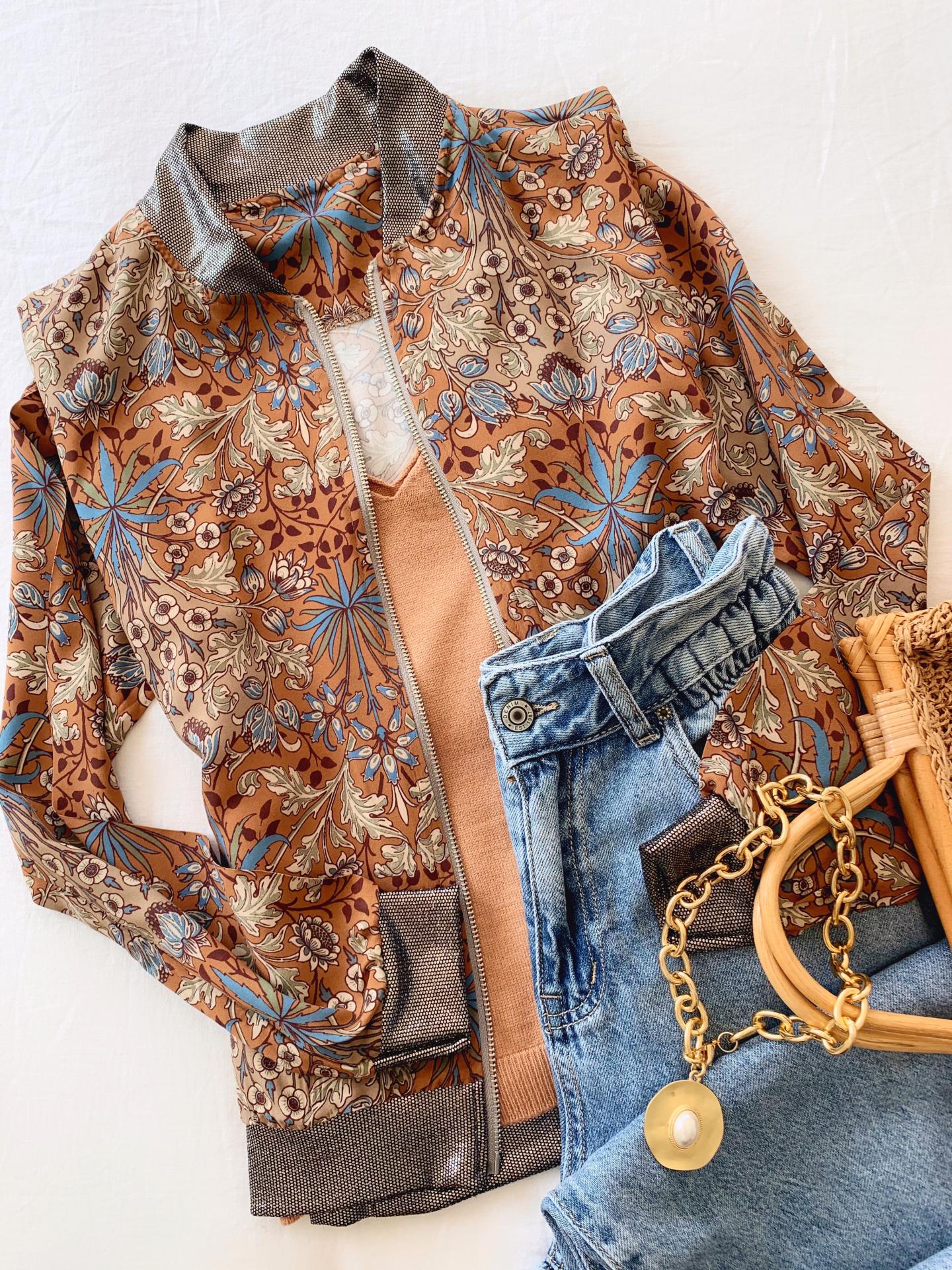 Nueva Bomber con estampado floral con detalles metalizados en cuello y puños.