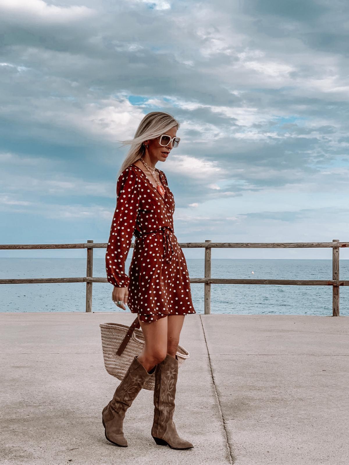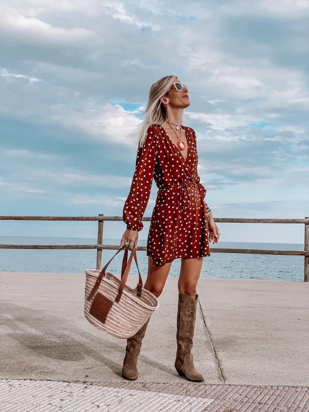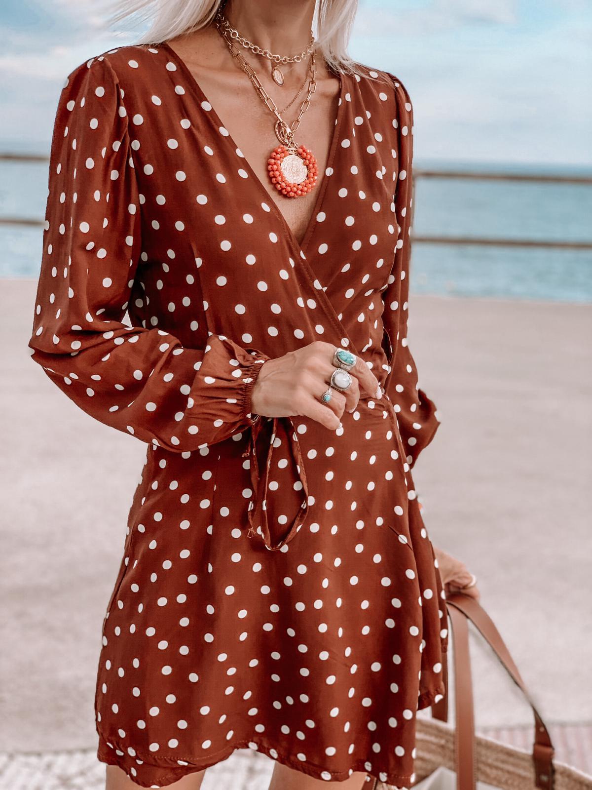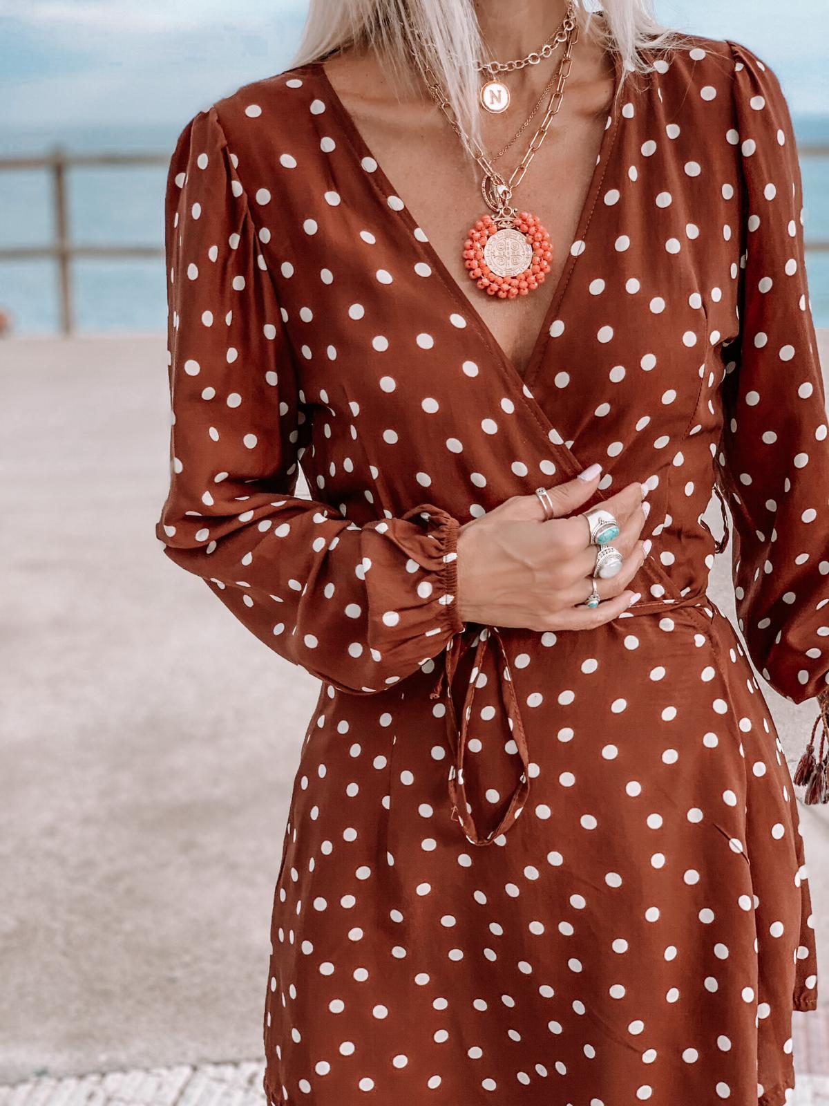 Nuevo vestido de efecto Cruzado con estamoado marrón Camel y topos crudos.