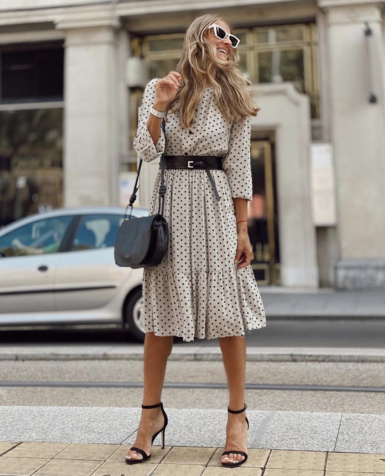 Nuevo vestido en gris claro y topos negro ideal para combinar con botas y sandalias.