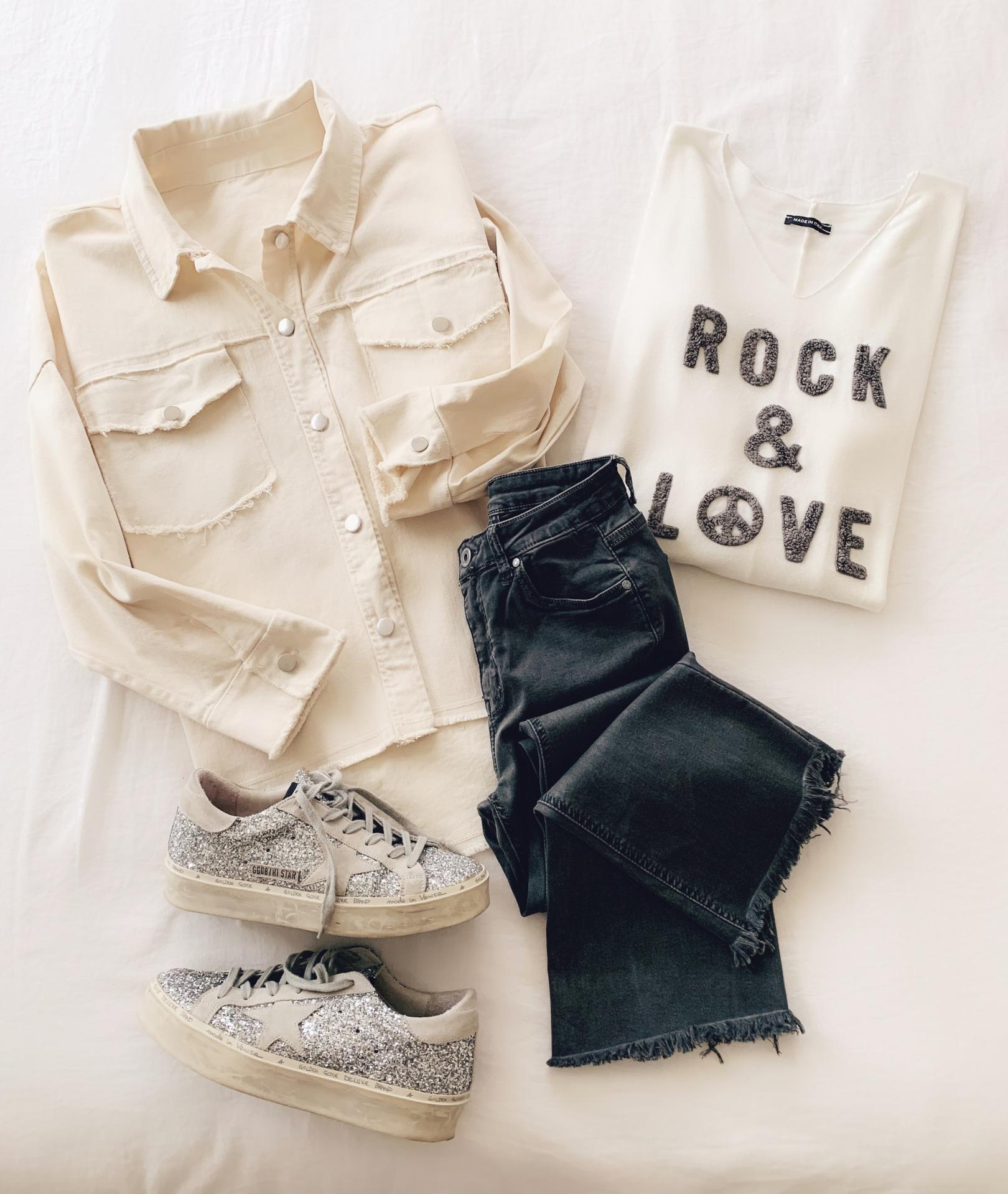 Nueva camiseta de pico y manga larga con pespunte plateado y corte recto.