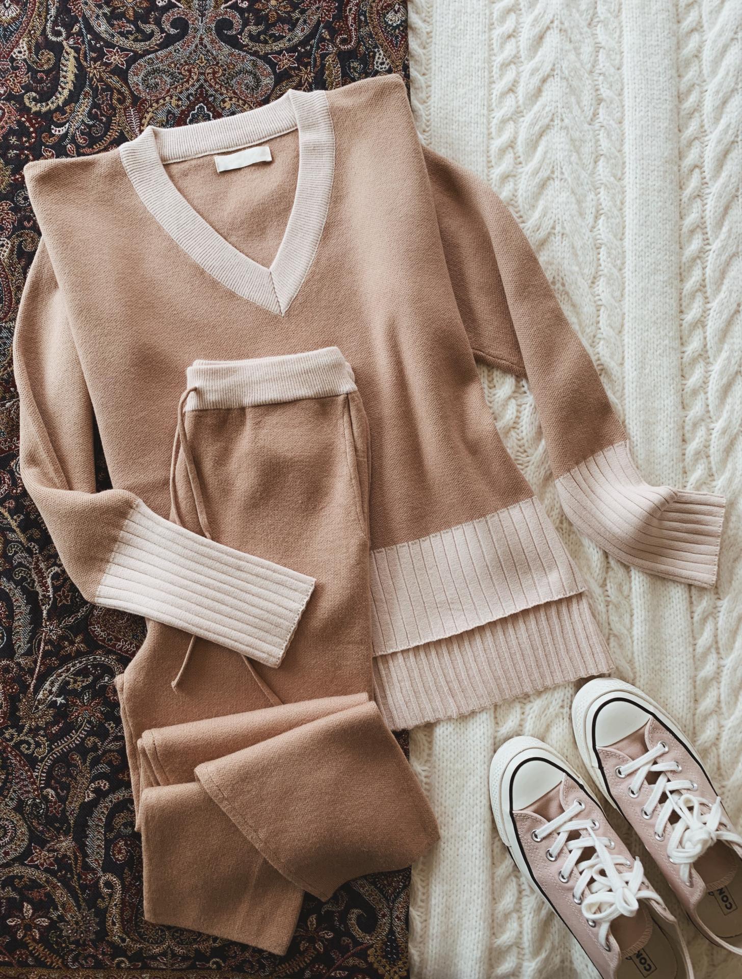 Nuevo Conjunto de punto en Camel y Beige con ribete en el cuello y en la cintura del Pantalón.