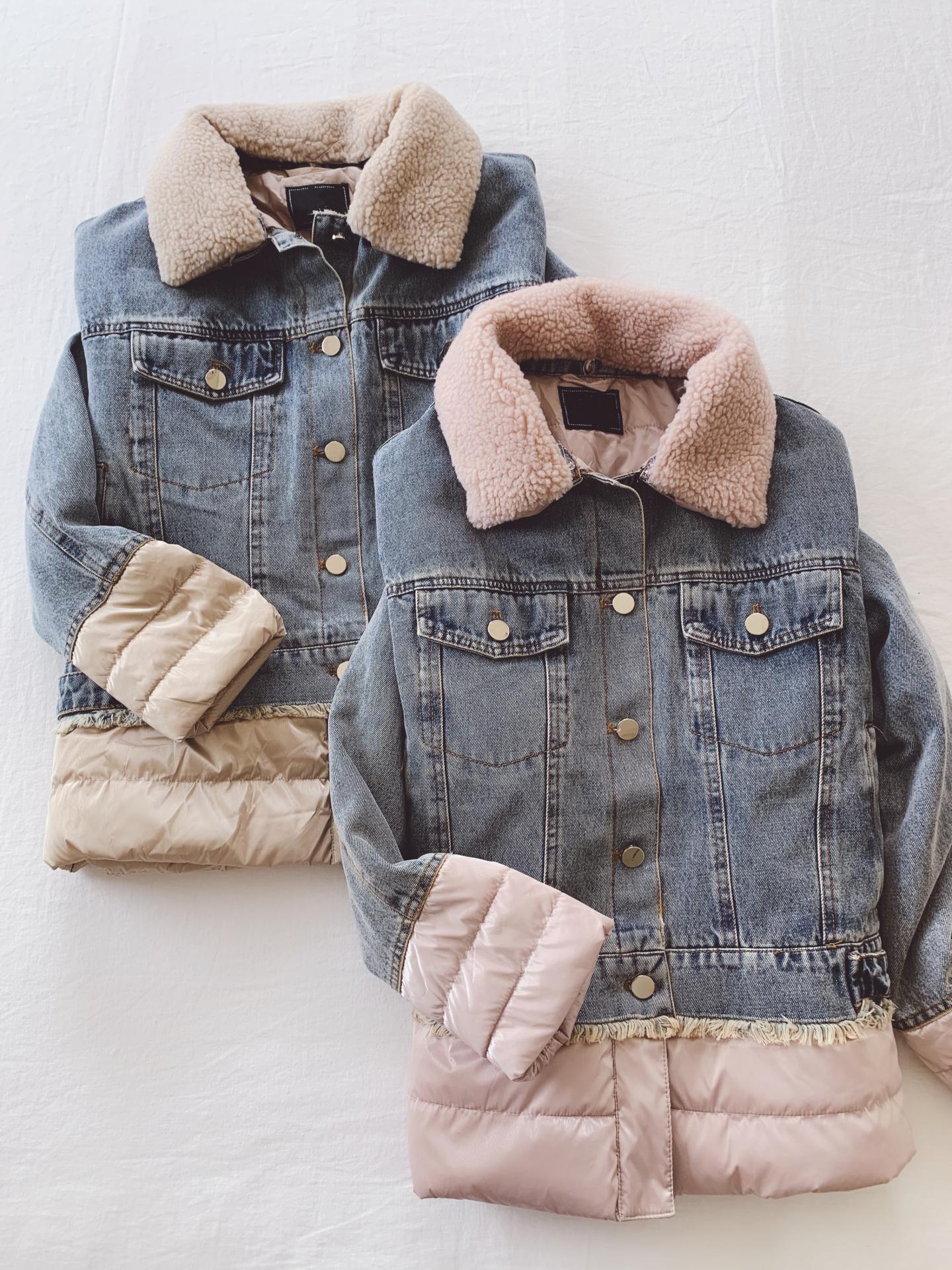 Nuevo abrigo en tejano y plumas con detalle de borreguito en el cuello extraíble a juego en tonos.