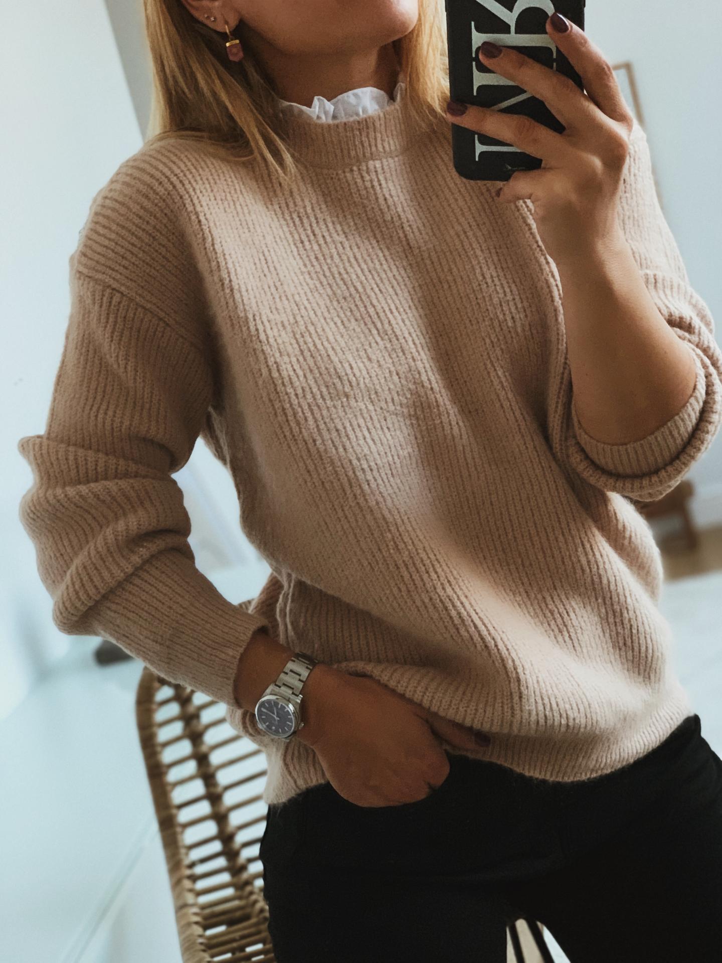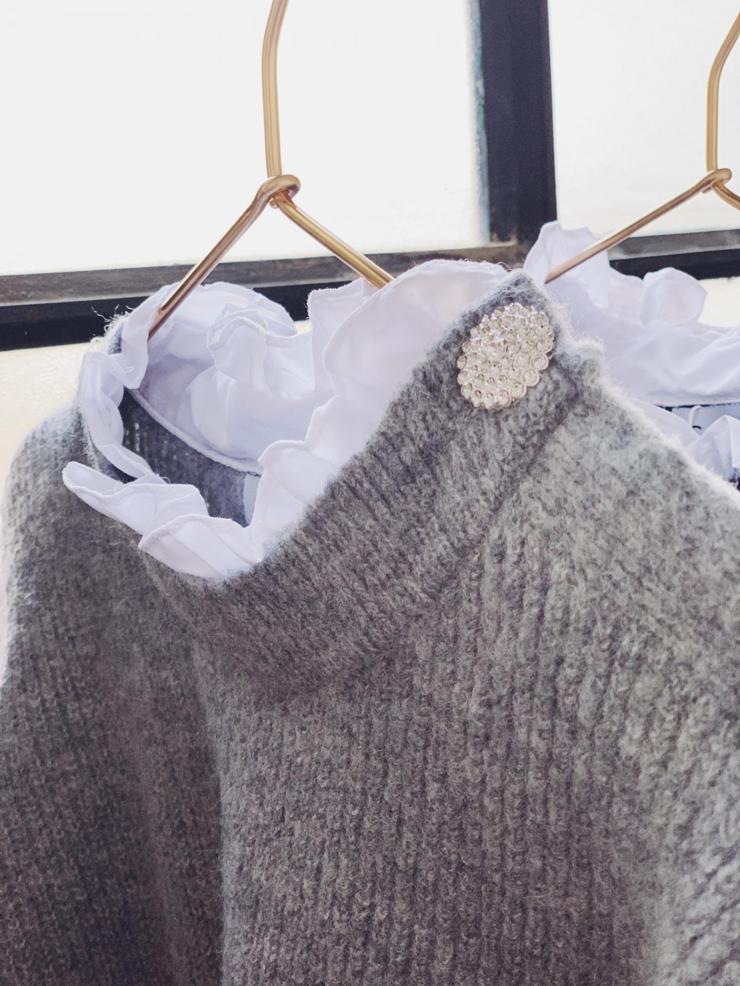 Nuevo jersey con efecto blusa en el escote y botones joyas de brillantes en el hombro.