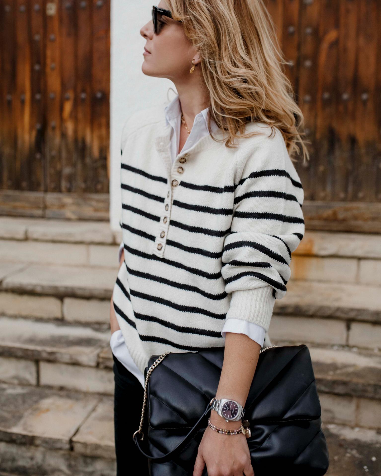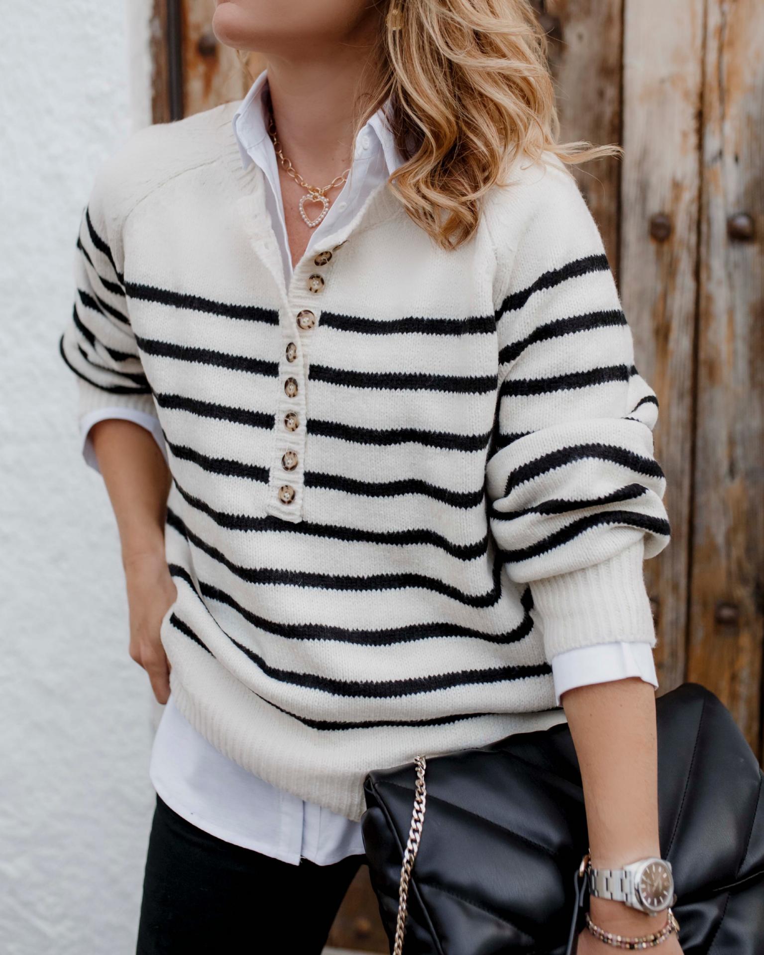 Nuevo Jersey estilo Navy de rayas negras y fondo rosa con botones en el escote.