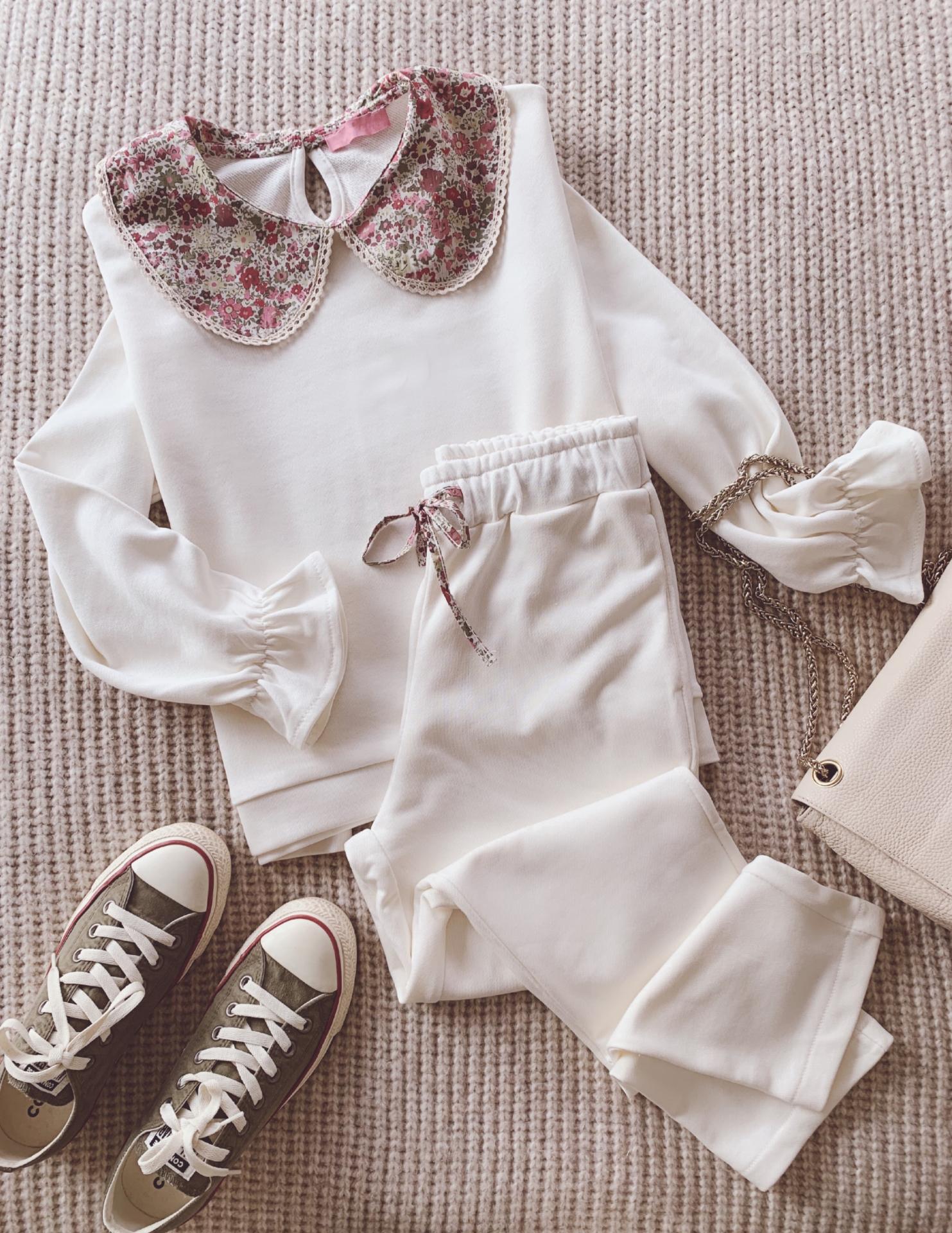 Detalle de cuello bobo en escote y lazo del Pantalón a Conjunto.