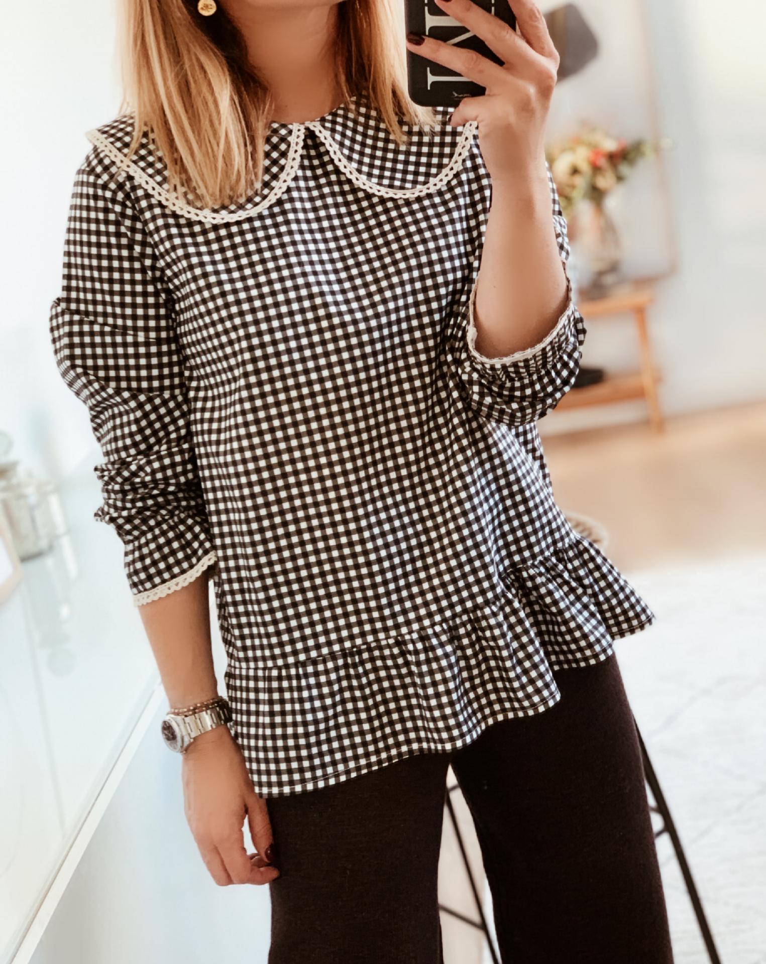 Nueva Camisa vichy con detalle de volante en el bajo y cuello bobo con ribete en macramé.