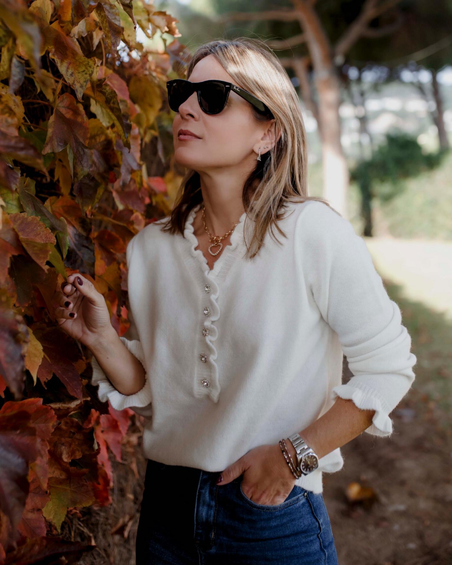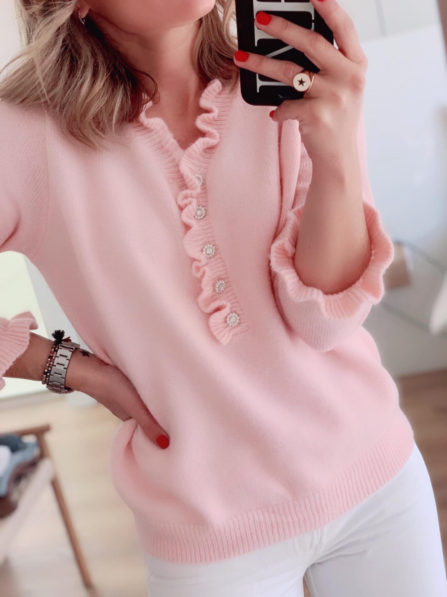 Nuevo Jersey Claire con botones Joya y detalles de volantes en escote y puños.