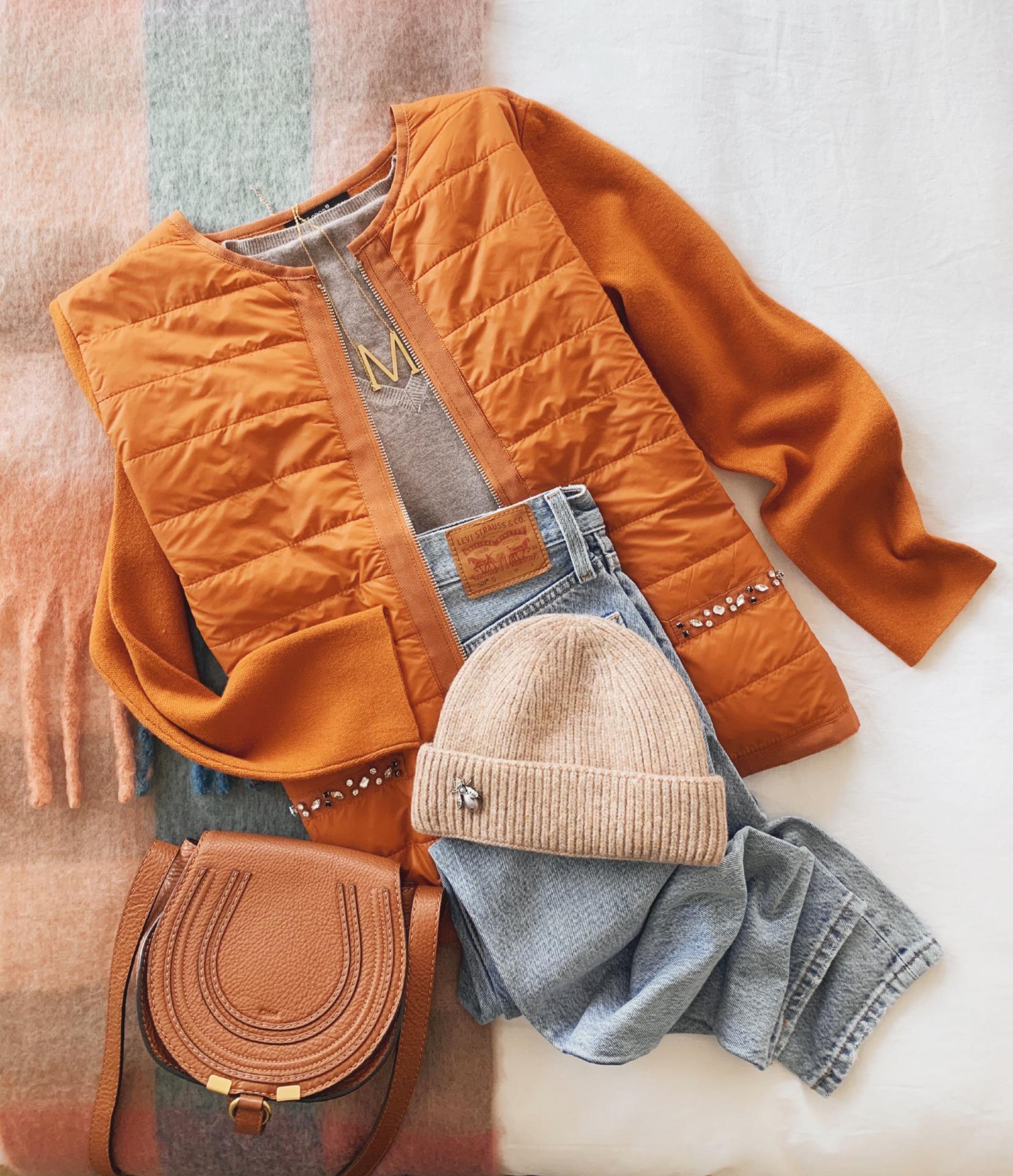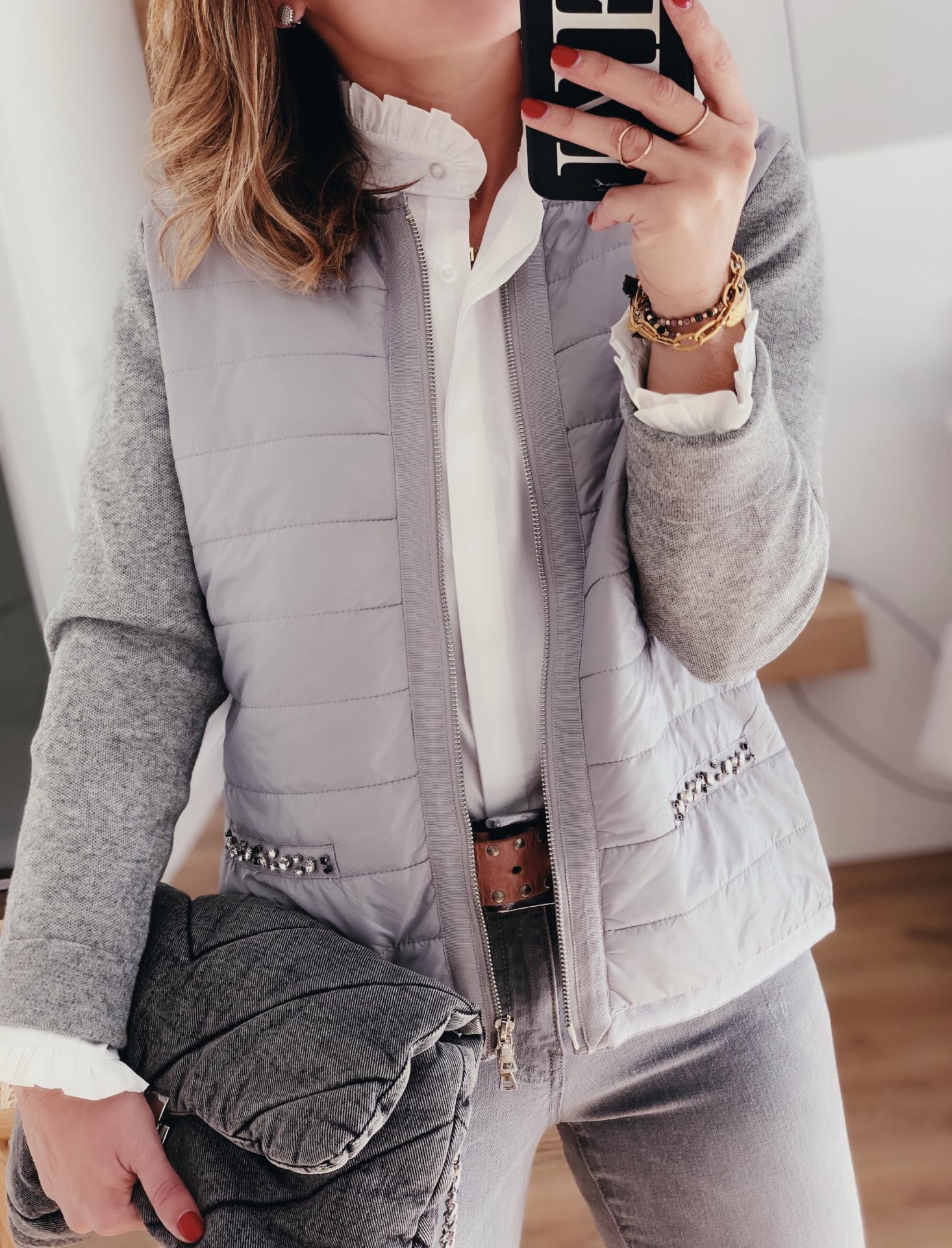 Precioso plumón de punto y plumas con detalle de pedrería en los bolsillos.
