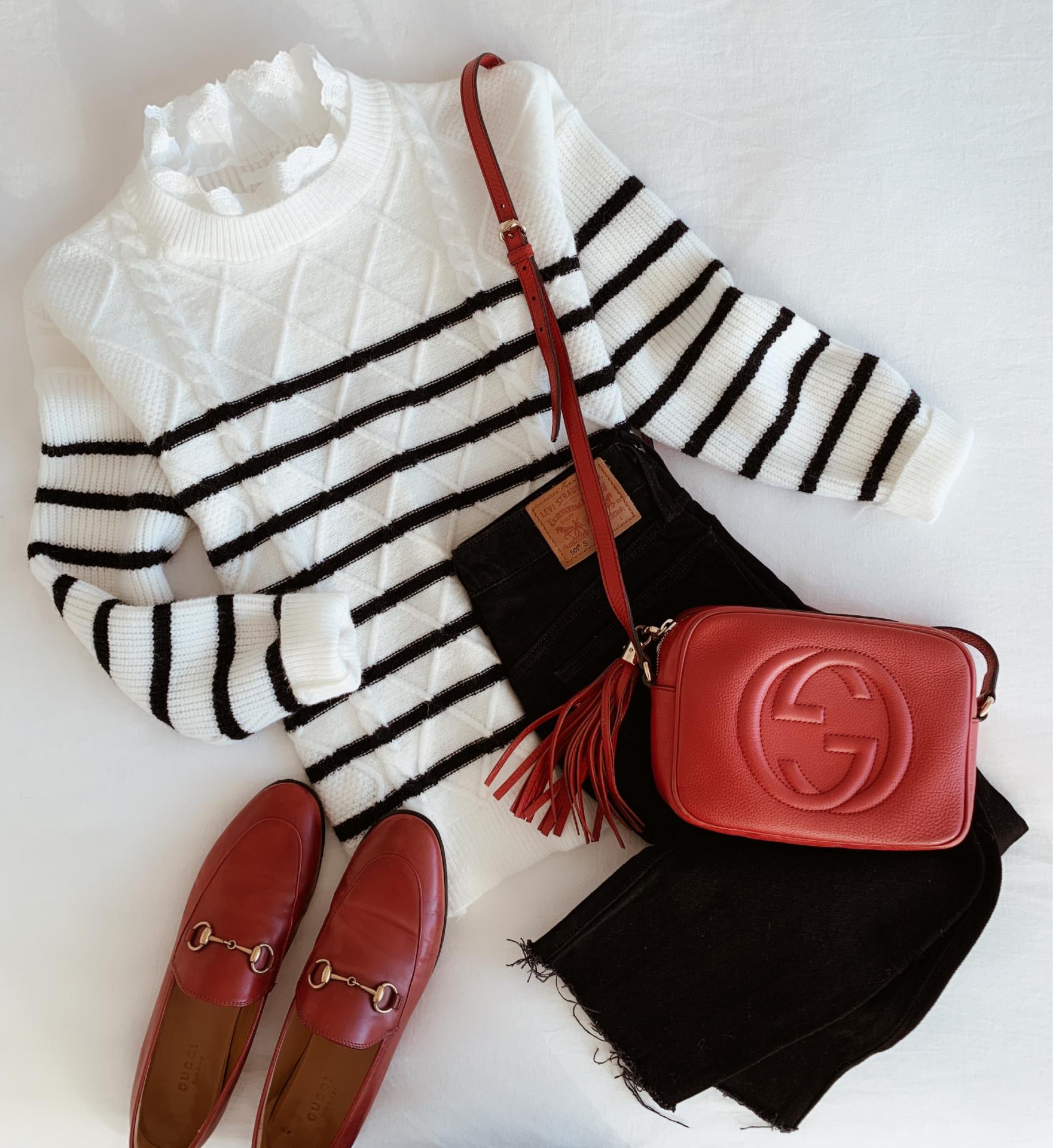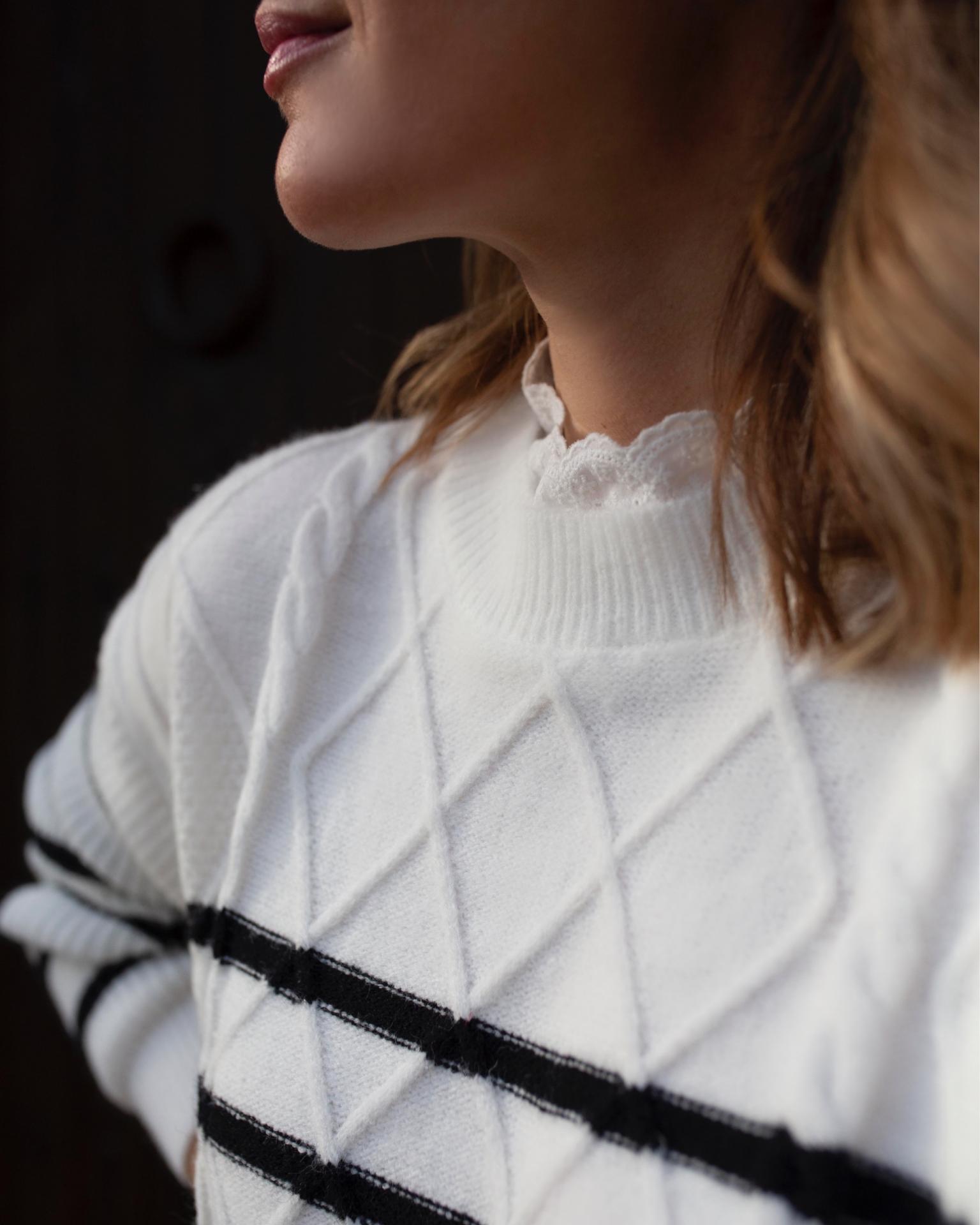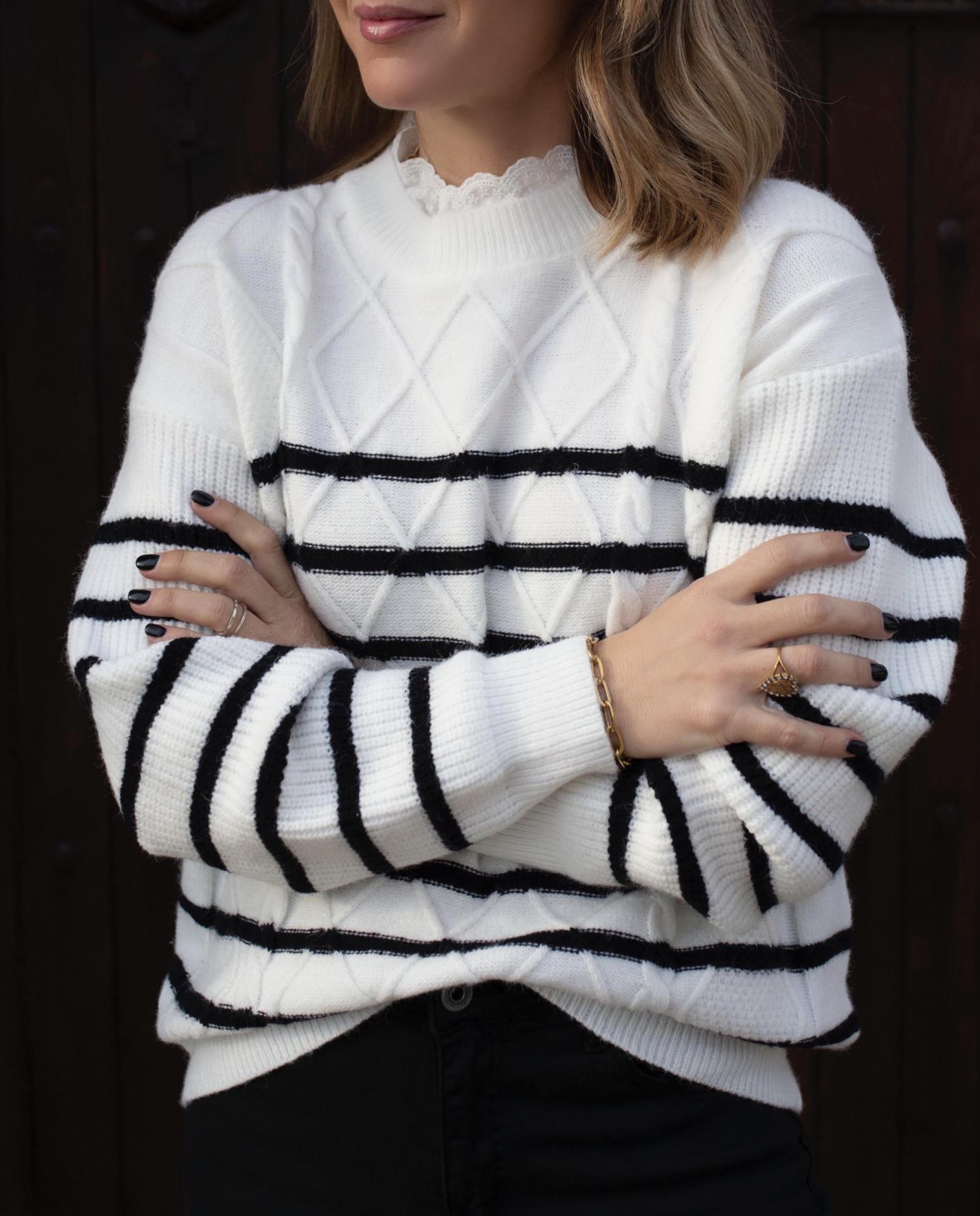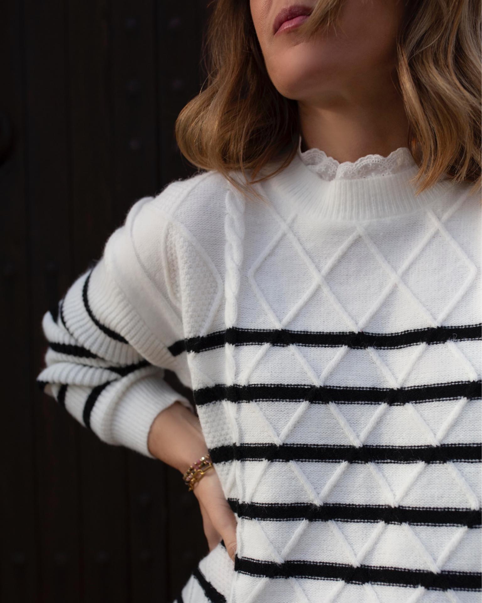 Nuevo jersey en rayas negras y detalle de encaje bordado en el cuello.