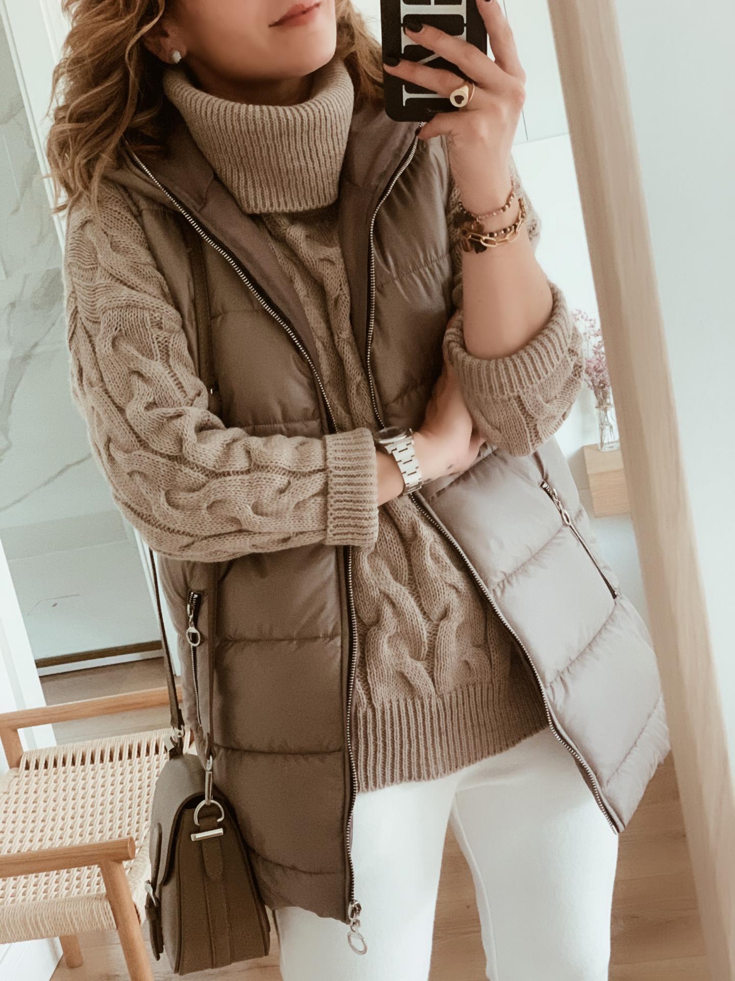 Nuevo Chaleco acolchado en color taupe con cremalleras en los bolsillos y efecto cremallera también en Capucha.