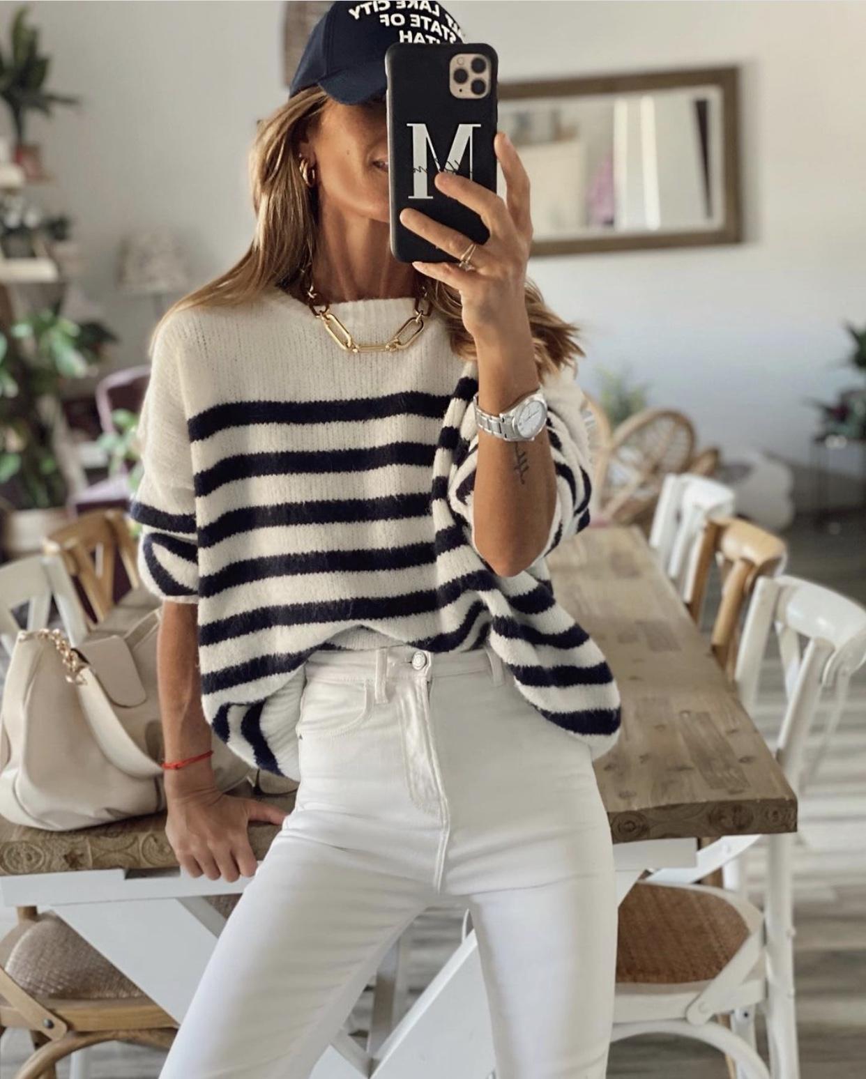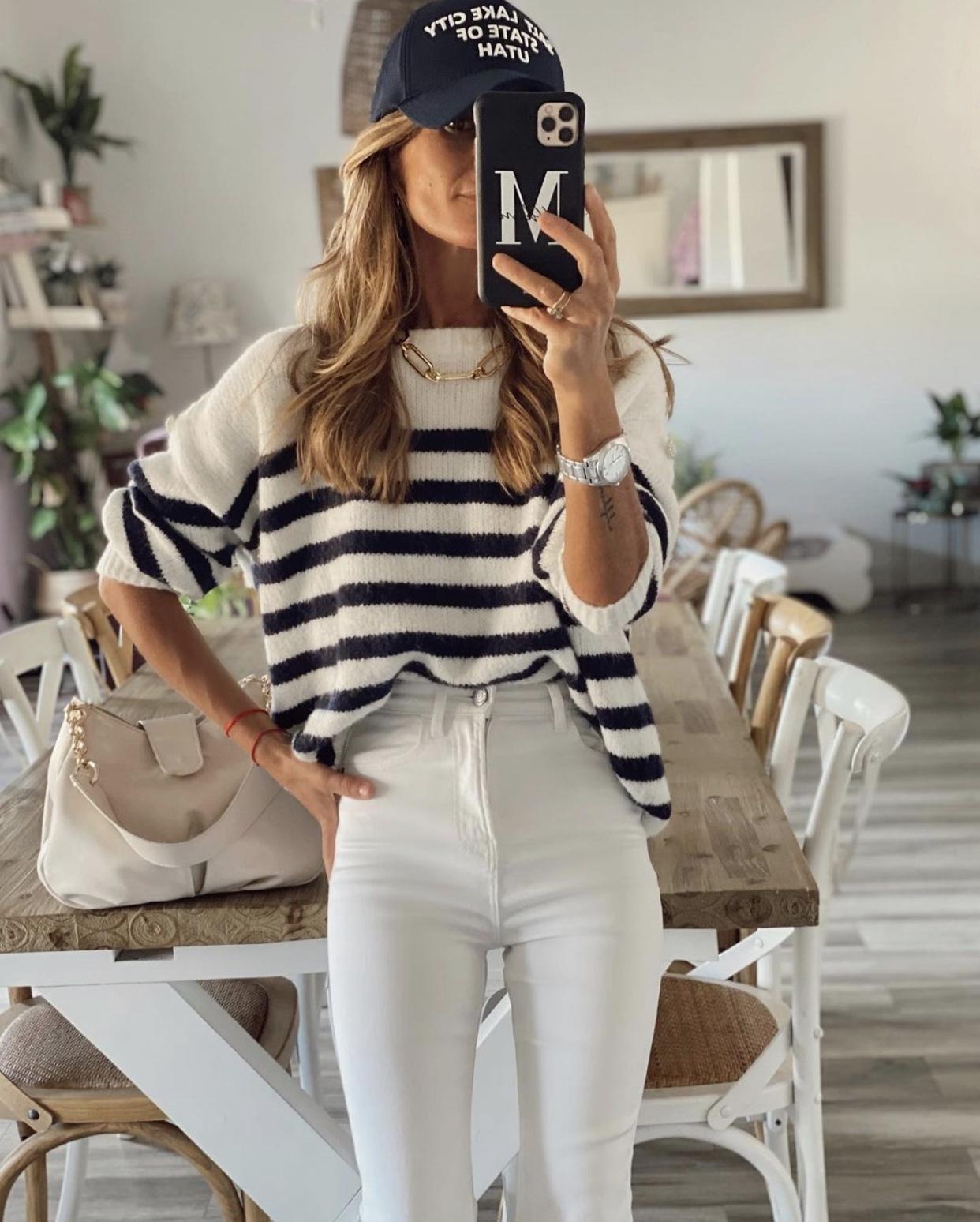 Nuevo Jersey con rayas azul marino , cuello redondo y detalle de botones en el hombro de pedrería.