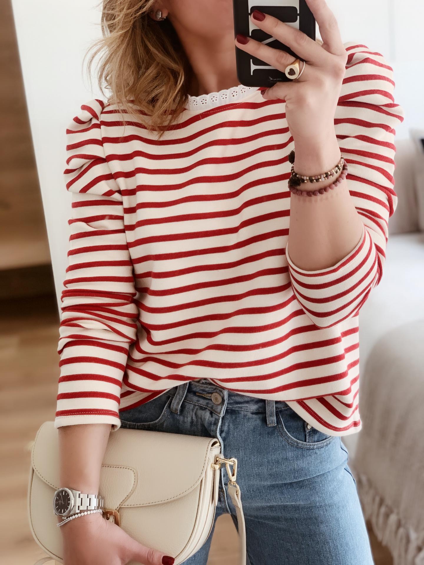 Nueva Sudadera de corte recto con Rayas en el tejido y mangas abullonadas en los hombros.