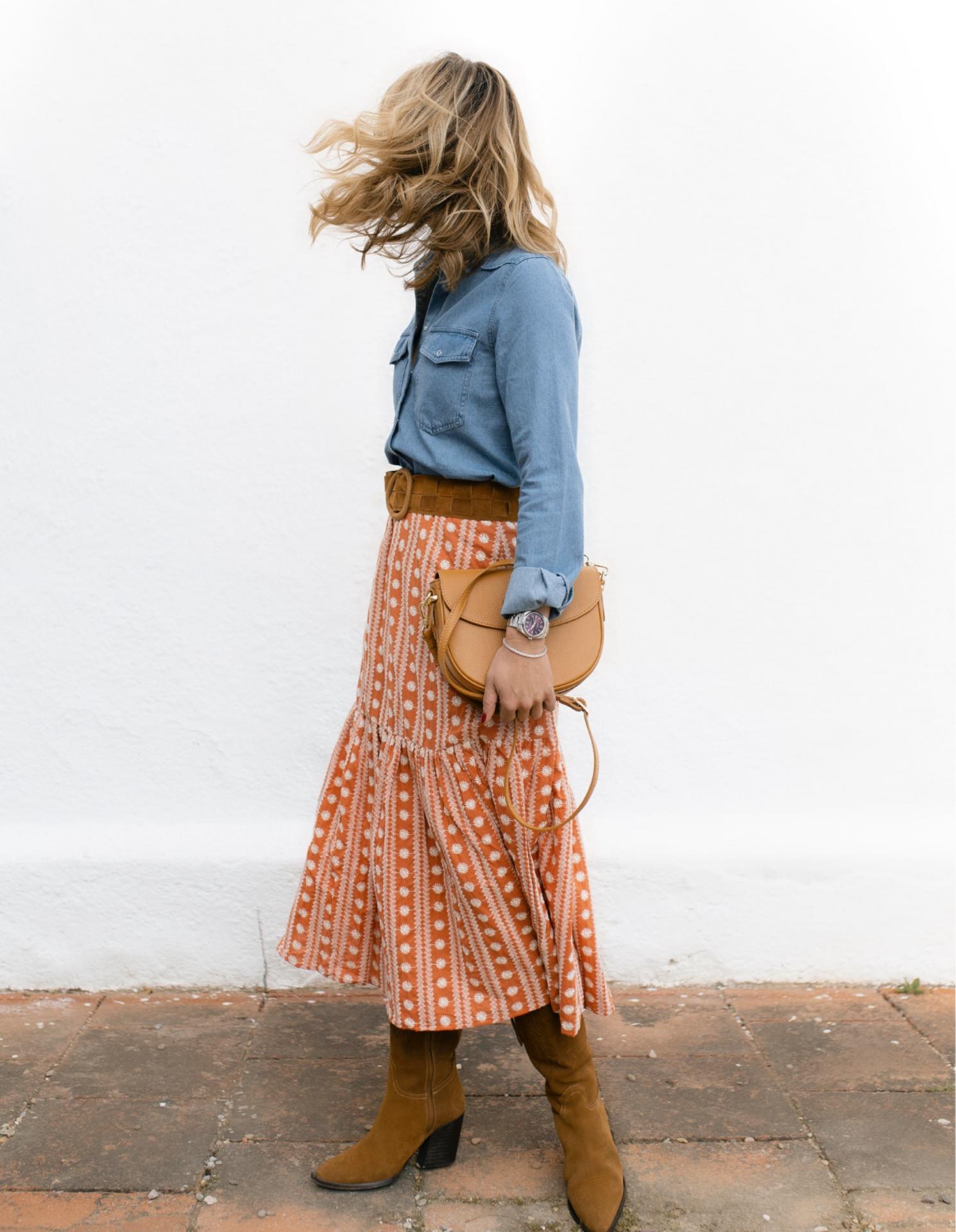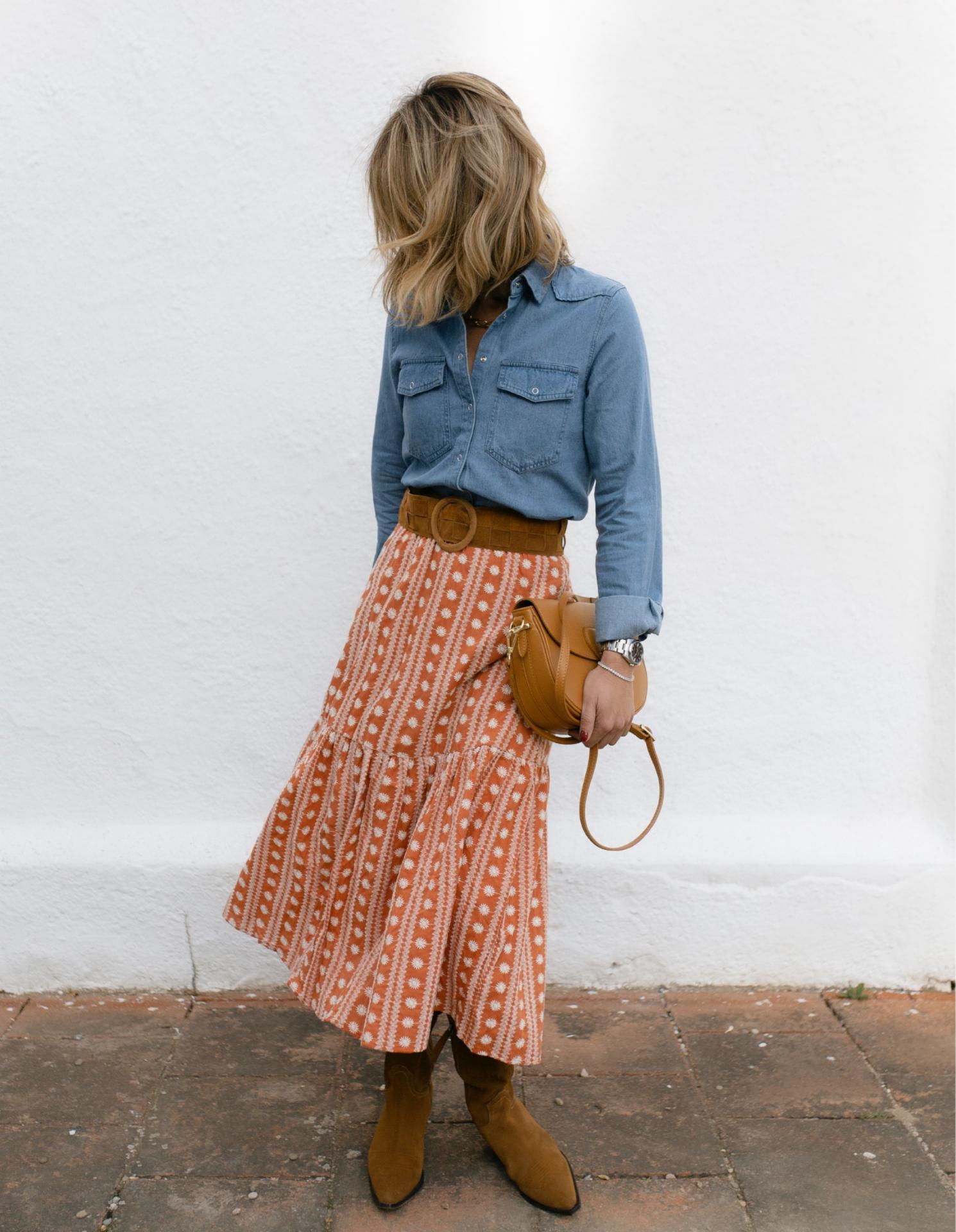 Falda de corte ligeramente acampanado y bordados en el tejido.