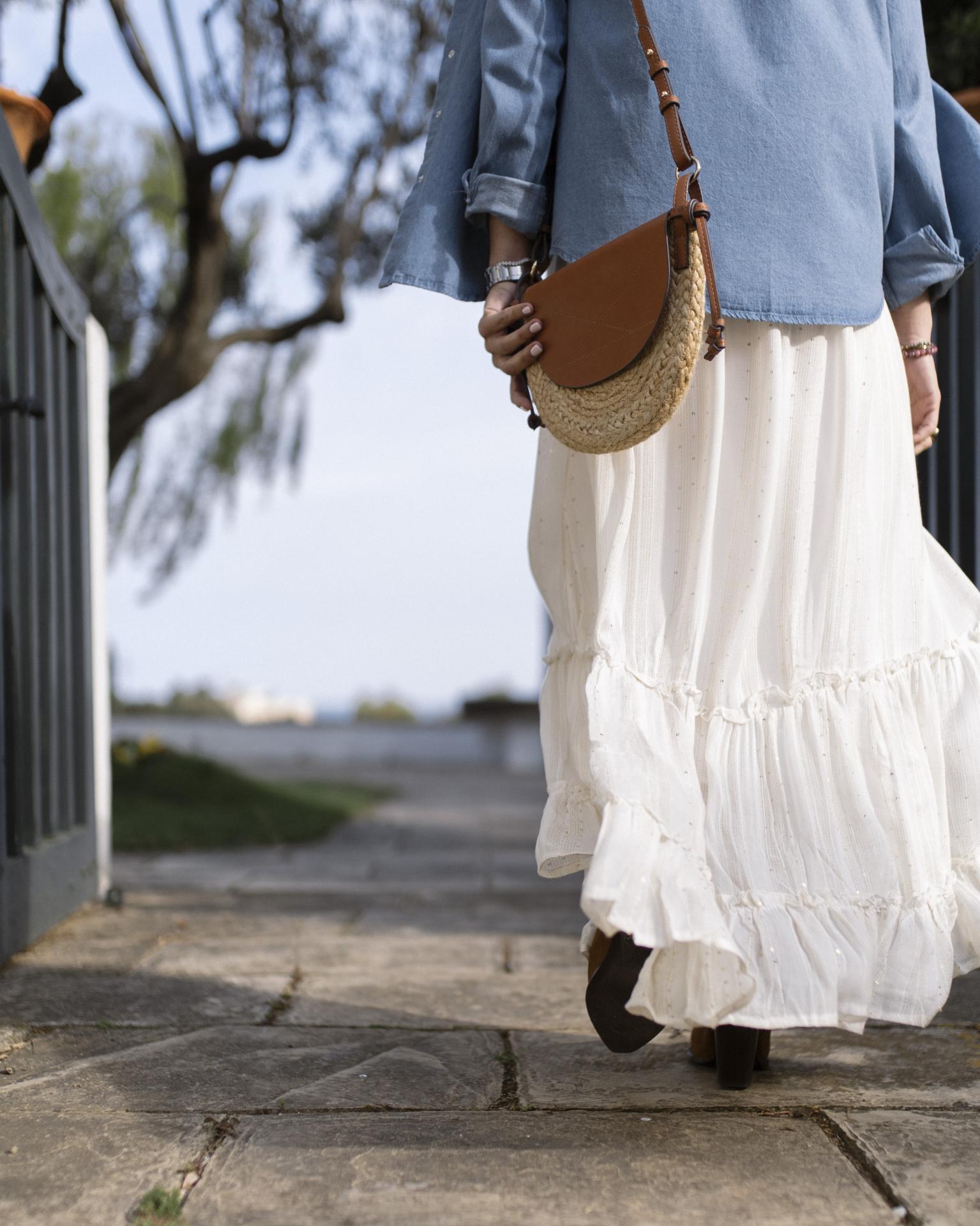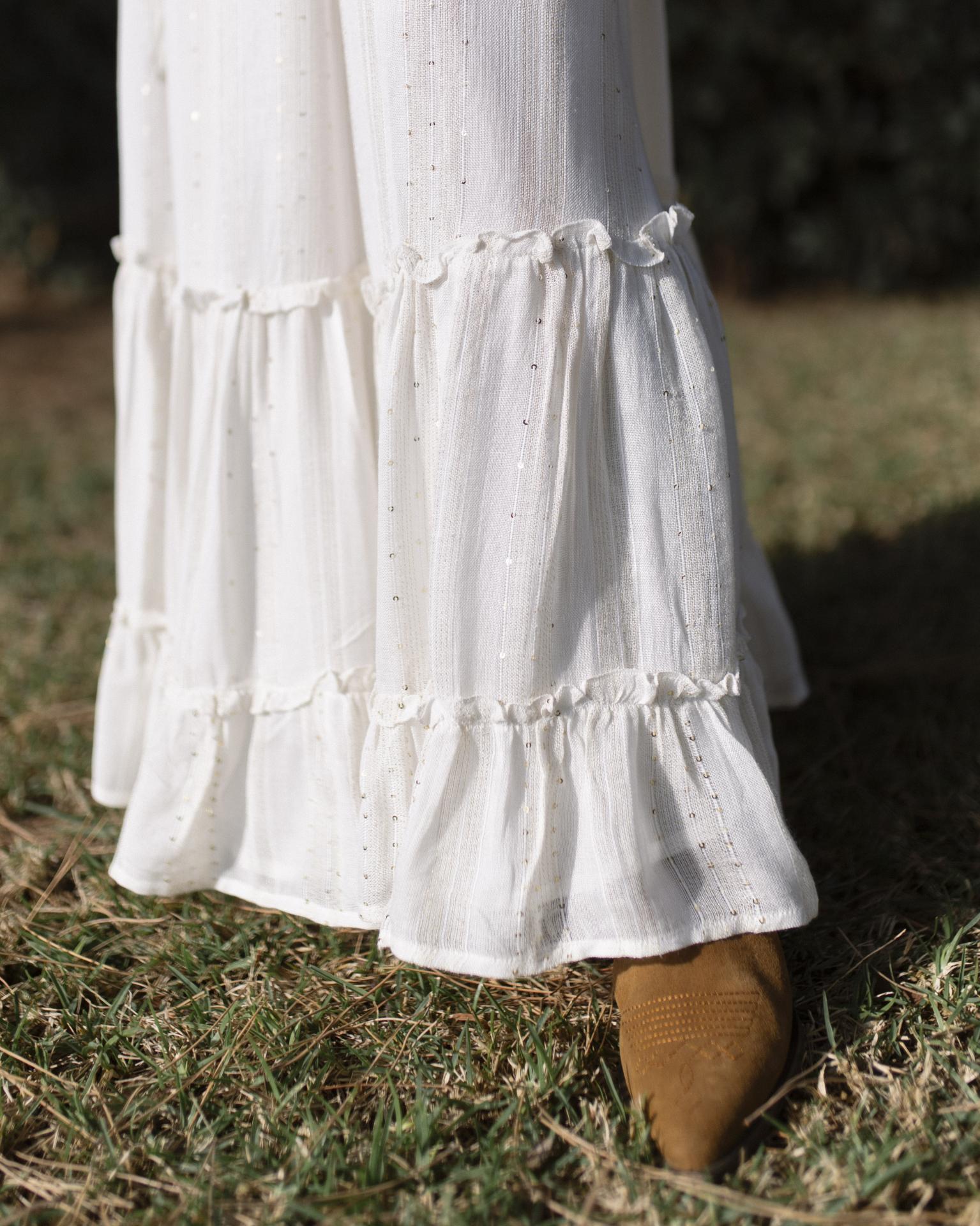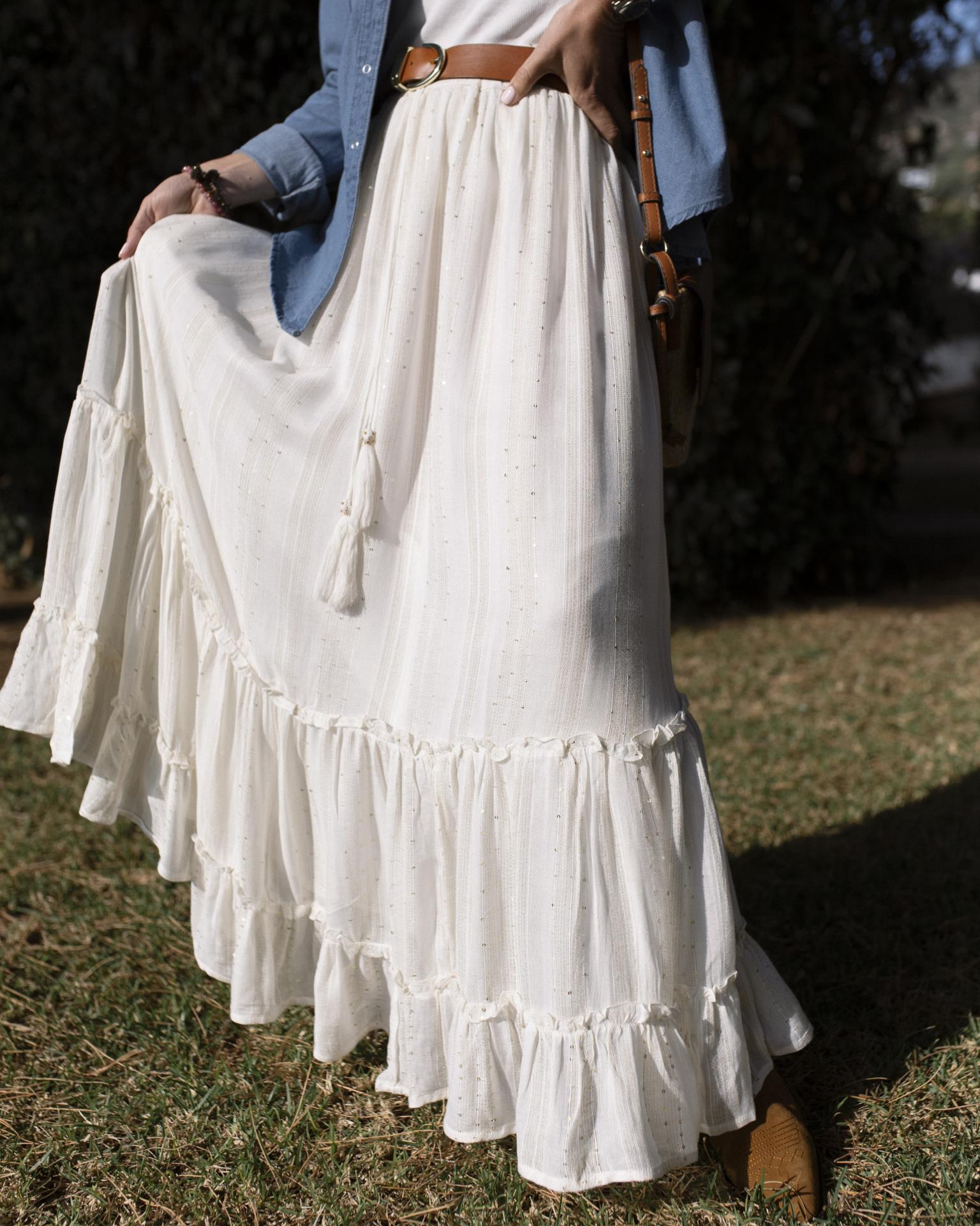 Falda larga con dos volantes producida con un tejido de fantasía con un detalle de lentejuela.