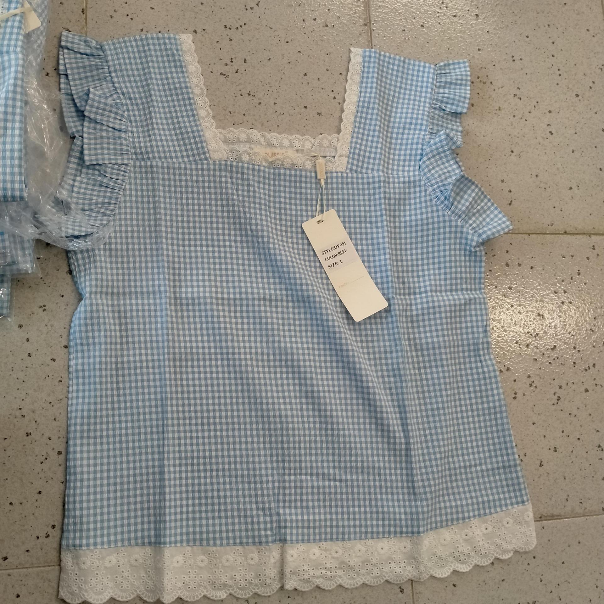 Blusa en tejido de cuadro vichy seersucher con escote cuadrado en delantero y espalda con detalle de puntilla alrededor y en el bajo. Manga a caja con volante. Corte recto.