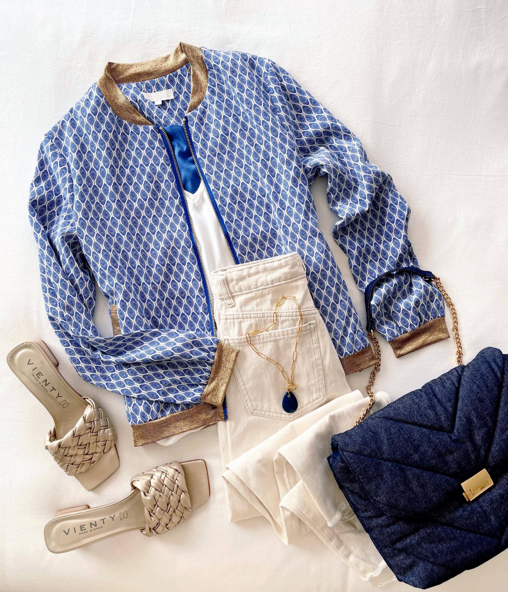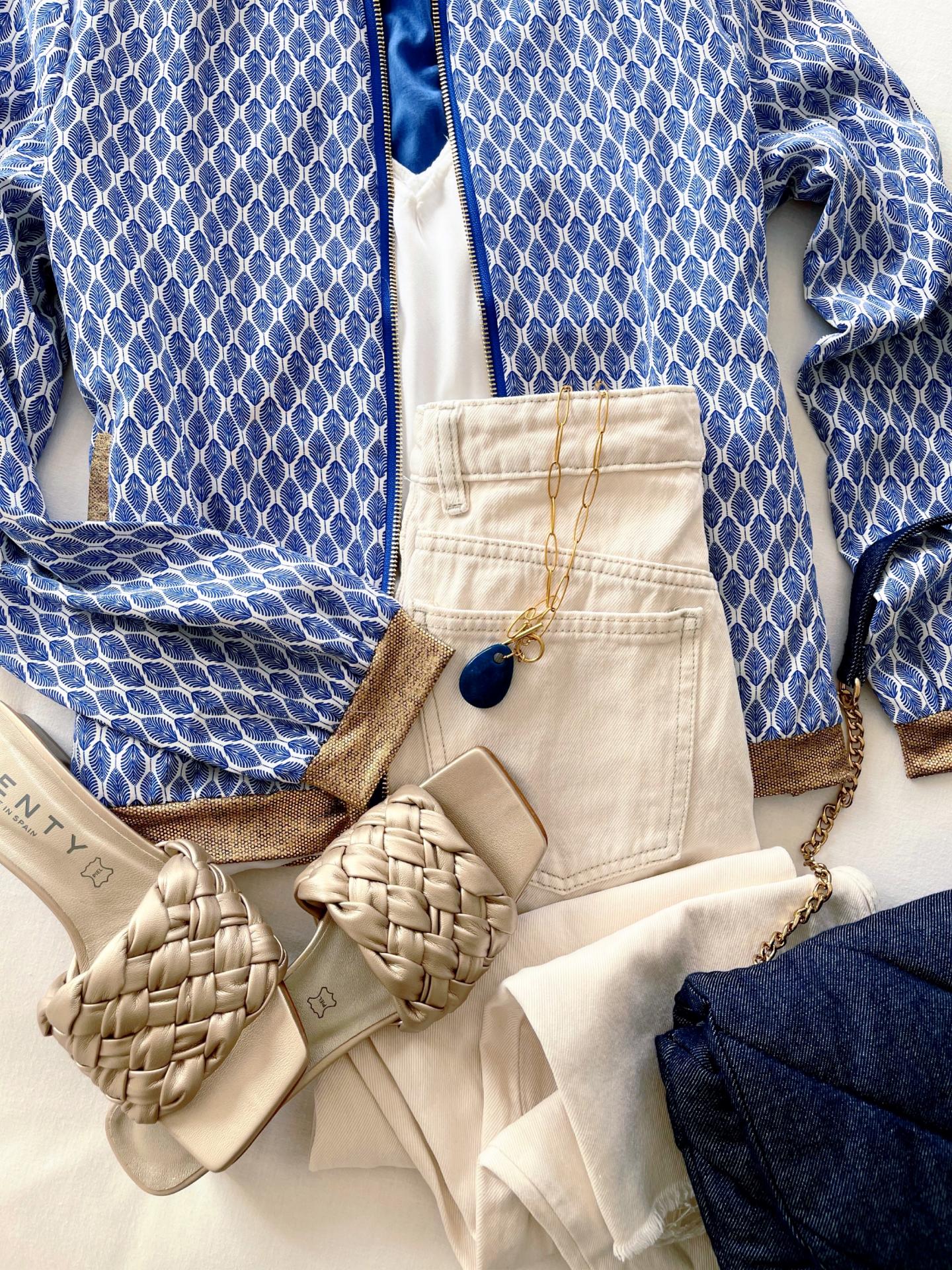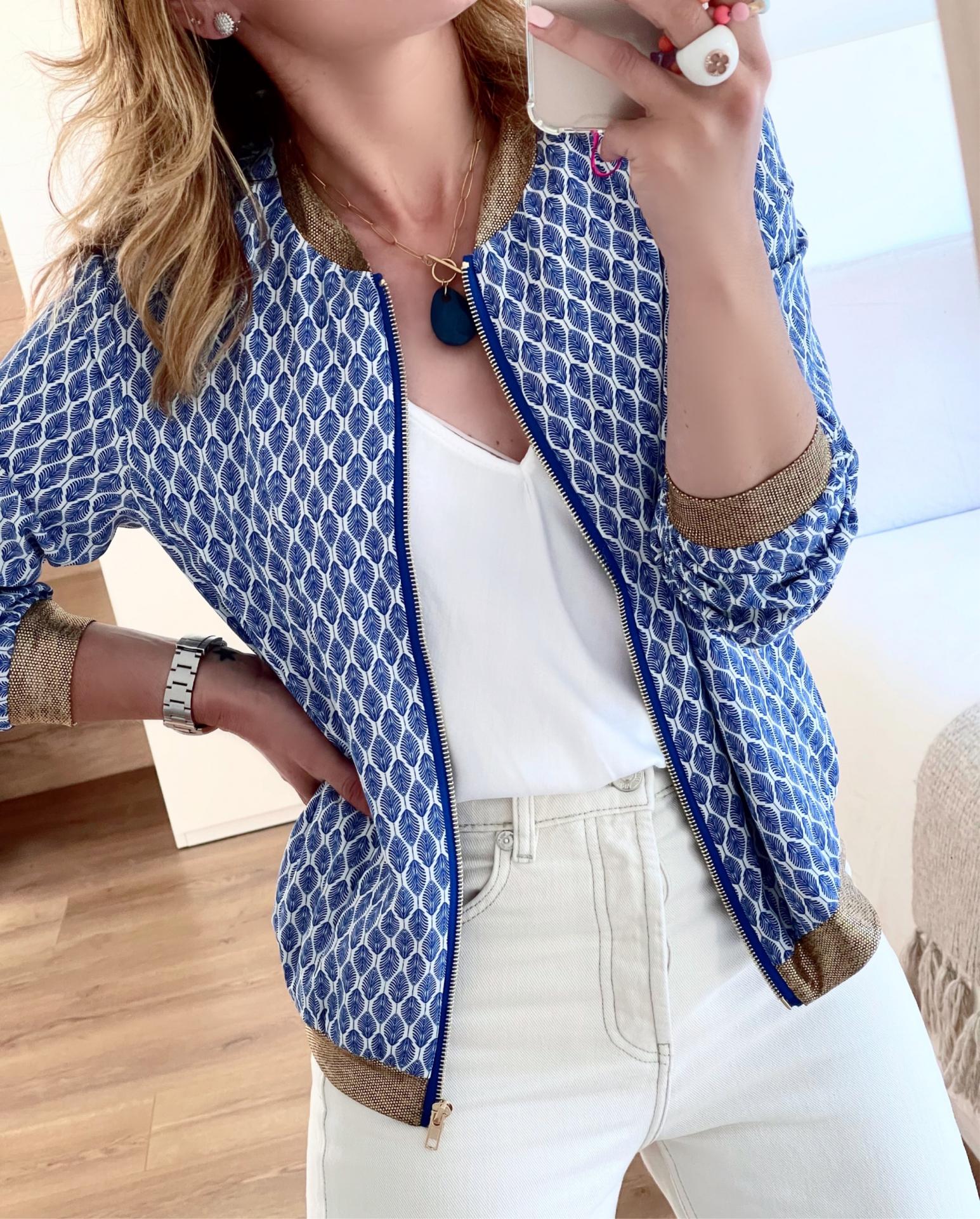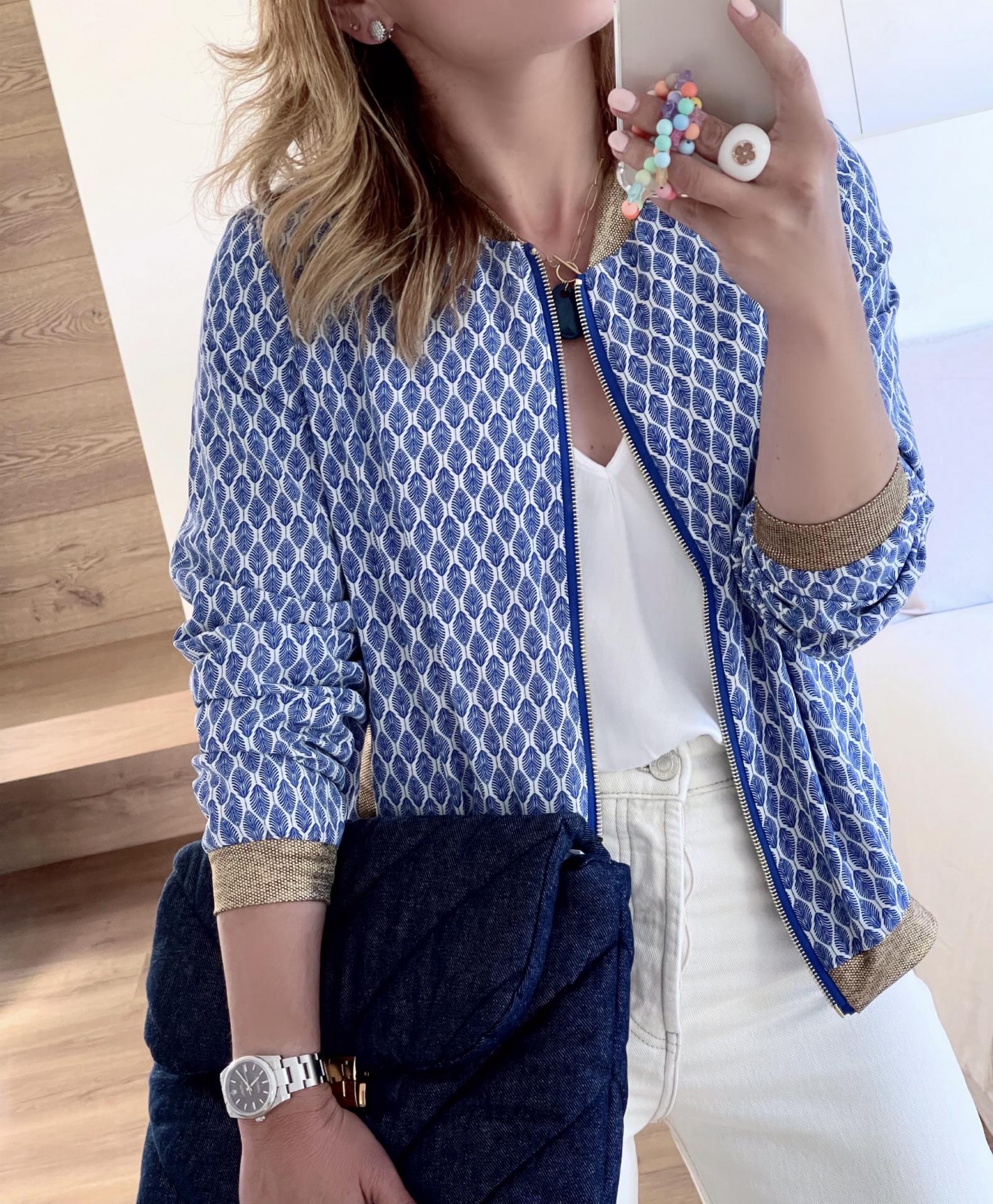 Nueva Bomber Zafir con pequeño motivo azul y detalles dorados en puño, cuello y mangas.