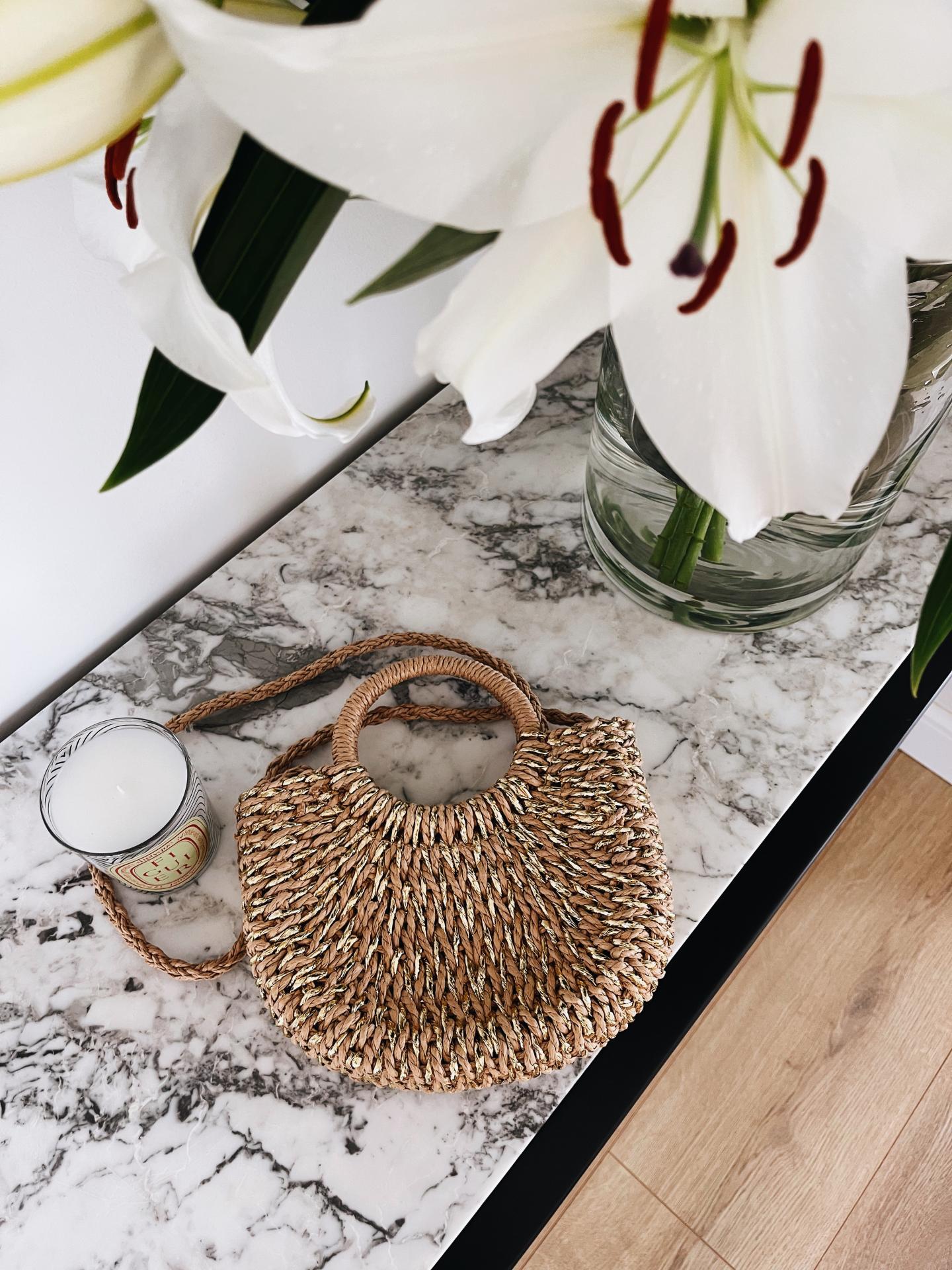 Bolso pequeño con asa redonda forrada de raffia y tira larga para poder llevarlo colgado como más te guste!