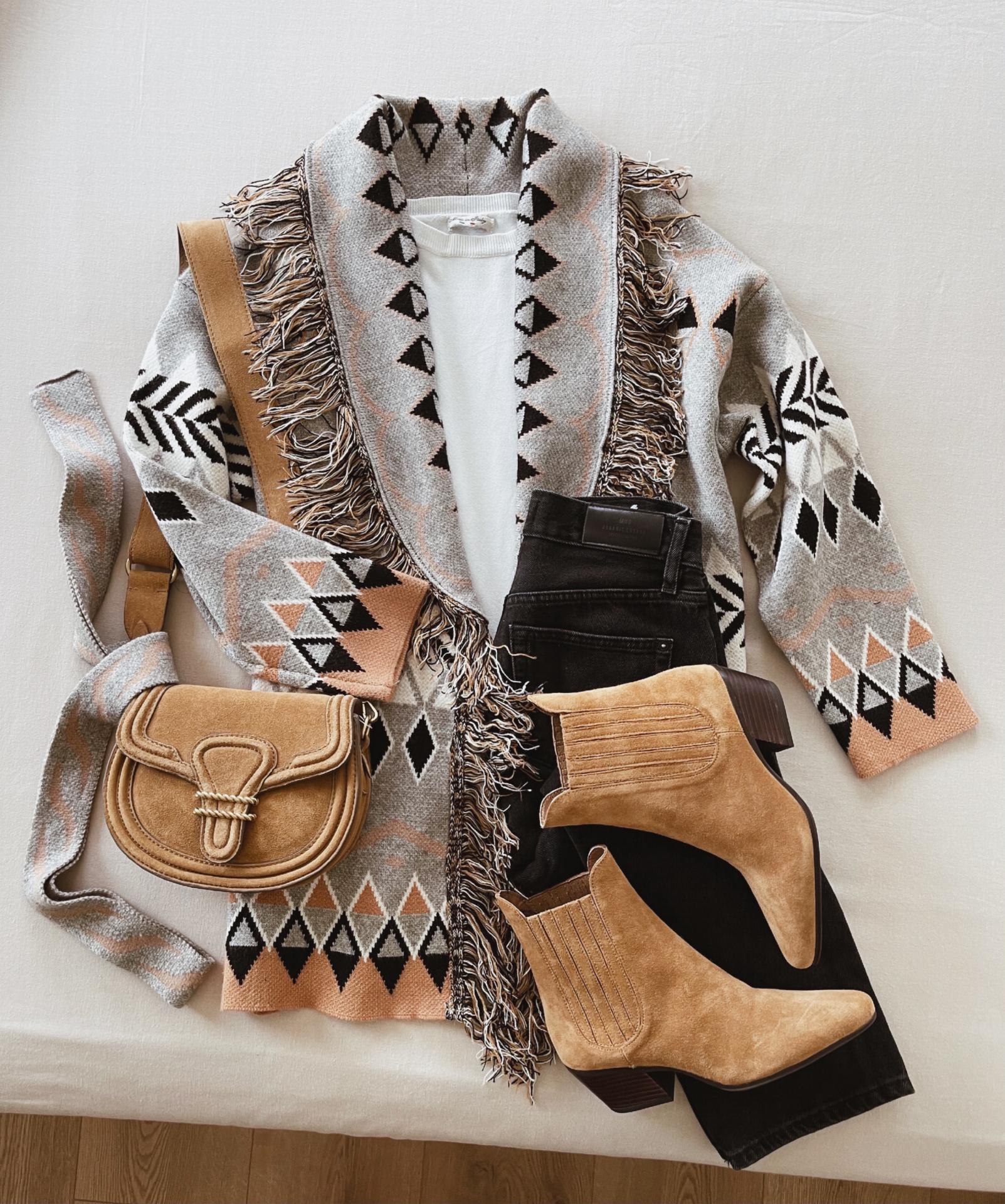 Chaqueta tipo cárdigan de punto abierta con motivos étnicos , cuello smoking y flecos alrededor y cinturón. Corte recto.