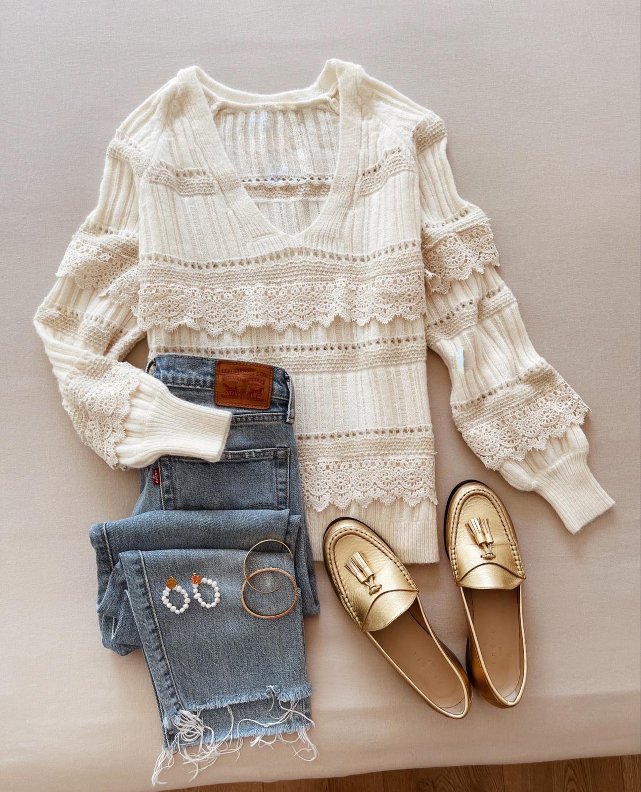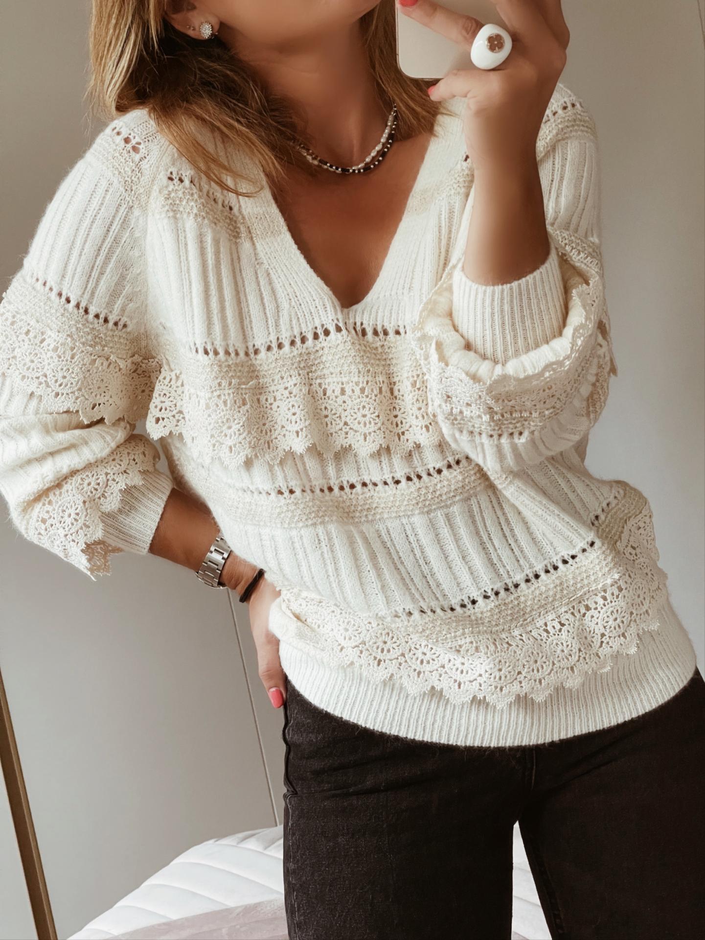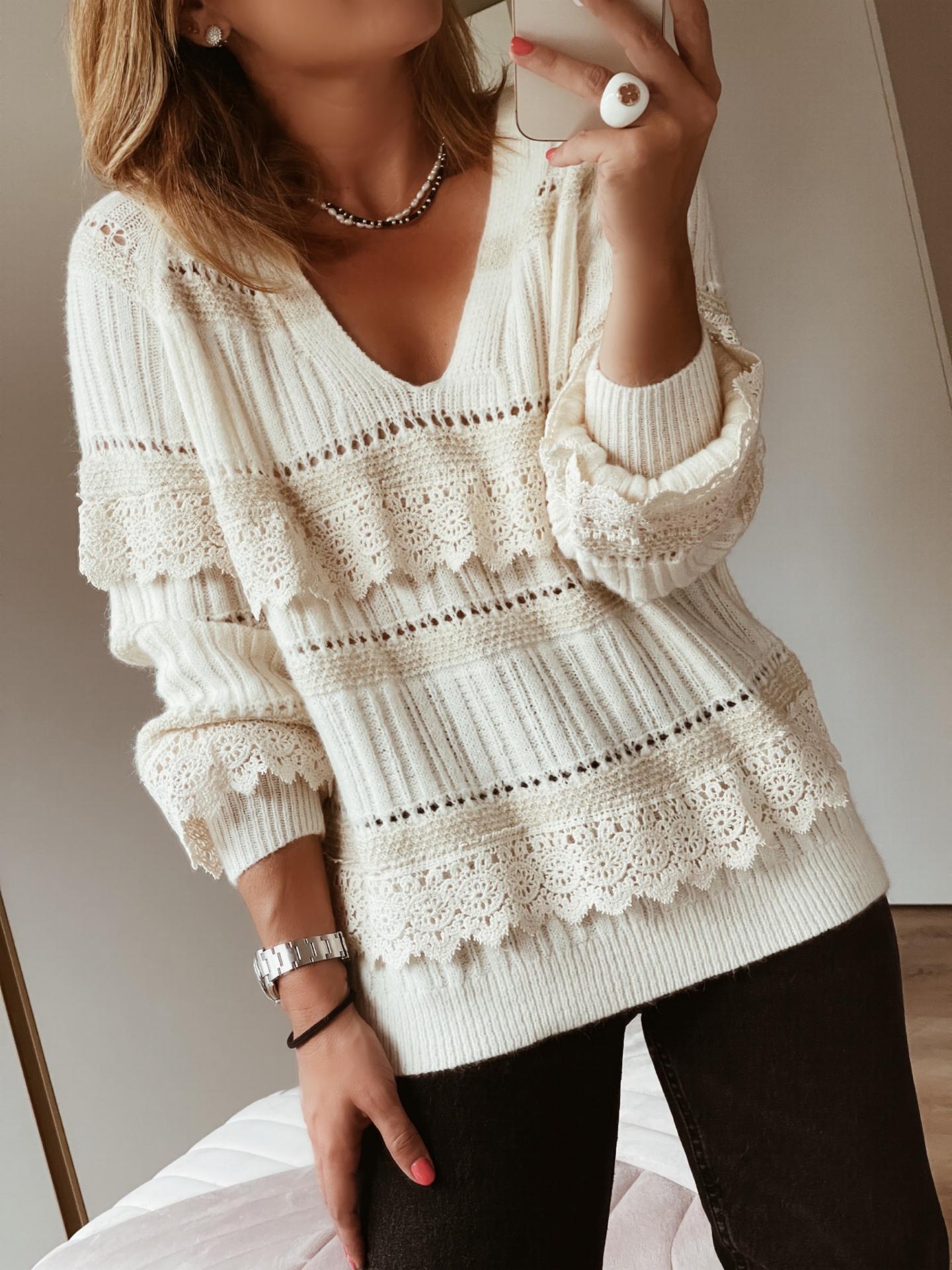Jersey de punto cuello pico con detalle de rayas con un sutil hilo en lamé oro y puntilla de guipure en delantero y mangas.