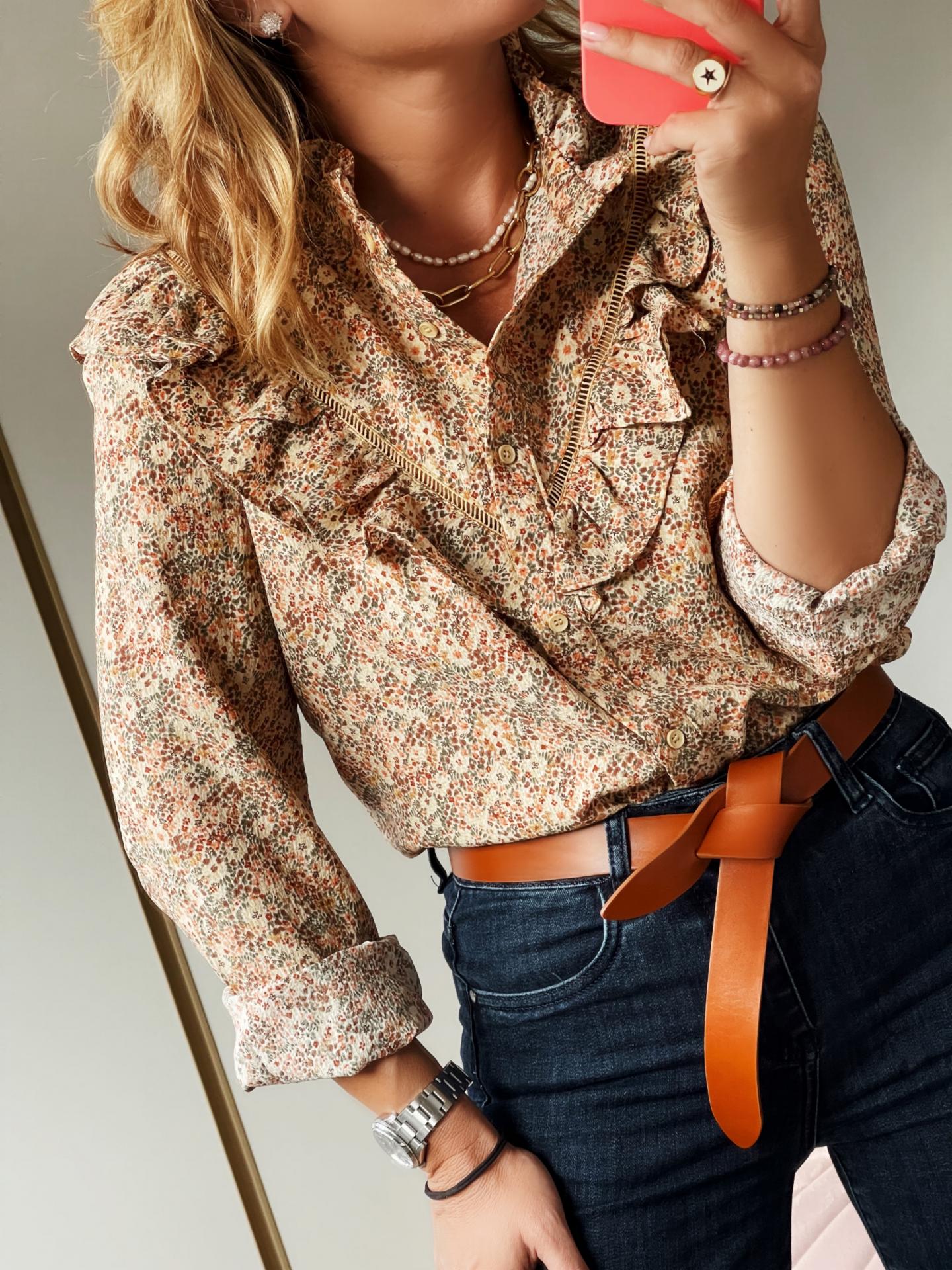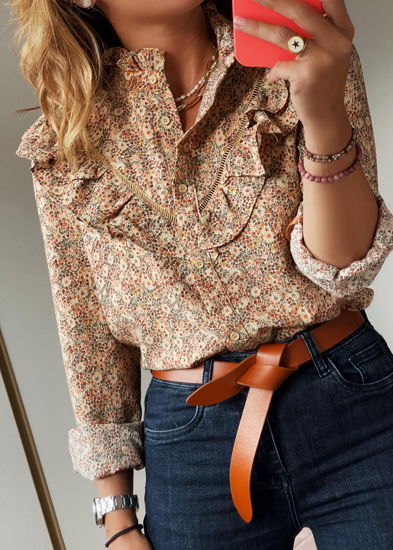 Nueva Blusa con caída con estampado de Flores y detalle de volantes en Cuello y escote.