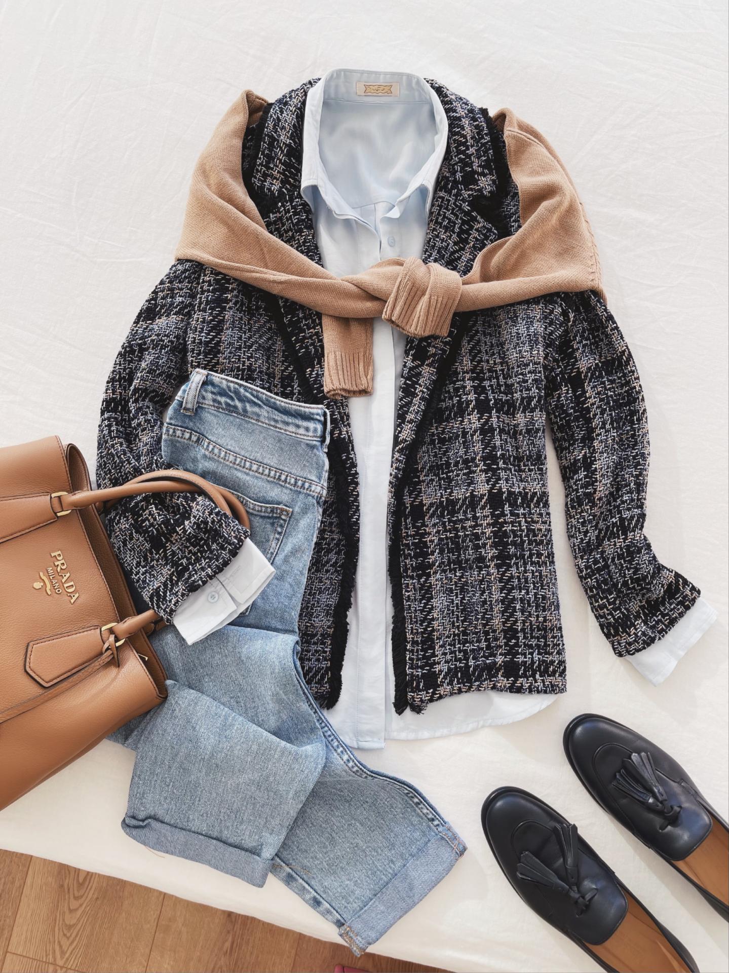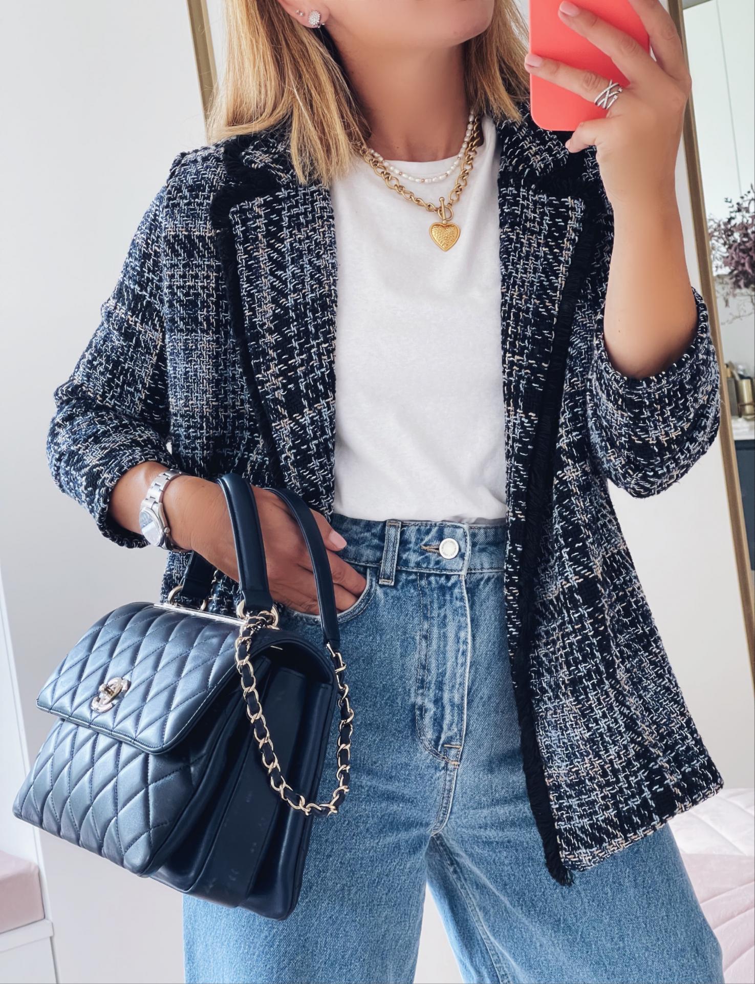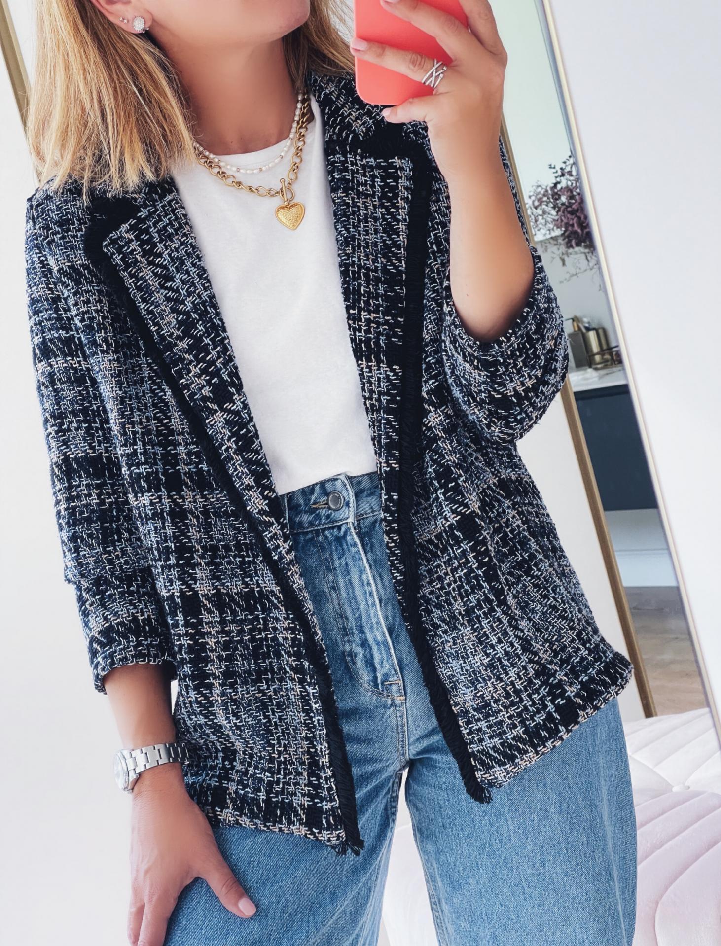 Nueva Chaqueta en Tweed de corte recto en tonos azul marino y camel.