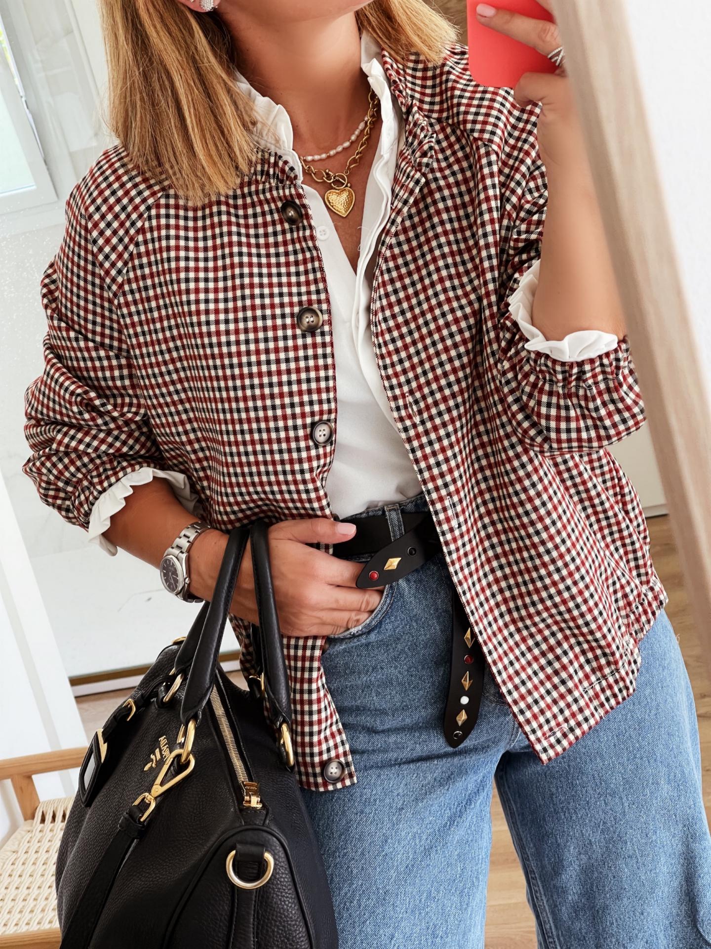 Nueva Bomber con cuadro escocés bolsillos laterales y cuello fruncido.