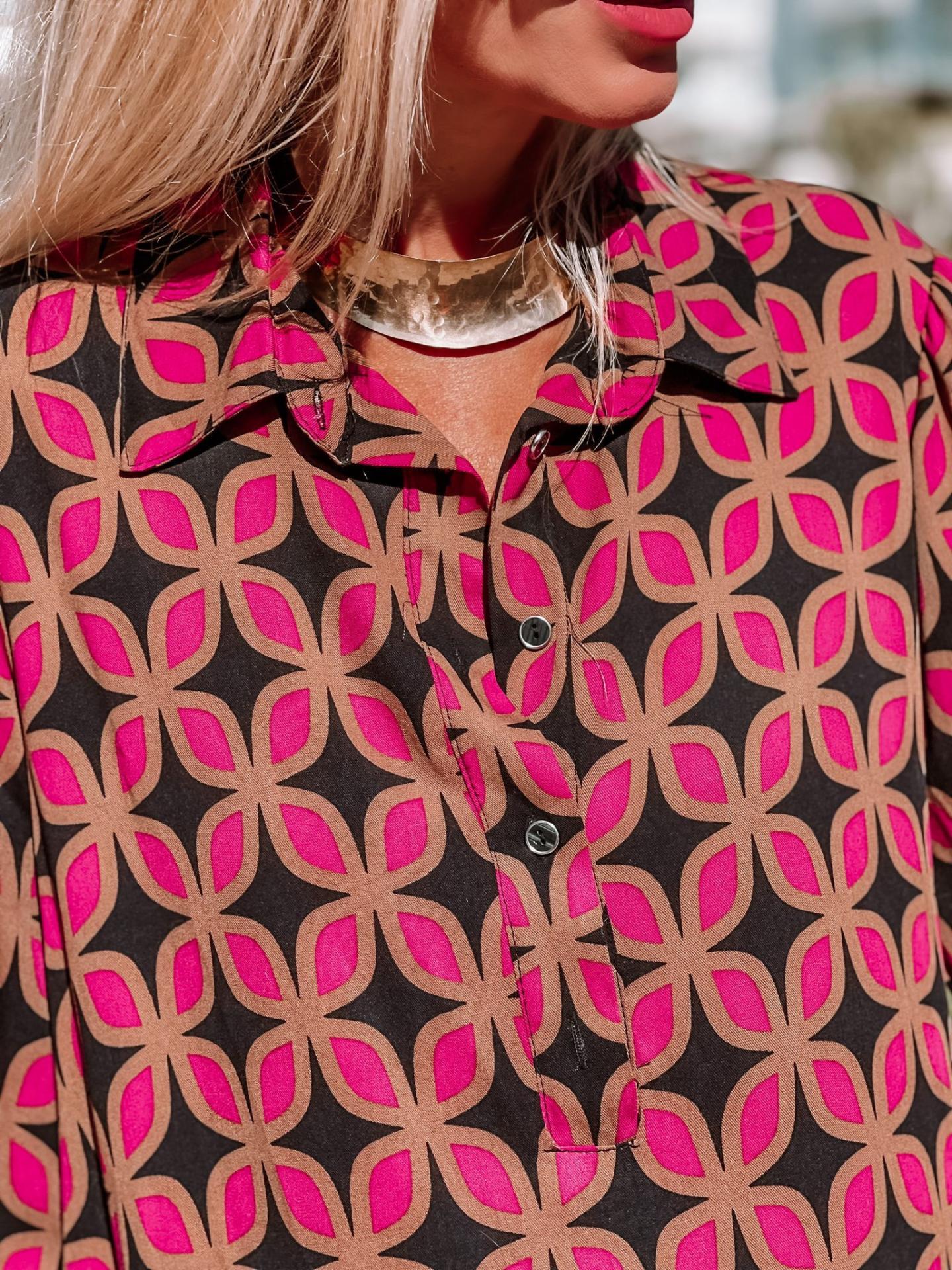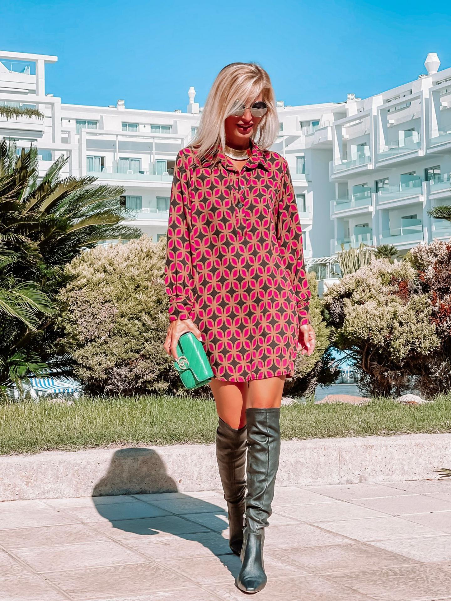 Vestido corto , cuello camisero , corte ligeramente acampanado.
