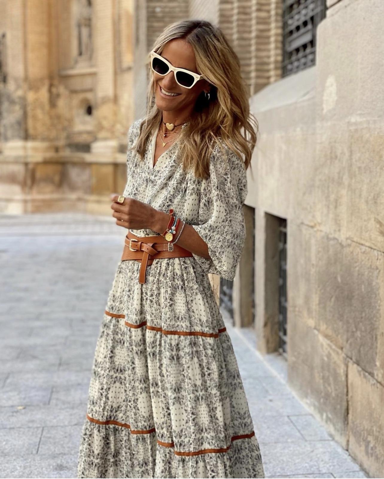 Vestido largo muy vaporoso, cortado en cintura con cordón del mismo tejido para poder fruncir.